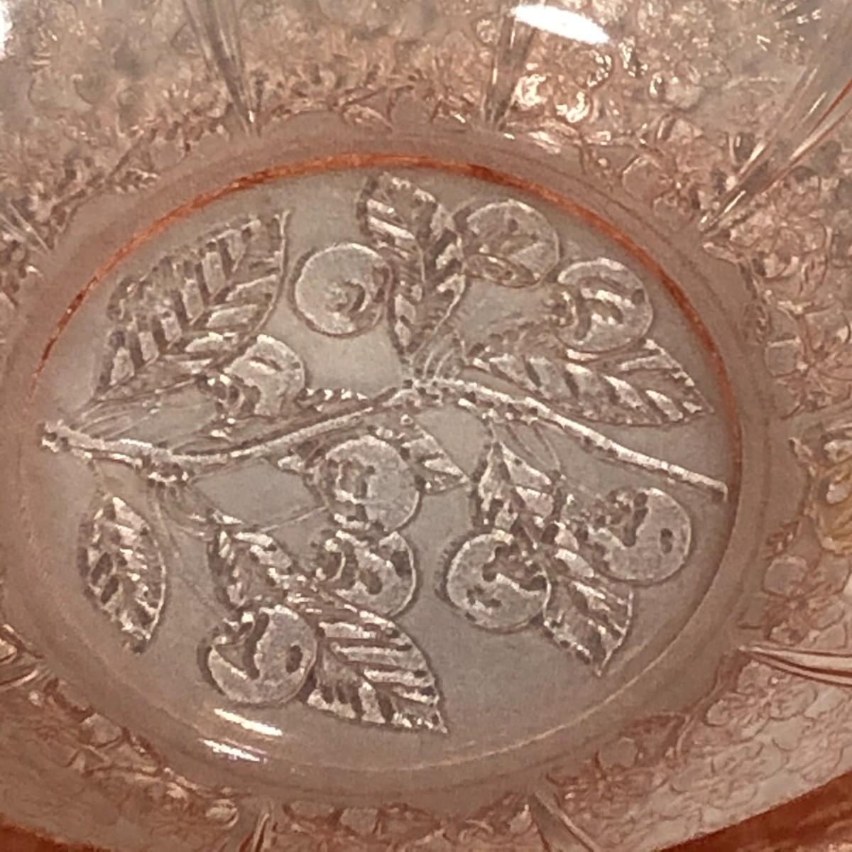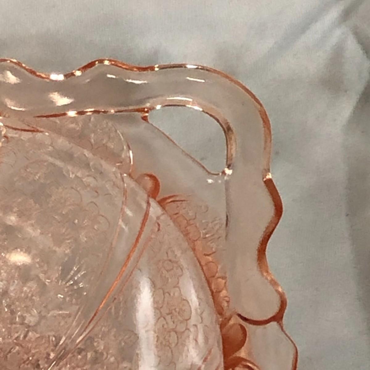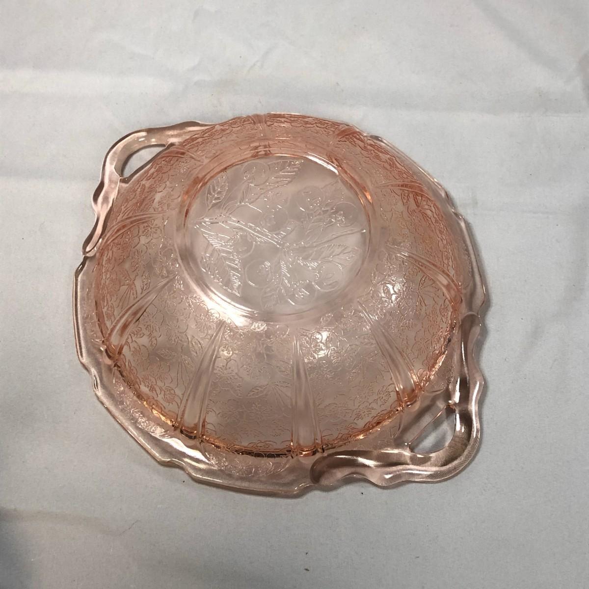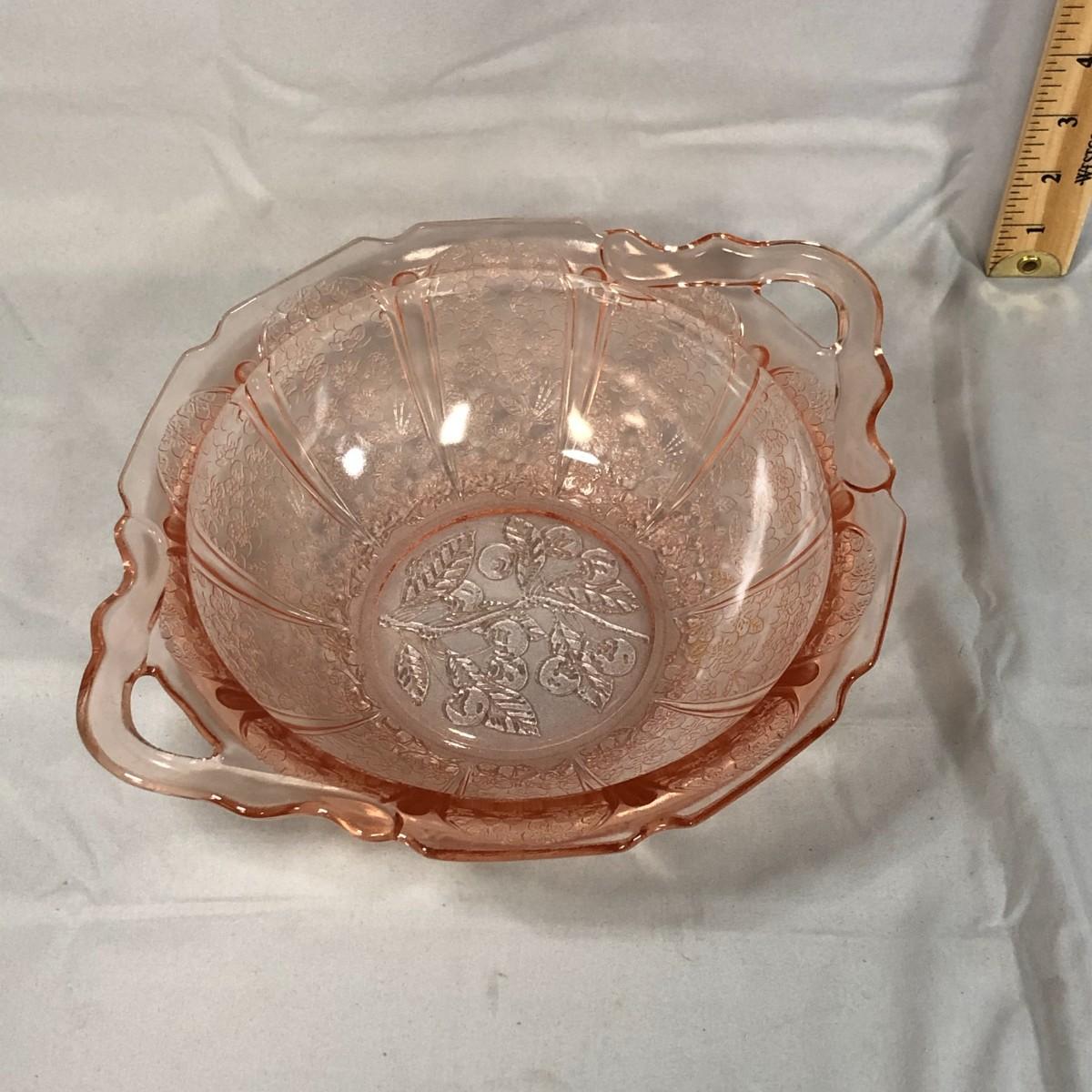This is a pretty bowl and in excellent condition, but it is not original Depression Glass - it is reproduction. From handle to handle is 10.75".