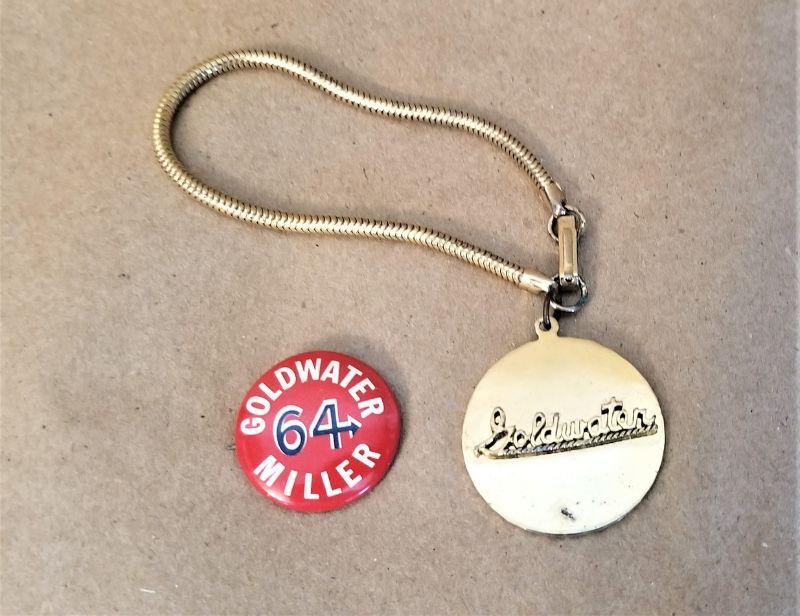Barry Goldwater Presidential bid items - a political button from '64 and a gold-tone bracelet with a charm that bears his name. Bracelet would fit a 7" wrist - disc measures about 1.25" high.