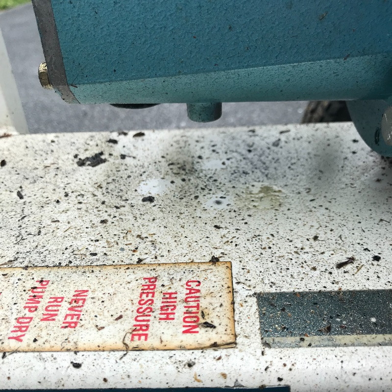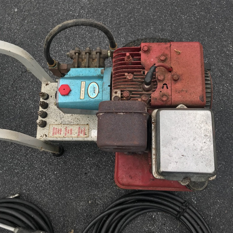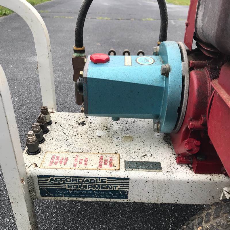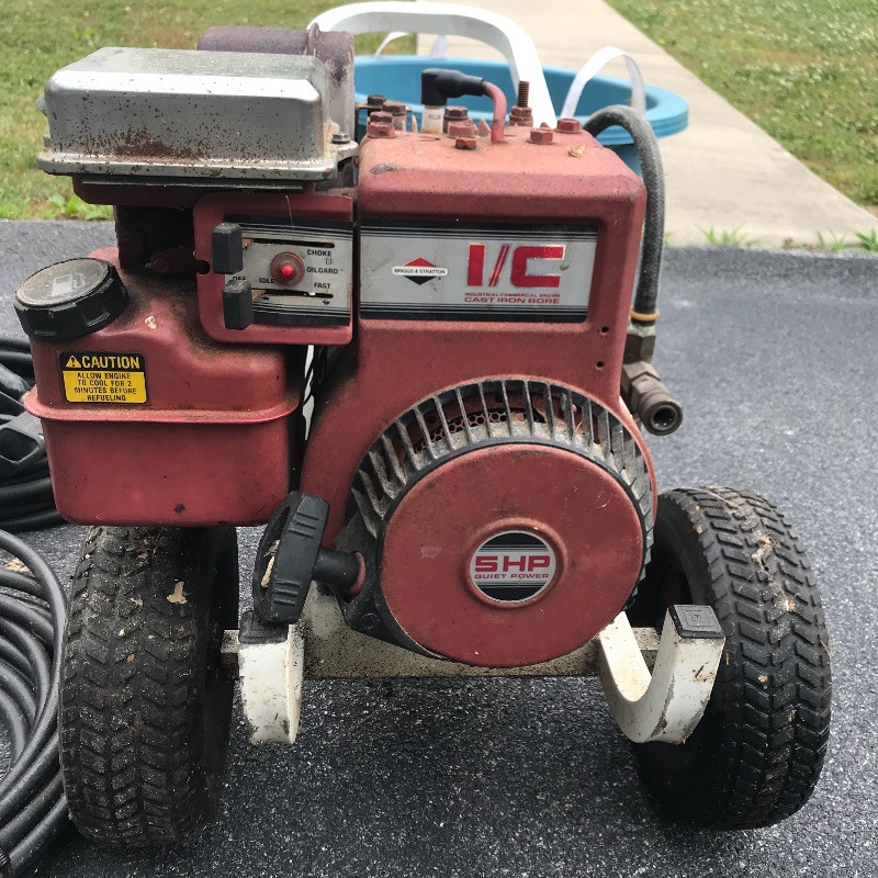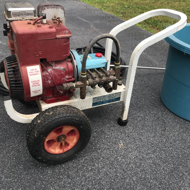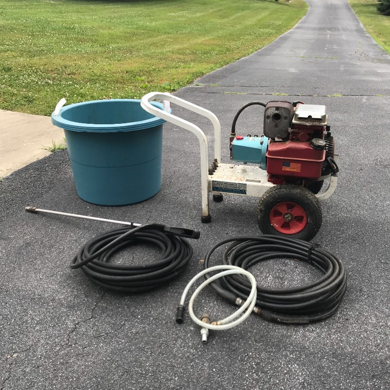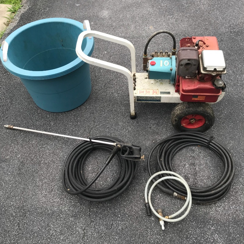 Gas powered Affordable Equipment quality pressure washer model SF30GH that comes with two hoses, nozzle and 20 gallon tub for hose storage. It is currently out of gas and working condition could not be tested. All the hoses appear to be in good condition. Oil-like droplet is noted under motor, see images. Wheels are made of hard plastic. Local Pickup Only.