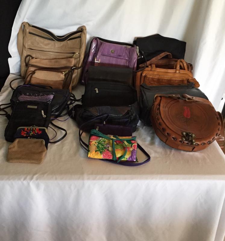 Large assortment of purses and wallets. Leather and cloth brands include Baggallini, The Leather Hand, and more. Local pickup only.