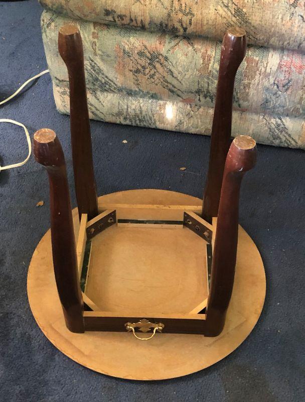 Press board with a faux drawer embellishment. The legs need to be tightened (they have screws). It is 20" tall and the top is 20.5" in diameter.