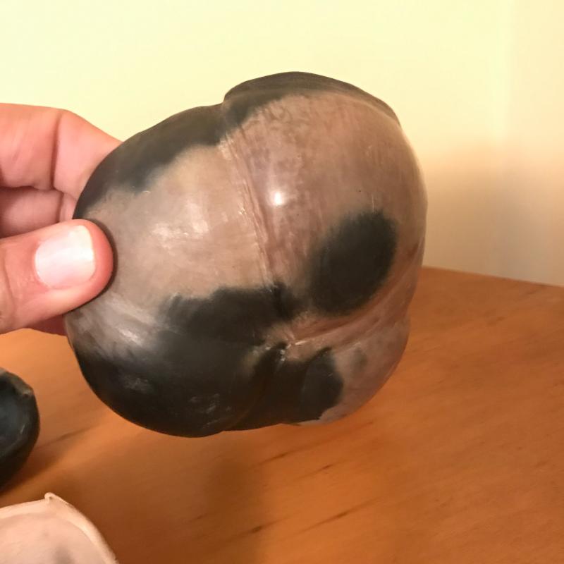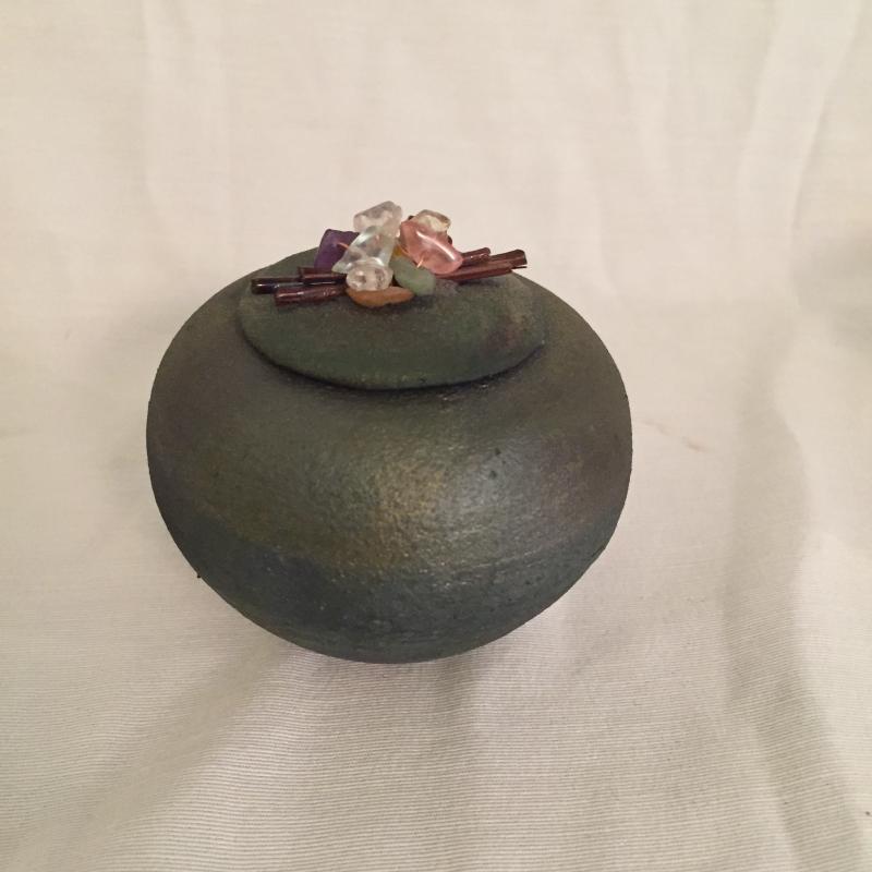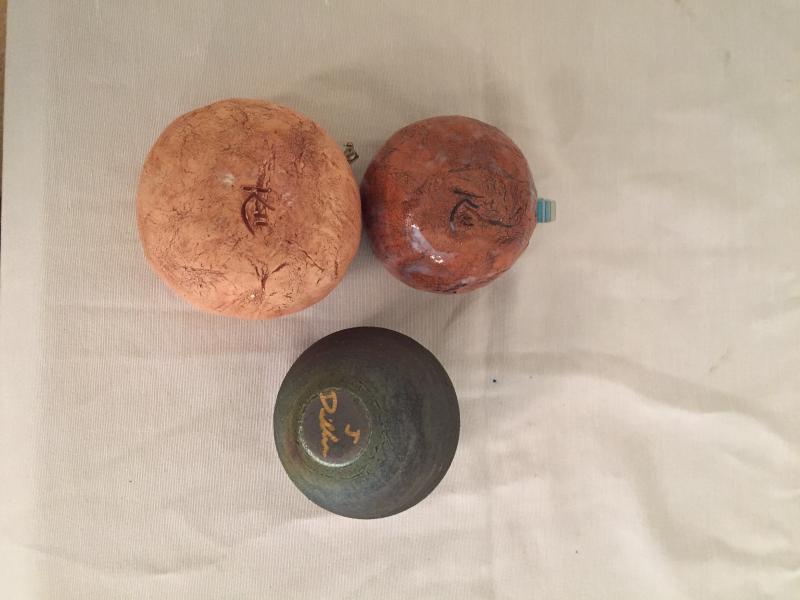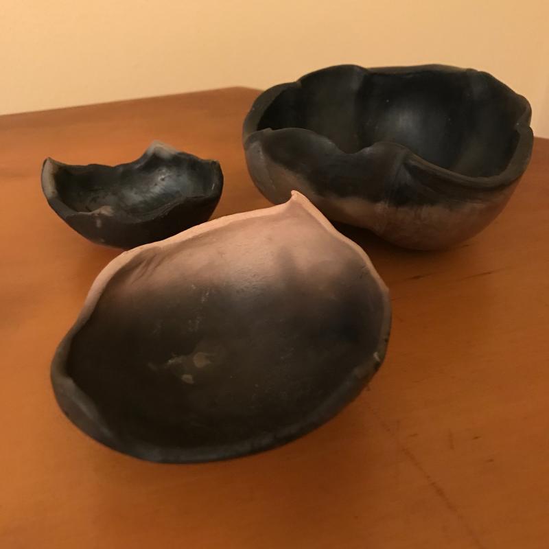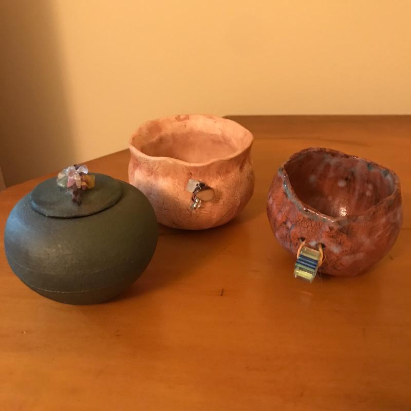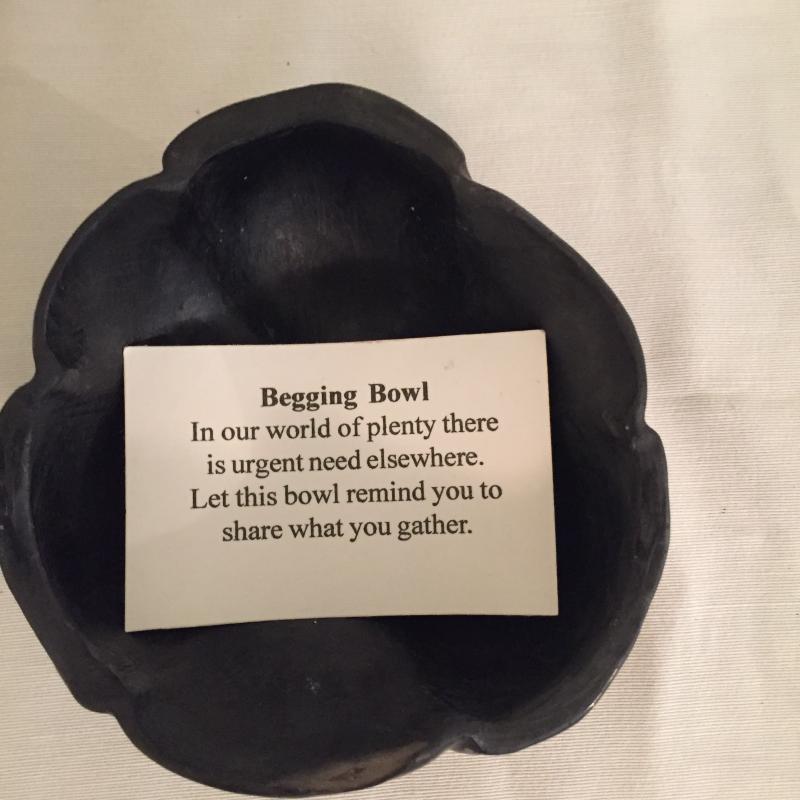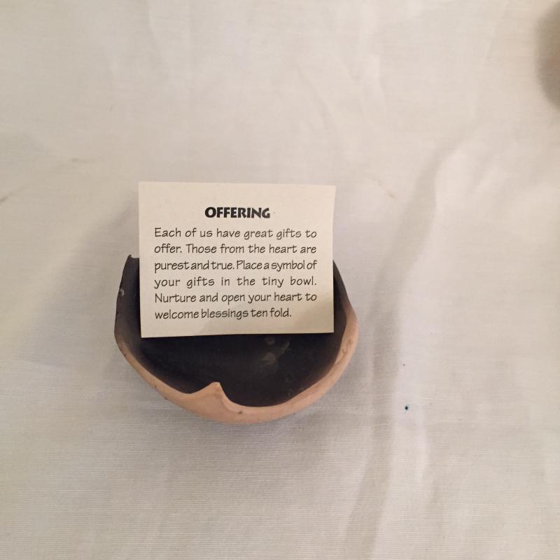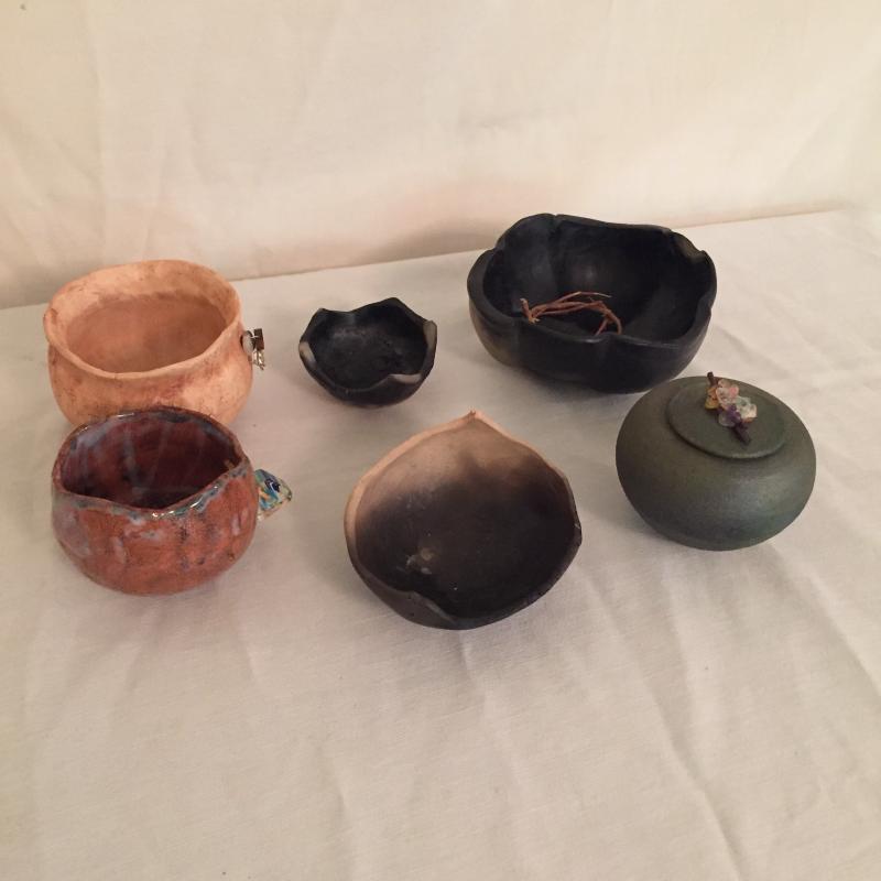 Six Small Bowls that inlude a Begging Bowl and Offering Bowl with printed messages. Three are ceramic andbgave beads attached. The other thr made of a variety of mediums. Largest Bowl Measures 4” Across 2” Tall. Shipping Available