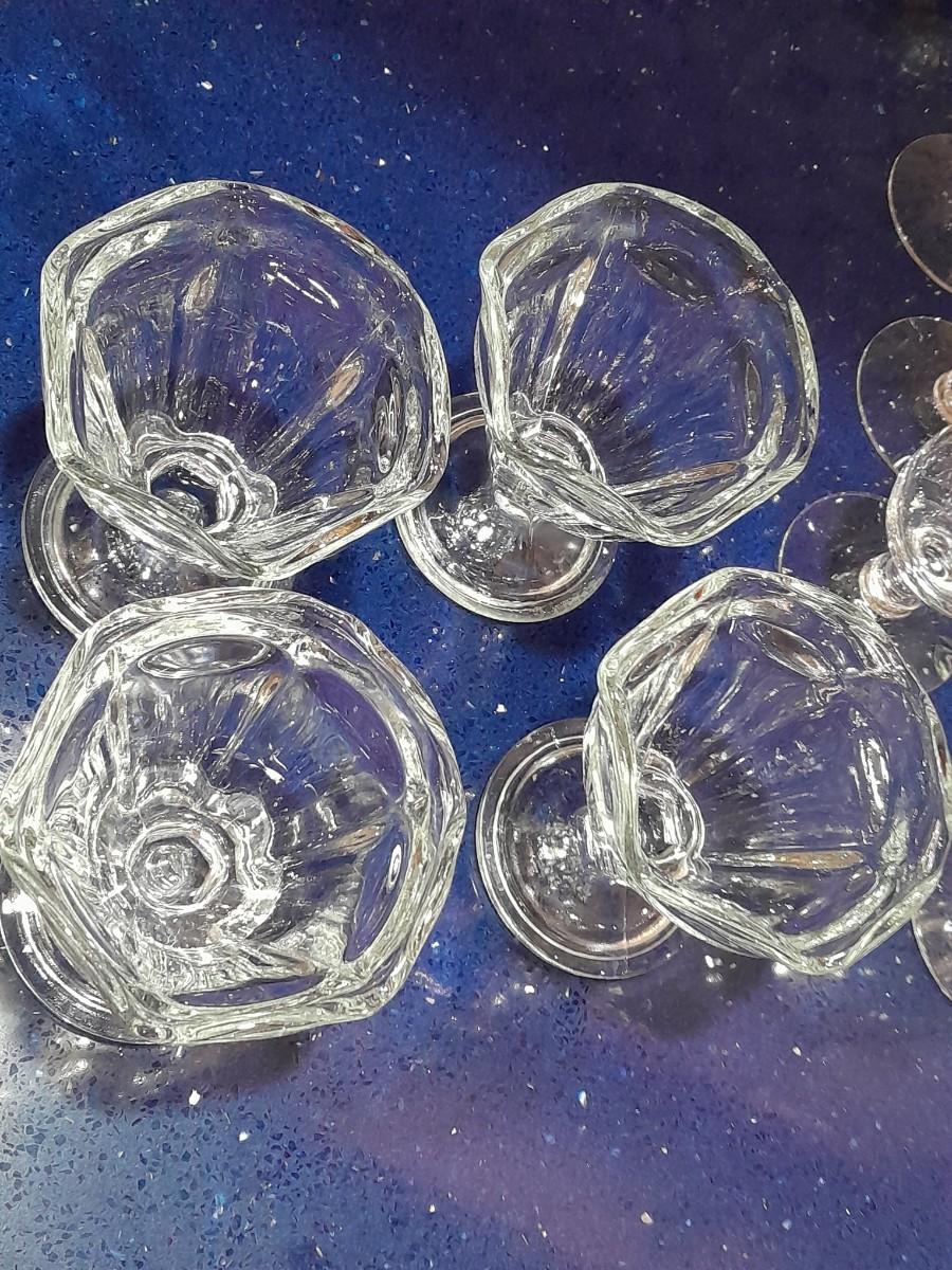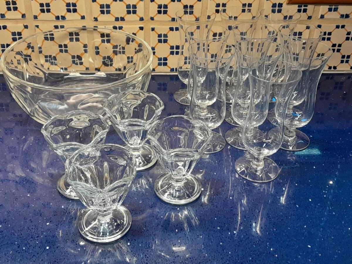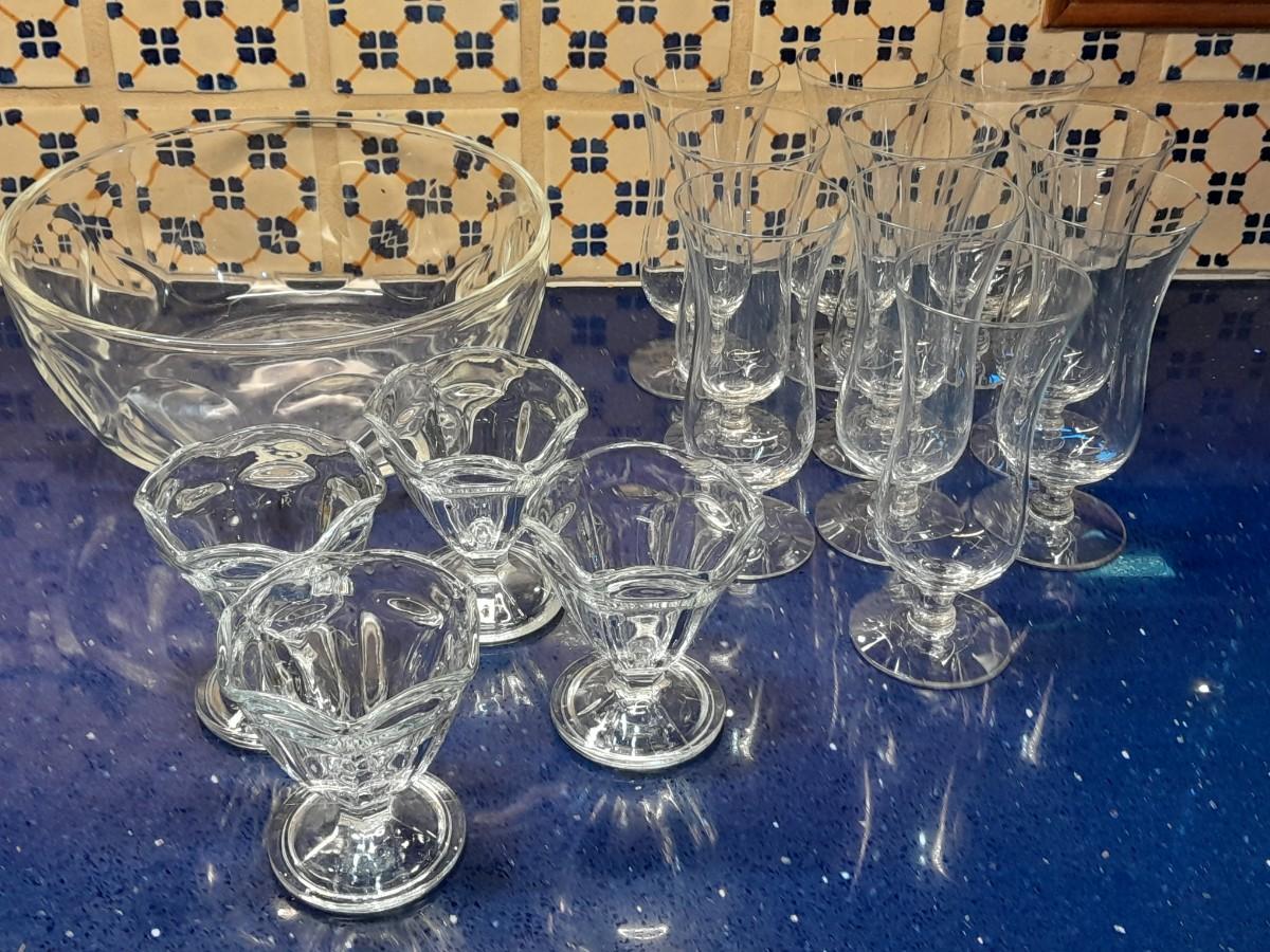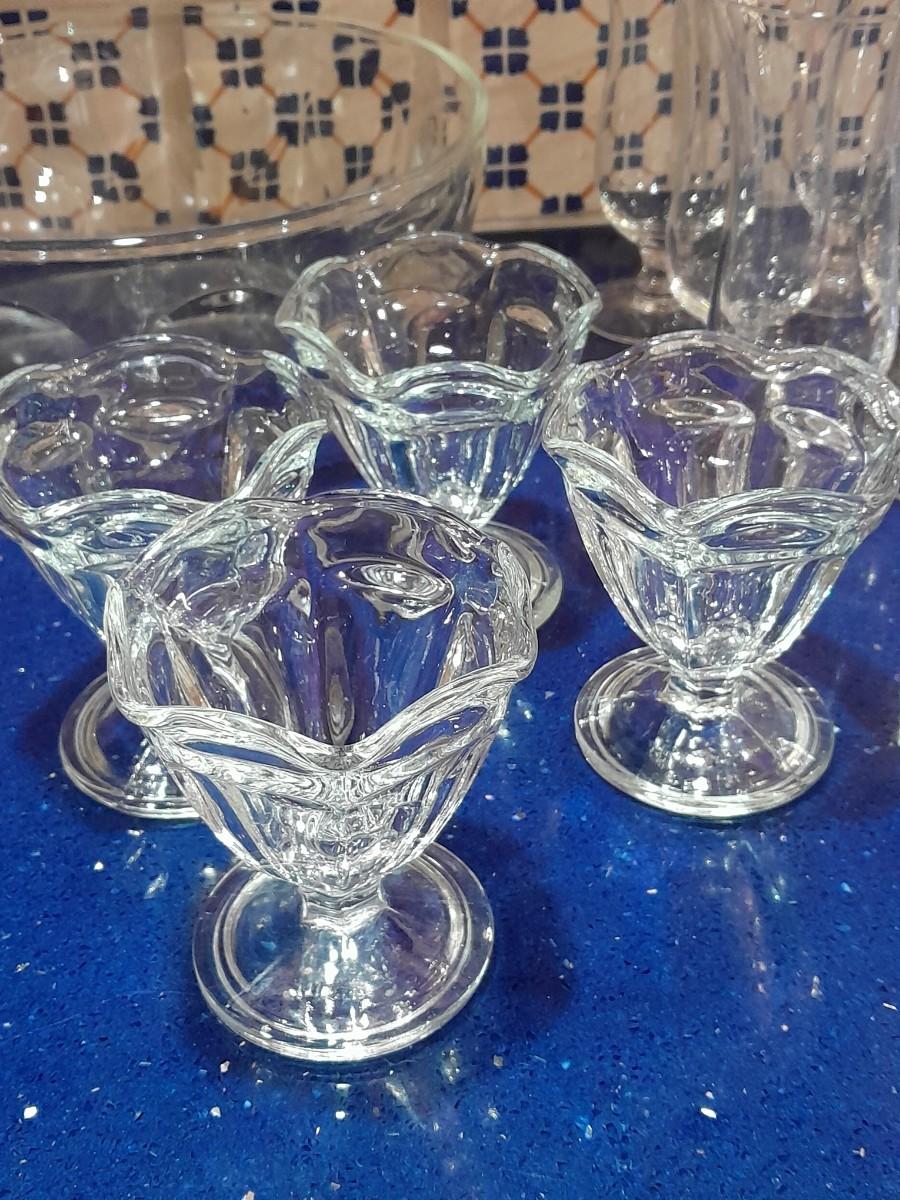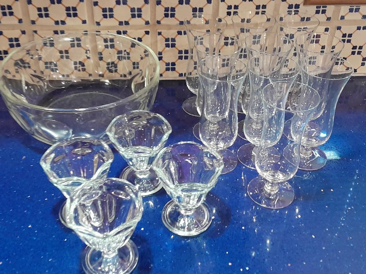 CLEAR GLASS STEMMED GLASSES, LARGE GLASS BOWL AND FOUR CUSTARD GLASSES