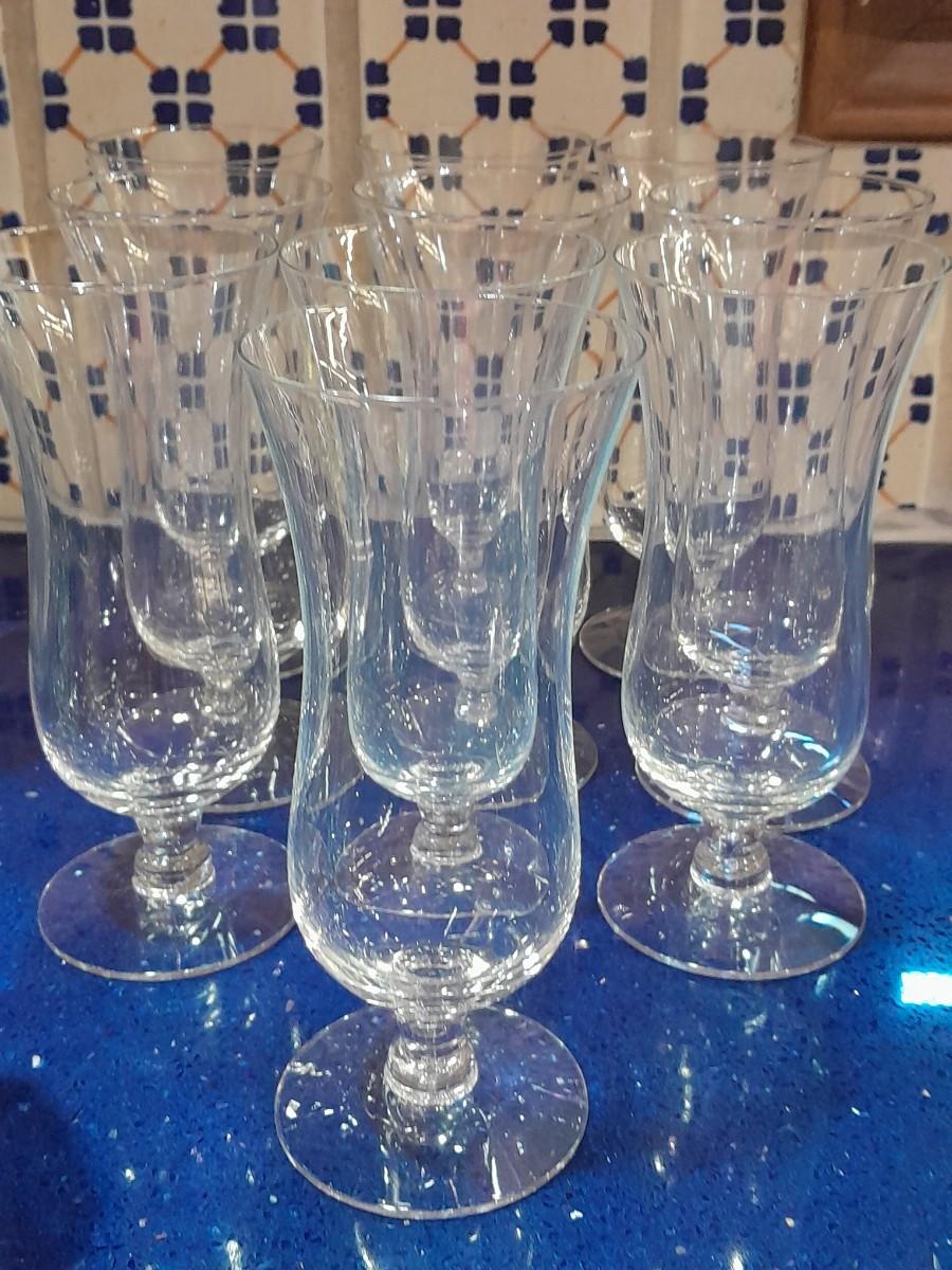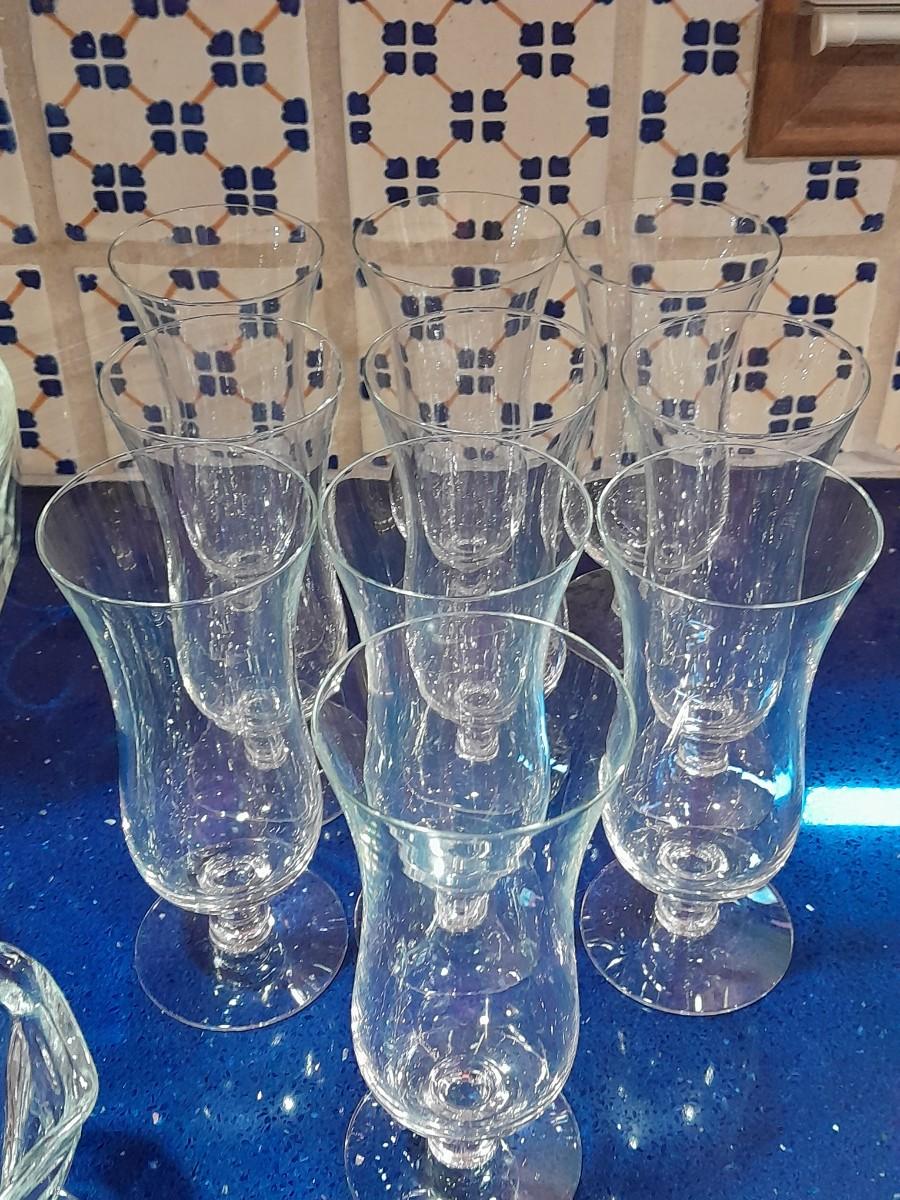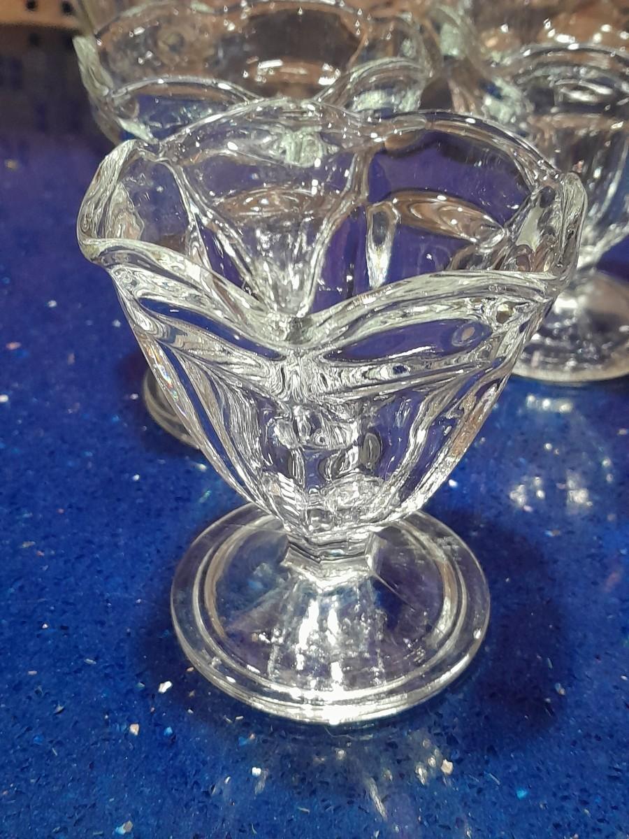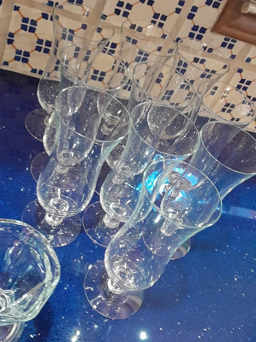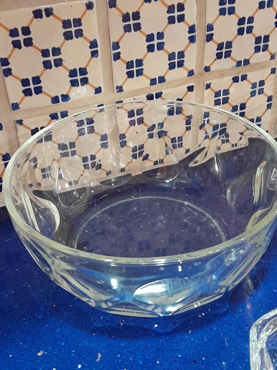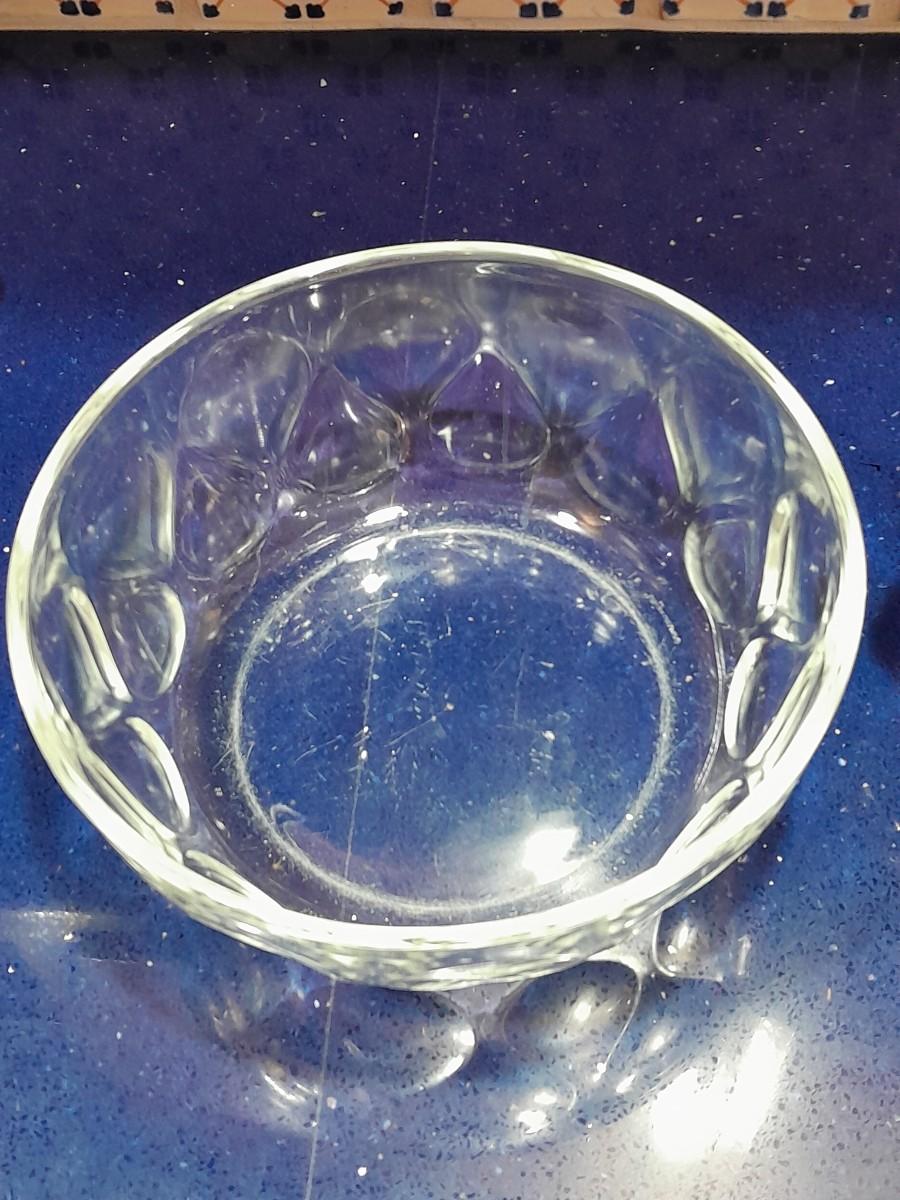 CLEAR GLASS STEMMED GLASSES, LARGE GLASS BOWL AND FOUR CUSTARD GLASSES