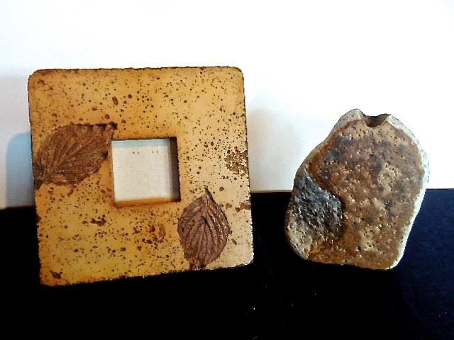 Two complemtary items. A stoneware square picture frame 8" x 8" with easel back and a natural drilled smooth stone vase for dried flowers or buds.