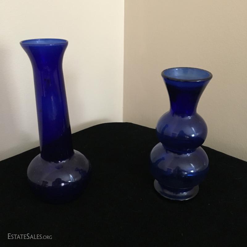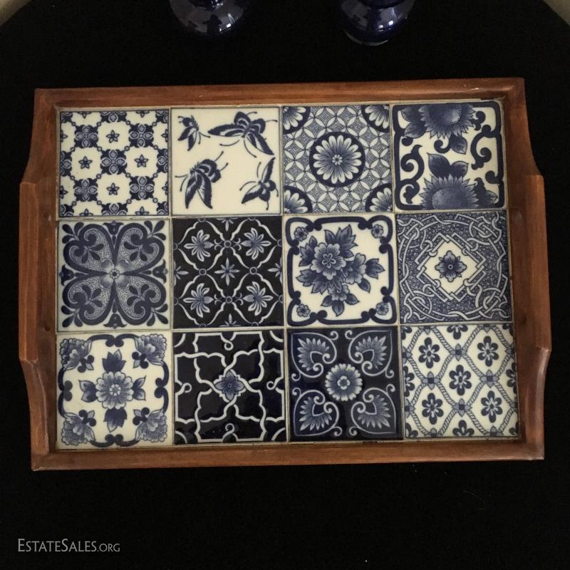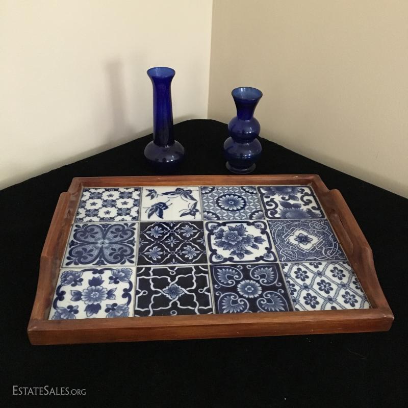 Bombay blue and white tiled wood serving tray measures 17.5 x 13.5". Two small blue glass vases, tallest stands 7.5" tall. This lot is available for local pick up in Mills River, NC only.