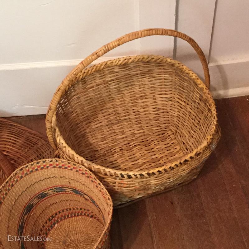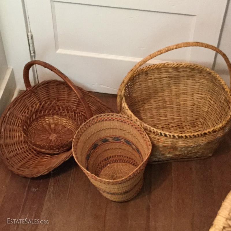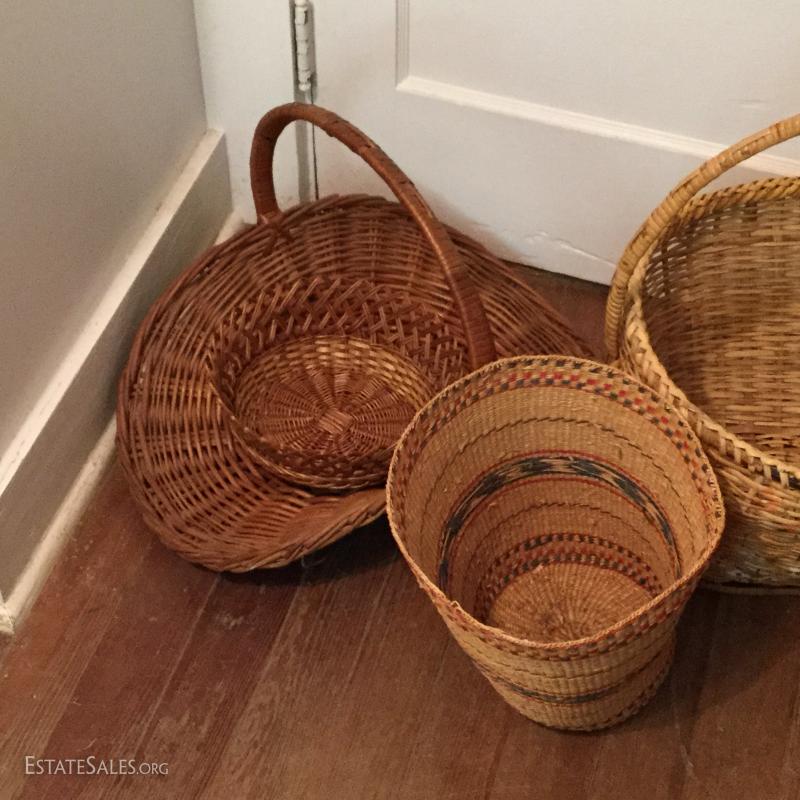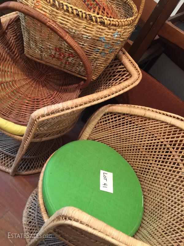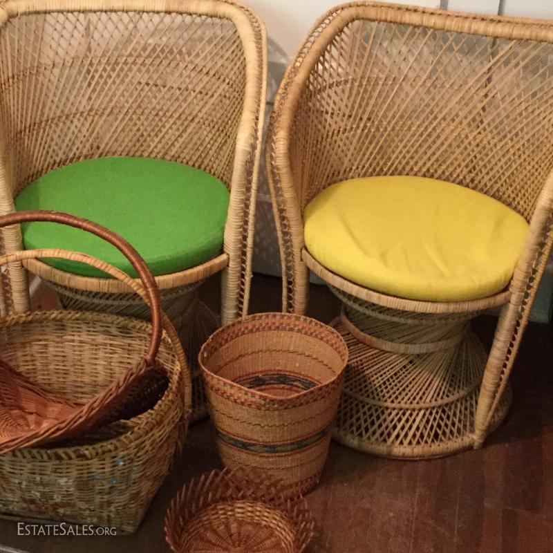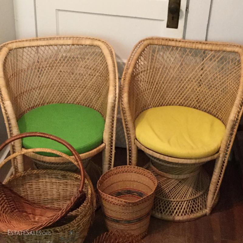 Two Mid-Century Modern chairs with cushions. Sturdy. Also includes misc baskets.