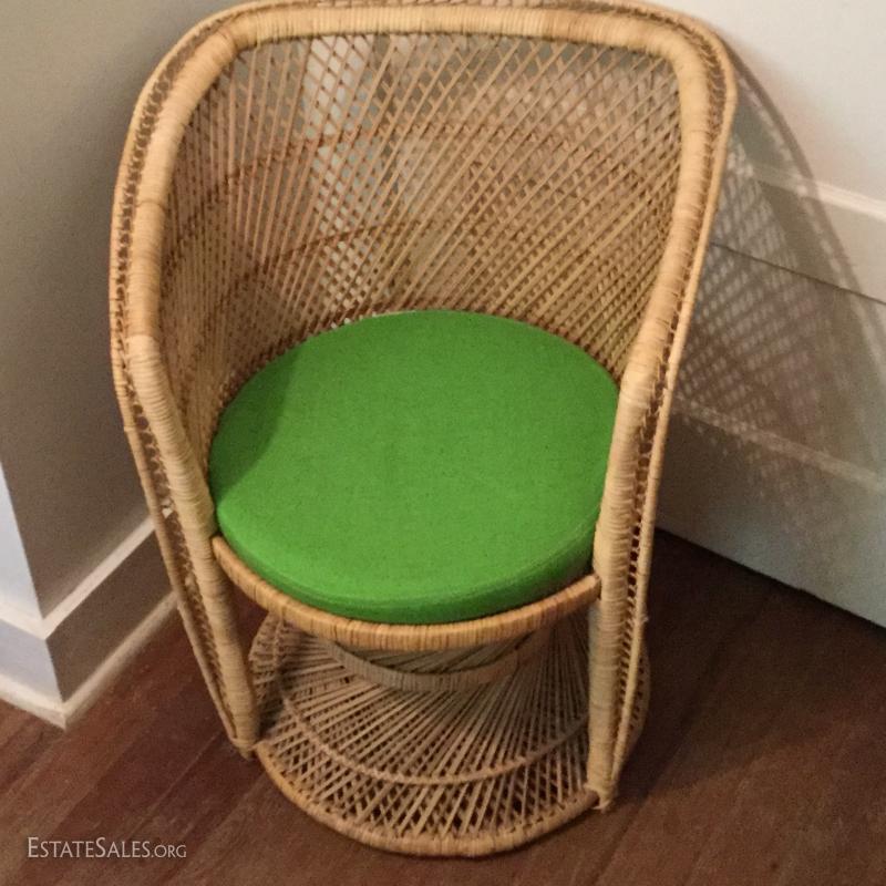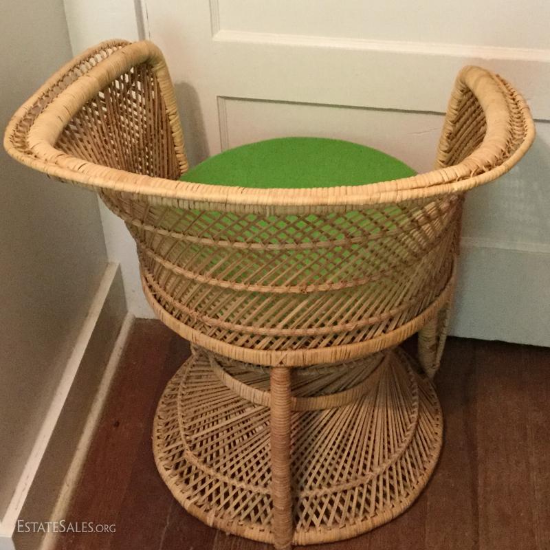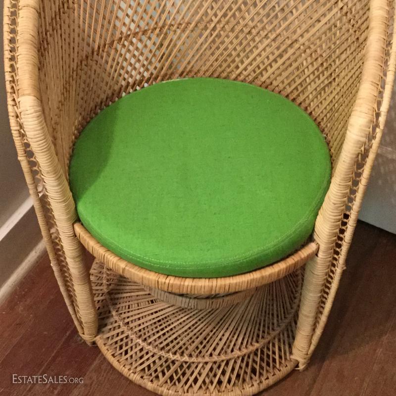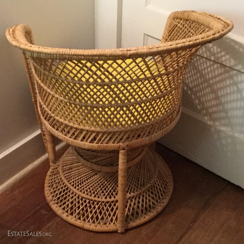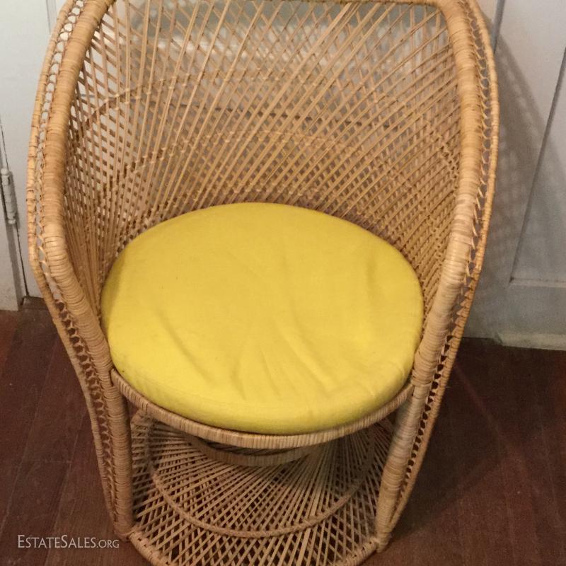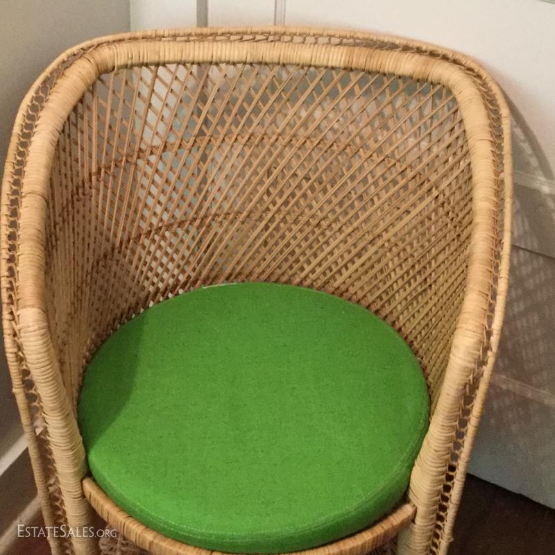 Two Mid-Century Modern chairs with cushions. Sturdy. Also includes misc baskets.