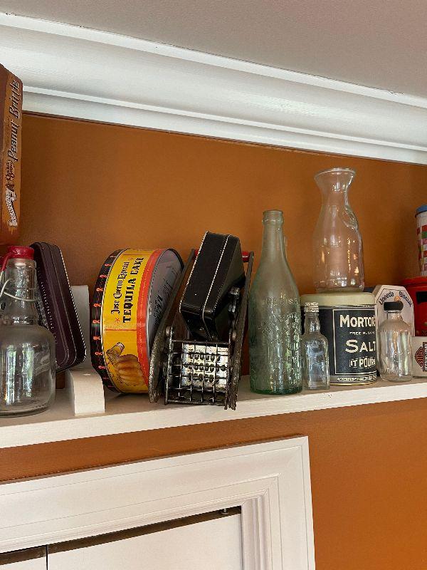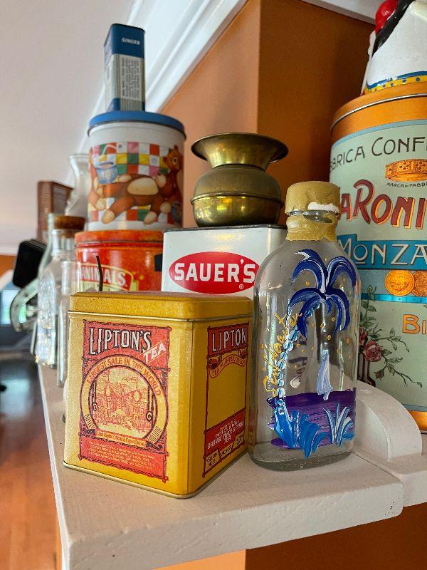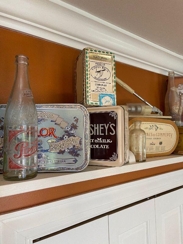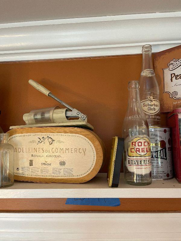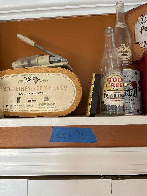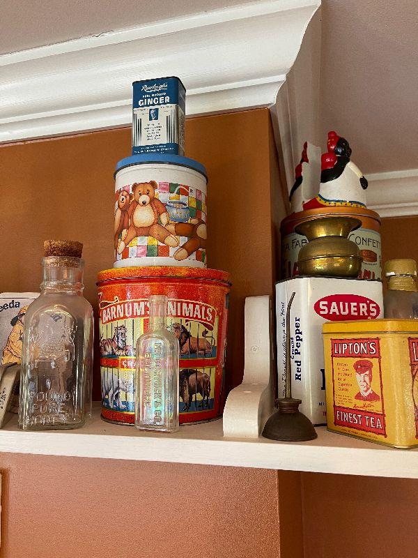 Large Assortment of Vintage Cans and Bottles Including Lipton's, Hershey's, Maxwell House, Morton's Salt, Pepsi Cola) as well as Other Miscellaneous Vintage Items including a Potato Press.