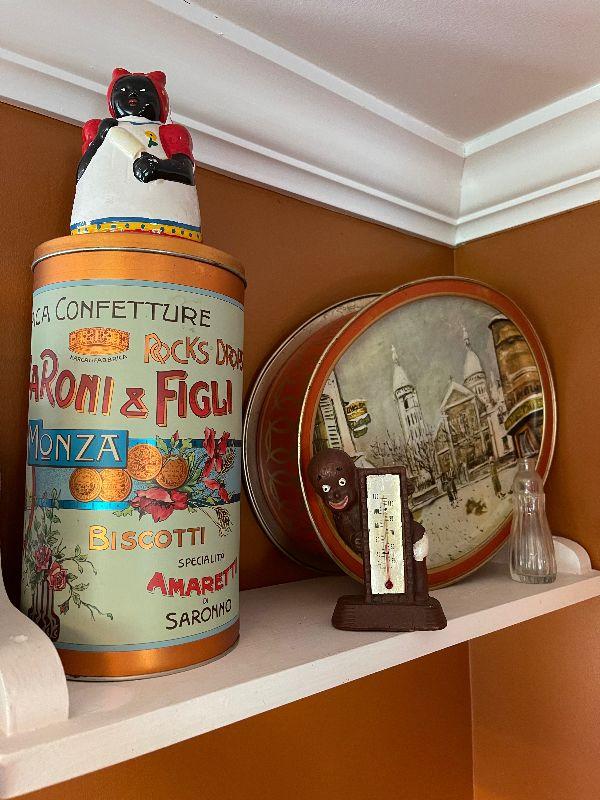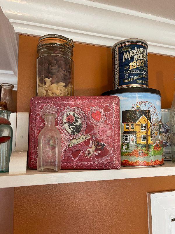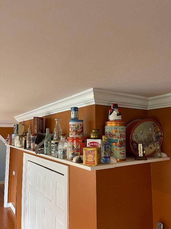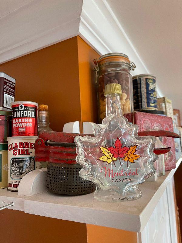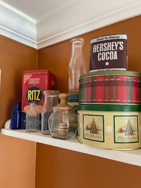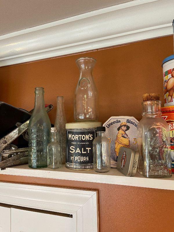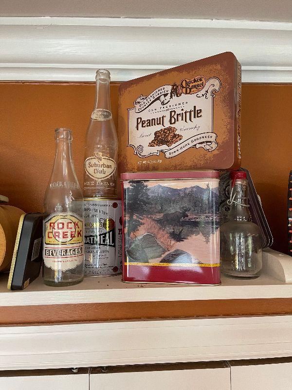 Large Assortment of Vintage Cans and Bottles Including Lipton's, Hershey's, Maxwell House, Morton's Salt, Pepsi Cola) as well as Other Miscellaneous Vintage Items including a Potato Press.