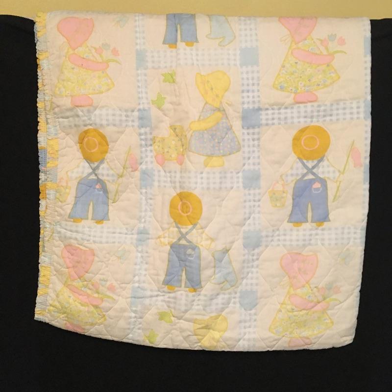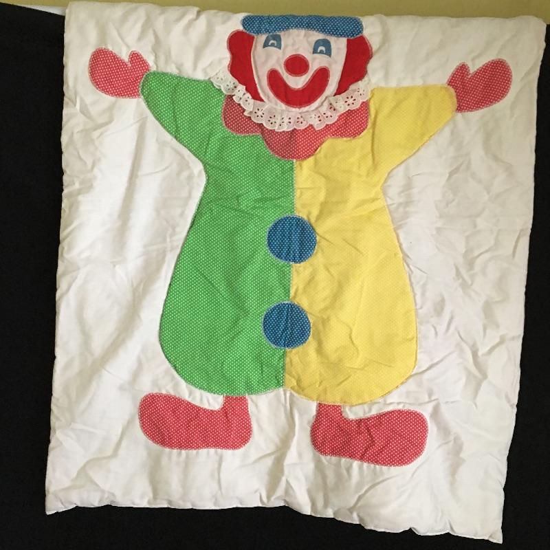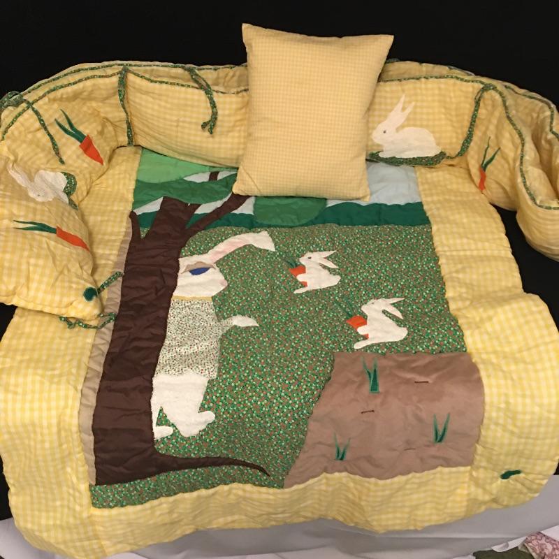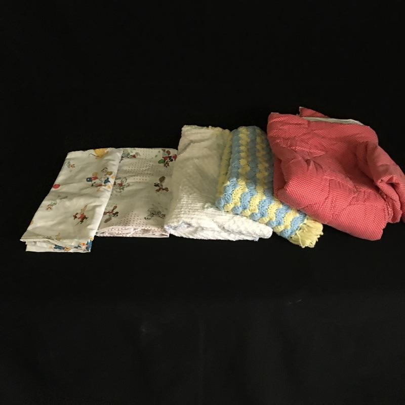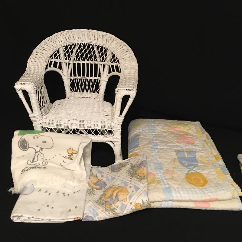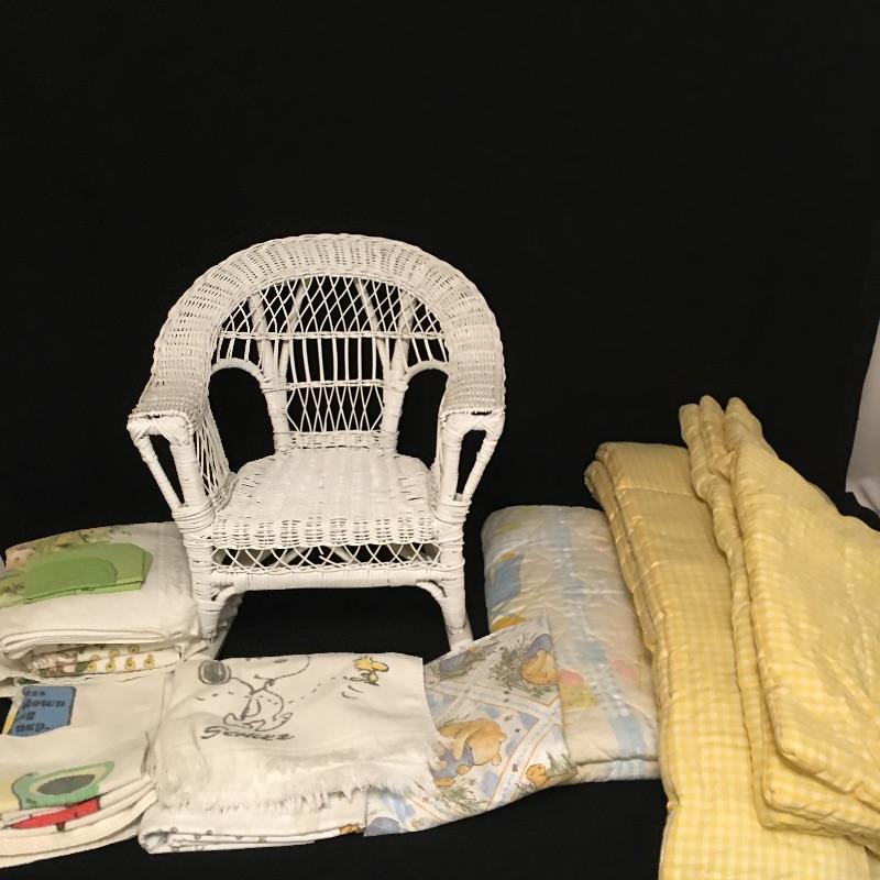 Vintage crib bumper with matching quilt and pillow, towels and washcloths with children’s characters, twin sheet set, wicker rocking chair, crochet blanket, blanket with clown, quilts and more.