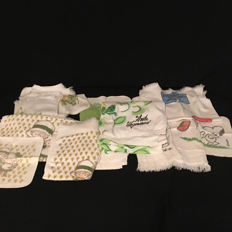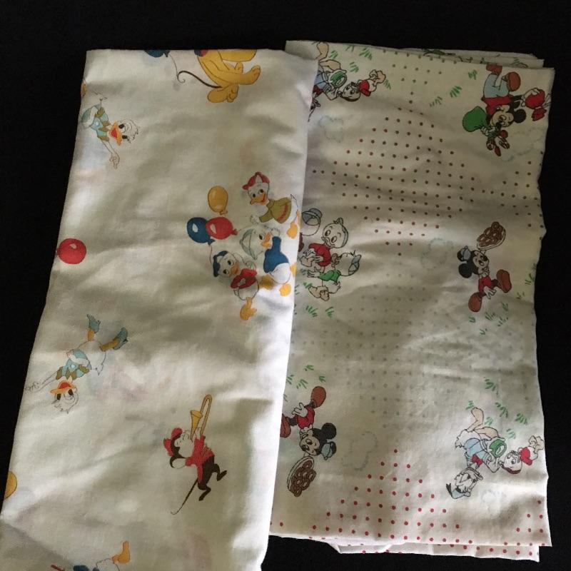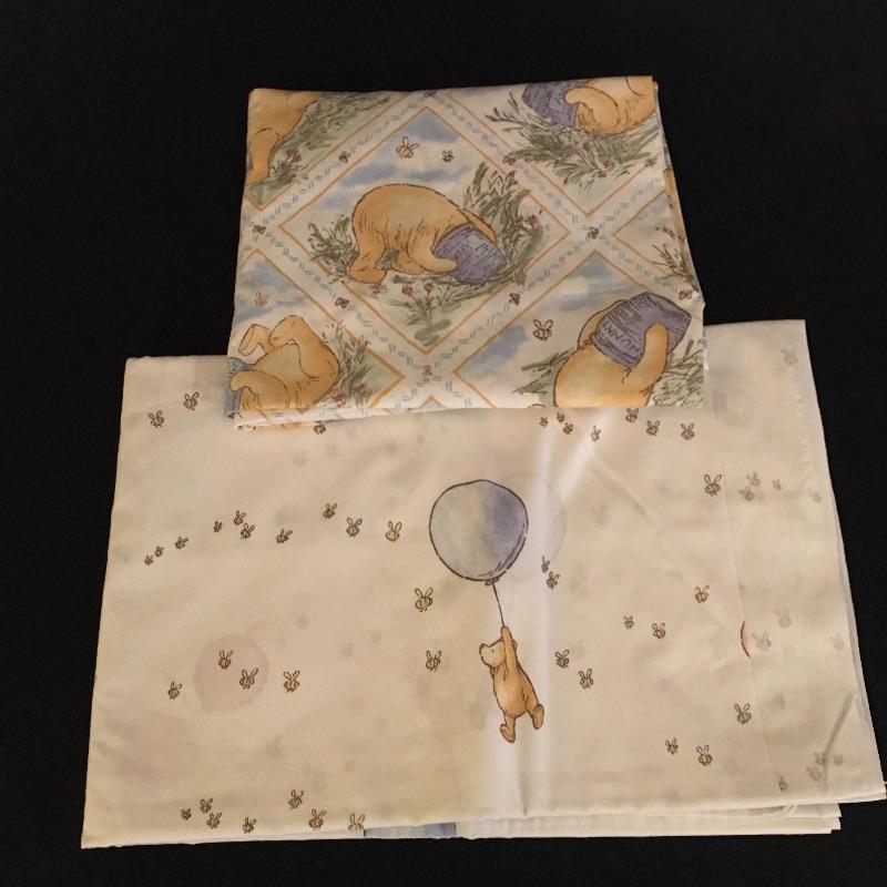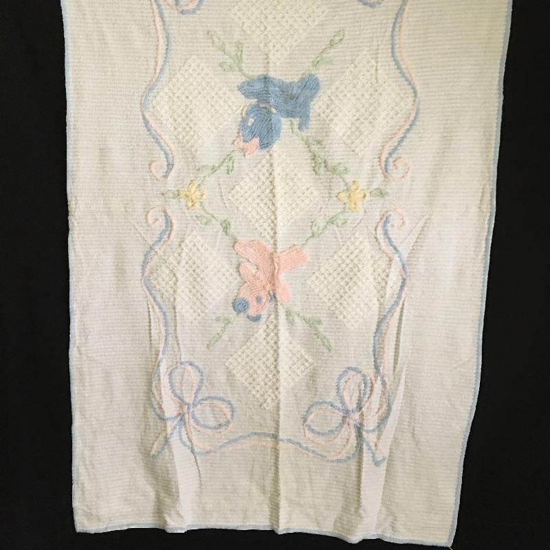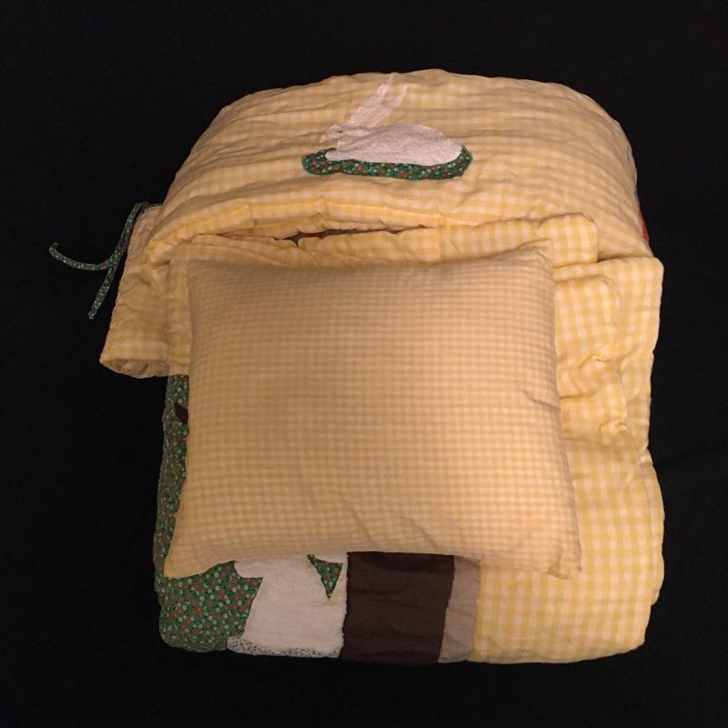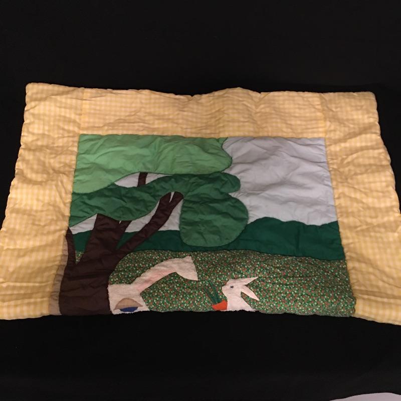 Vintage crib bumper with matching quilt and pillow, towels and washcloths with children’s characters, twin sheet set, wicker rocking chair, crochet blanket, blanket with clown, quilts and more.