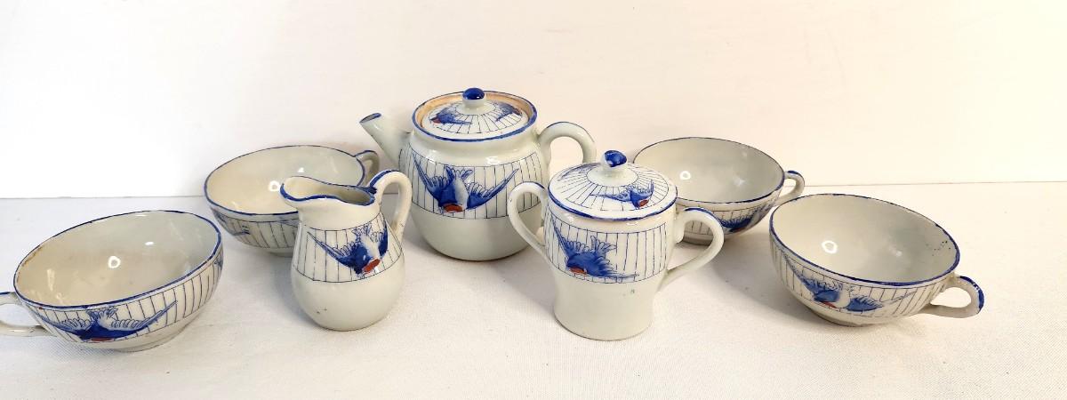 Sweet vintage child's blue/white tea set featuring the Blue Bird of Happiness - 7 pieces (4 cups, Tea Pot, cream/sugar).