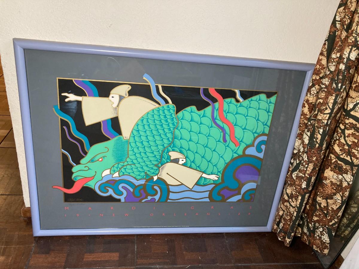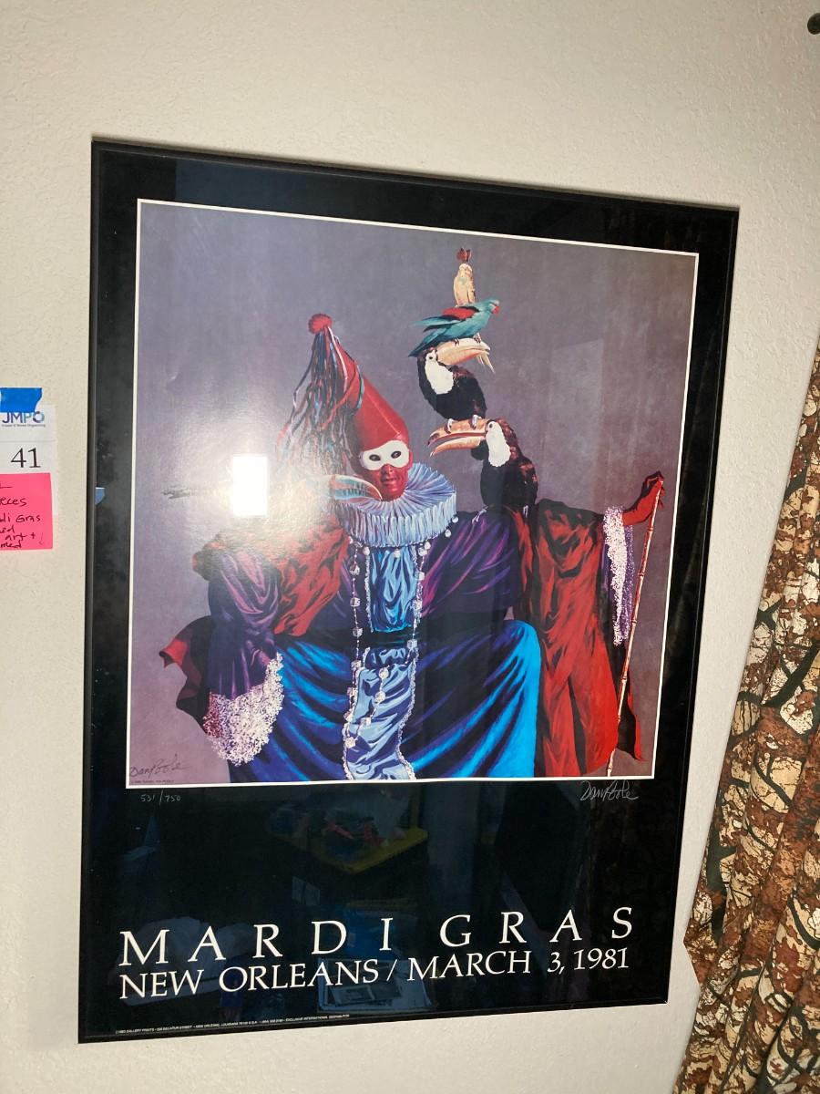2 pieces of Marci Gras framed art. Dan Poole numbered and signed 591/750 poster from 1981. Hugh Ricks signed Poster.