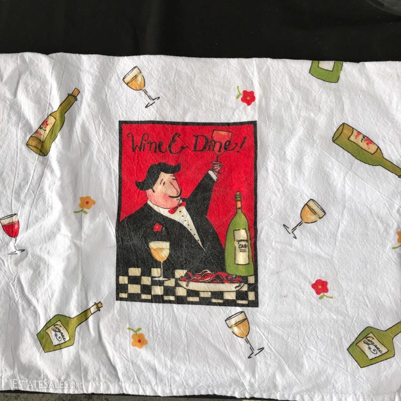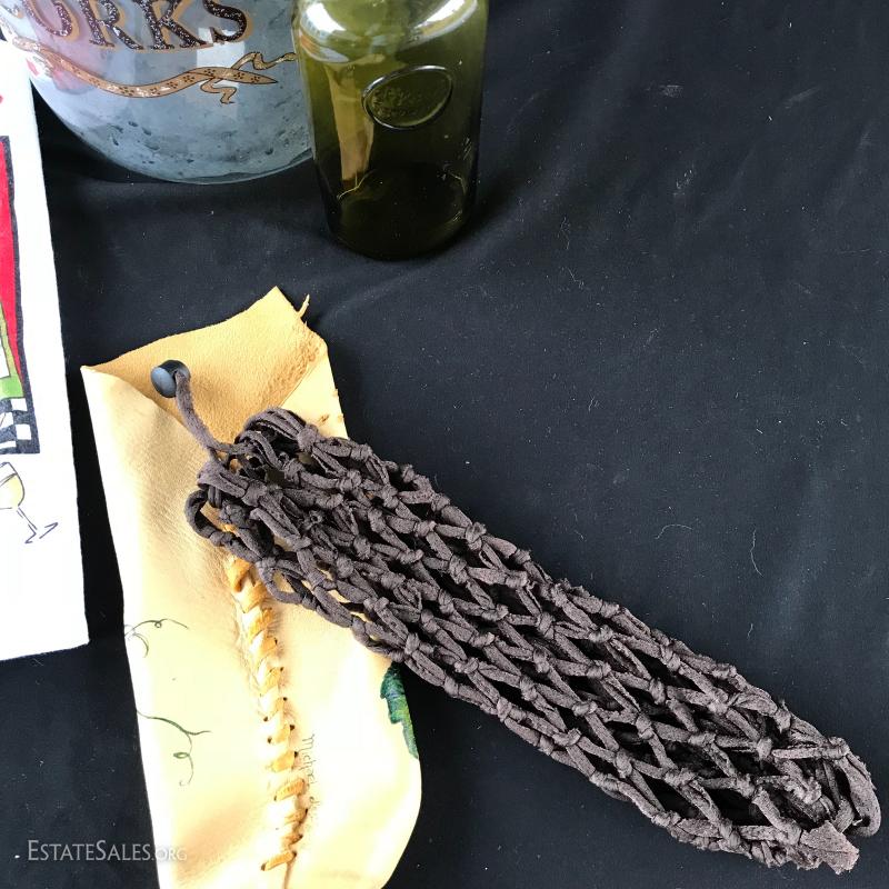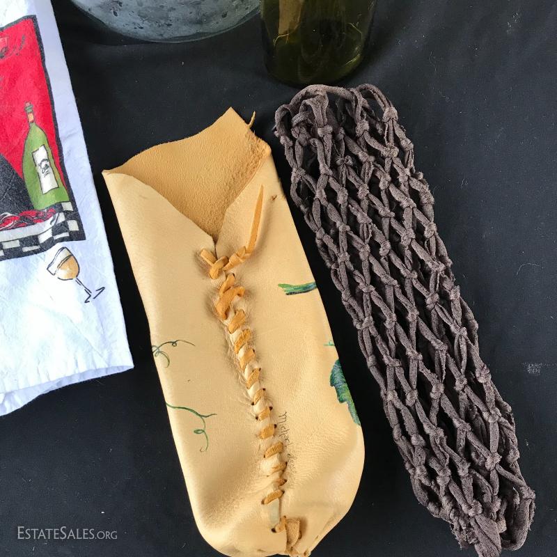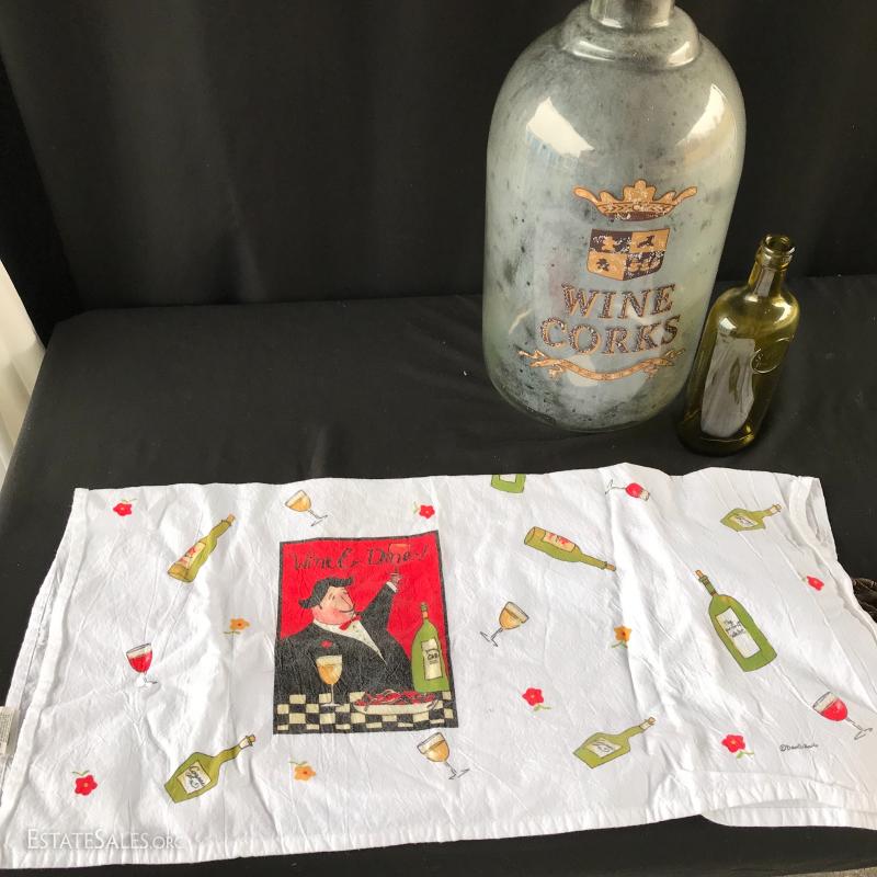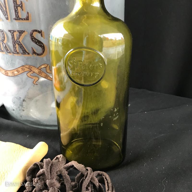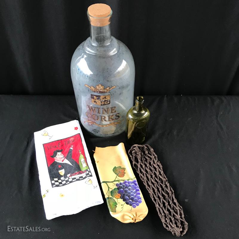 Tall glass jar for wine corks (measuring 18”x 8”), and small green bottle with “St Peters Brewery” on it (measures 9” tall), Tea towel and two unique wine bottle covers (one leather the other woven). This lot is available for shipping or local pick up in Asheville, NC.
