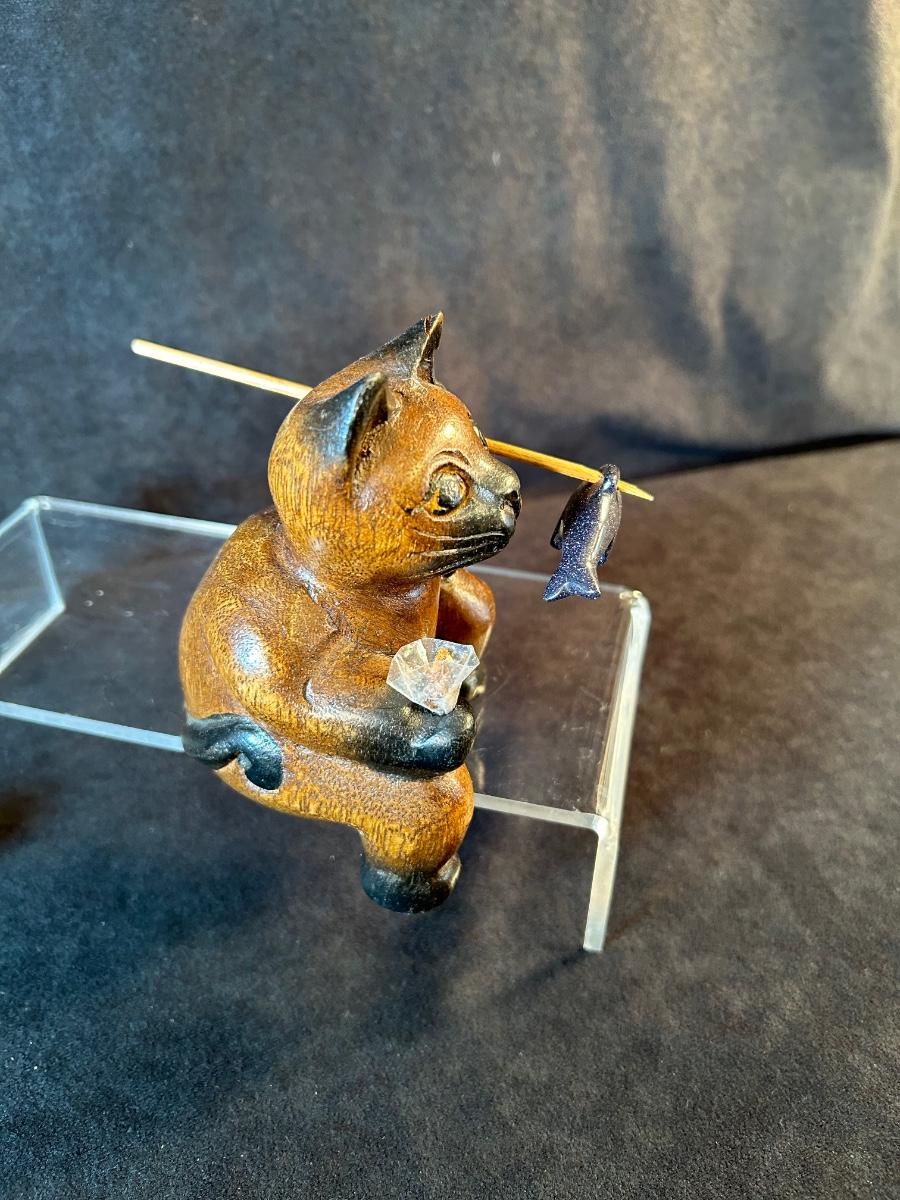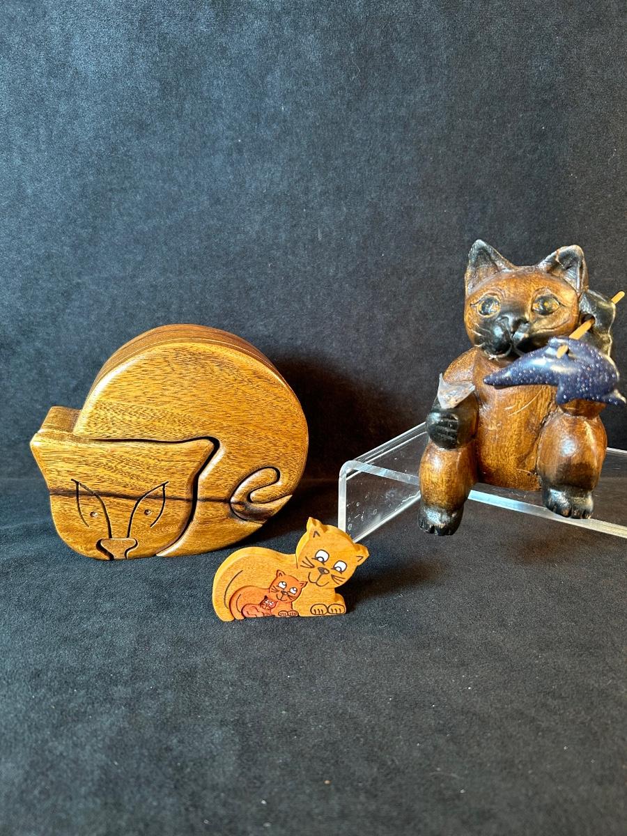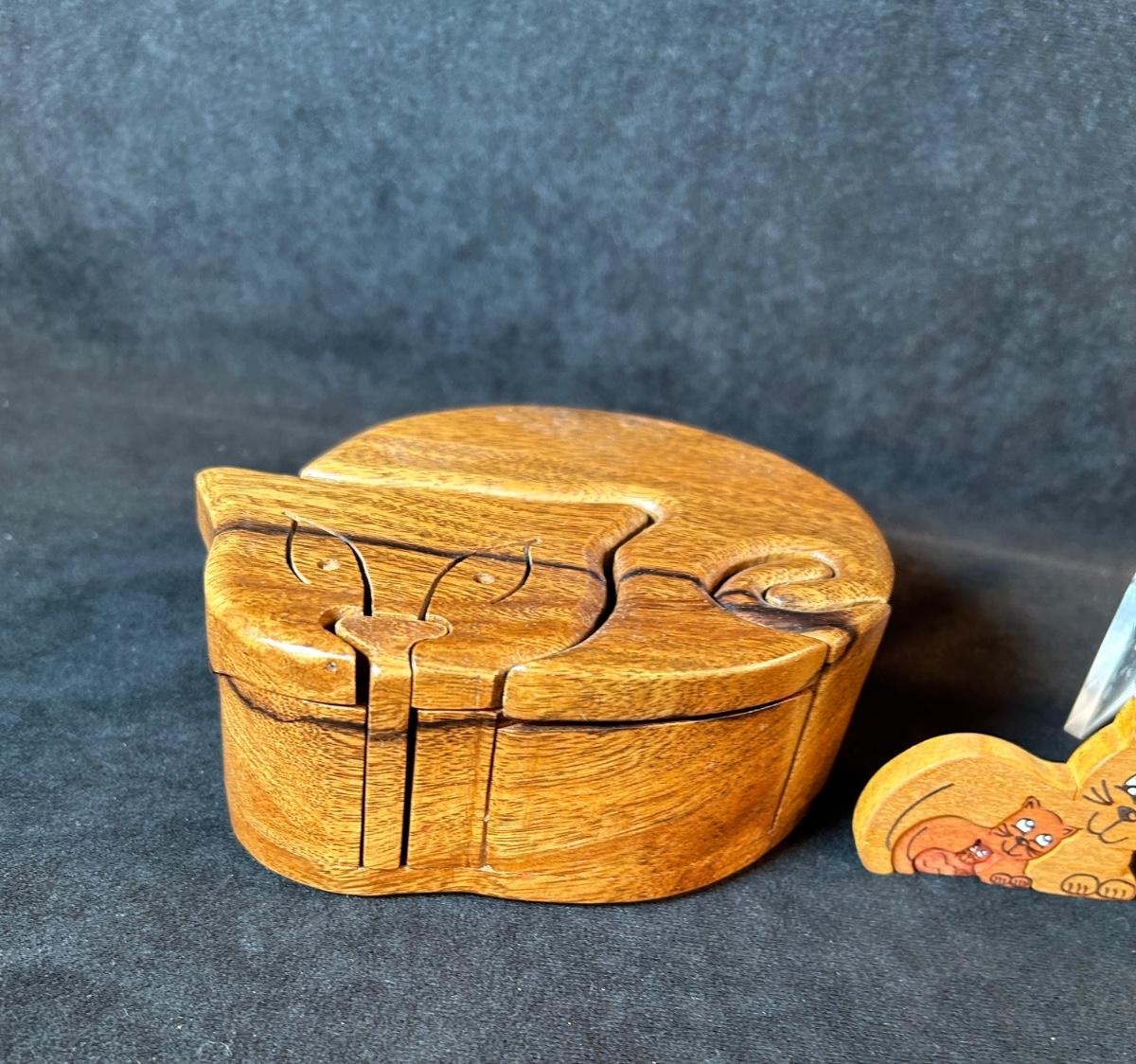 wooden puzzle box, small cat puzzle and wooden cat figurine