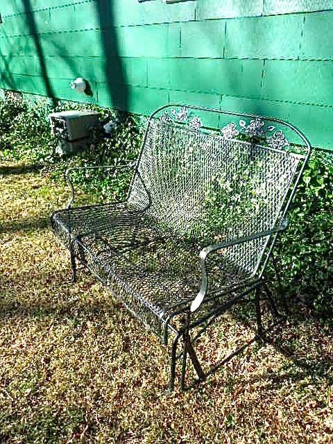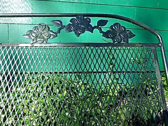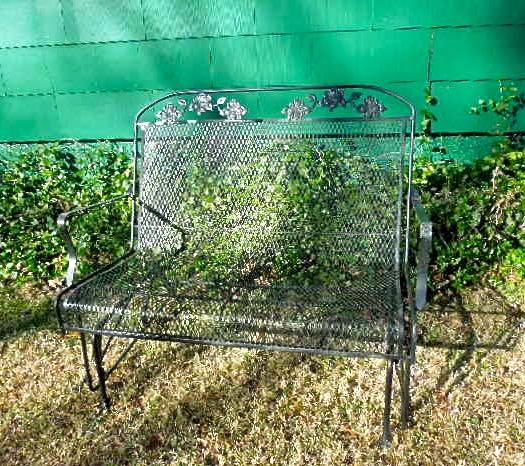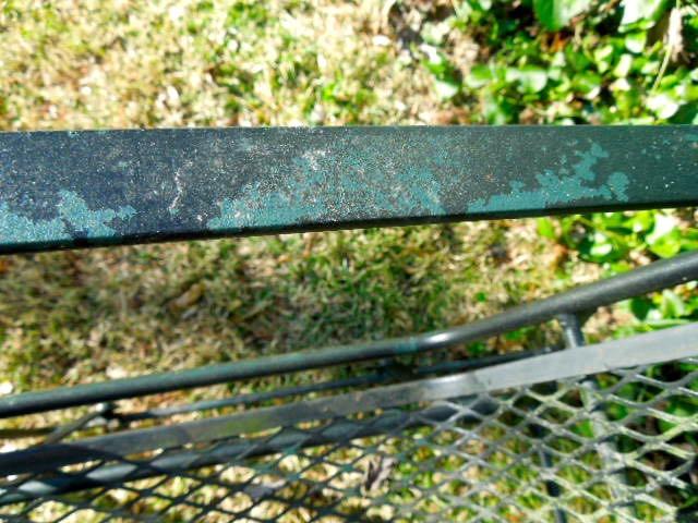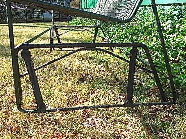 42" w x 36" H x 28" D. One place where paint is peeling on arm. No rust noted. Dark green finish.
