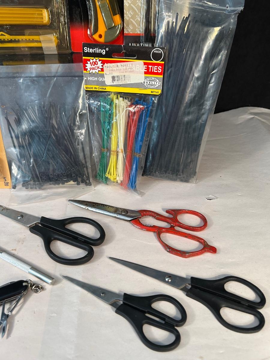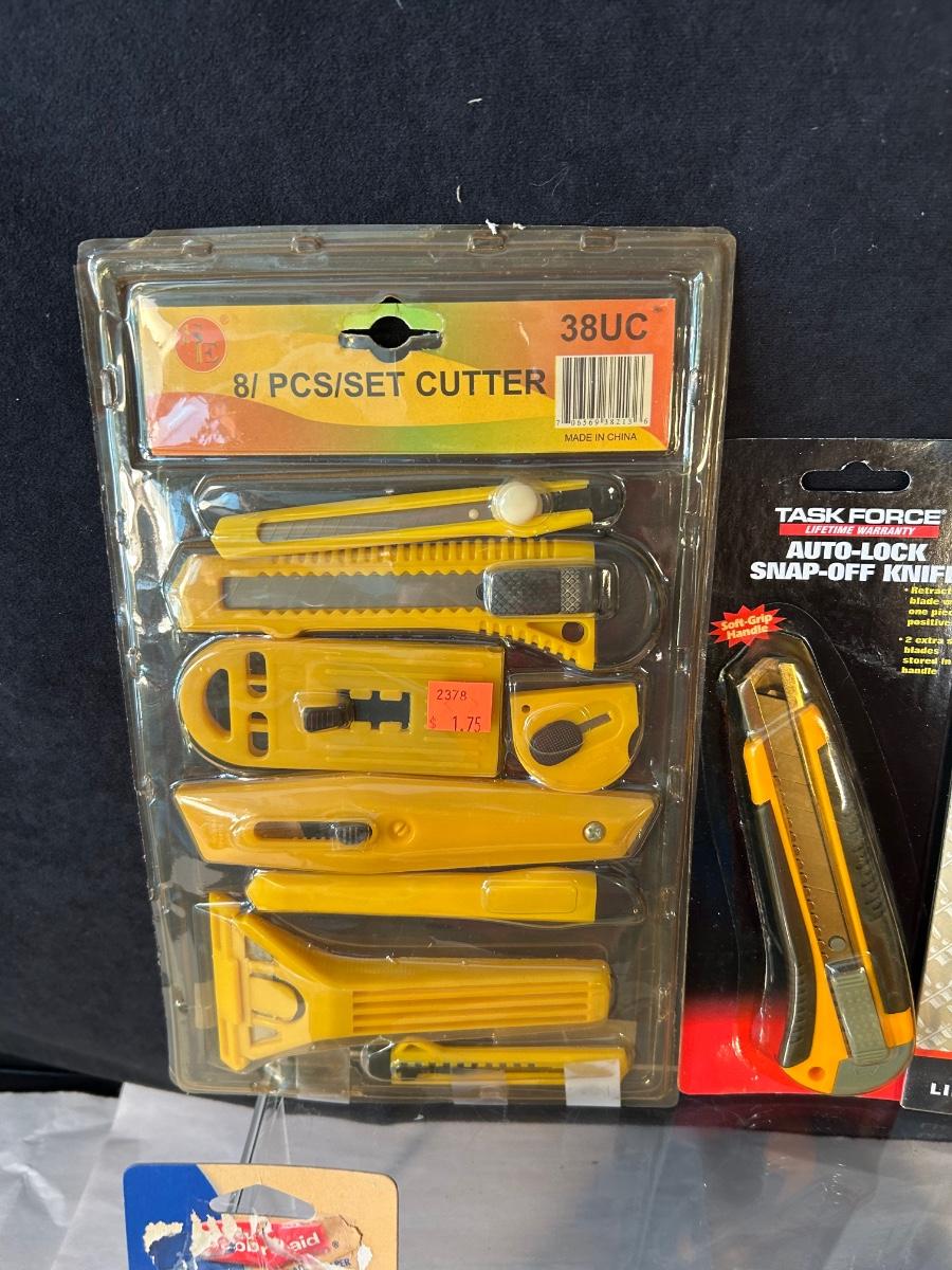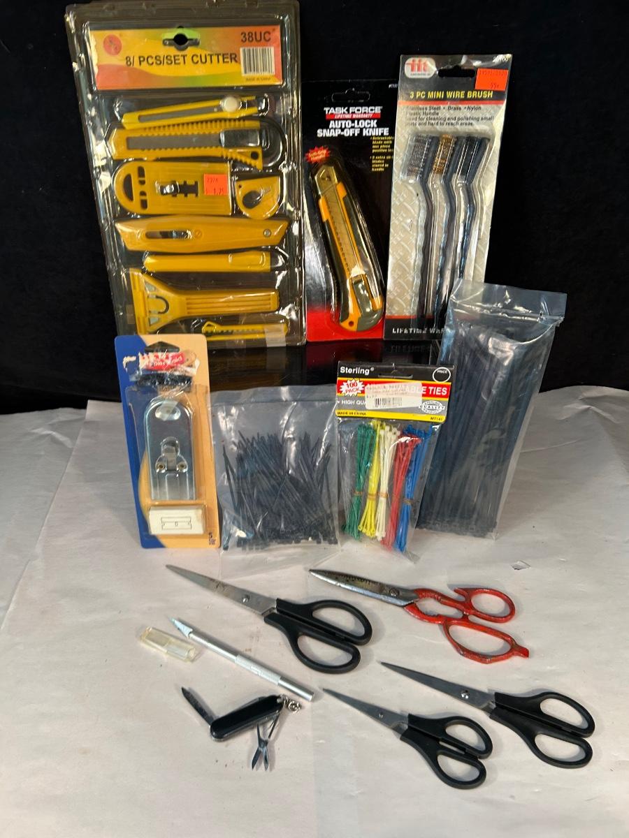 3-pack of mini wire brushes, 4 pair of scissors, razor blade holder snap-off knife, 8 pc set of cutters