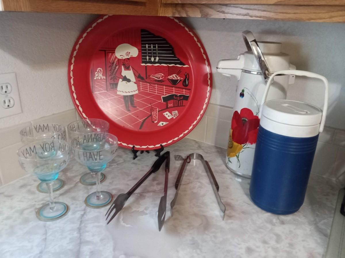 LOT 410 LARGE METAL PLATTER, BBQ GRILL TOOLS, MARGARITA GLASSES AND BEVERAGE COOLERS (Pantry)