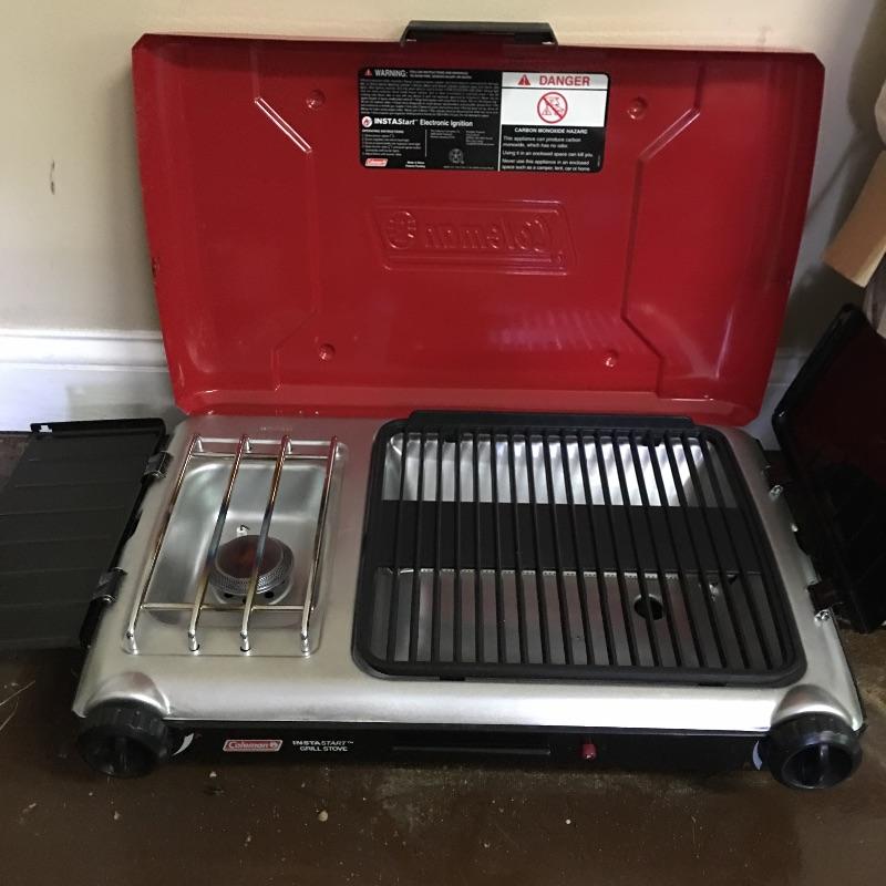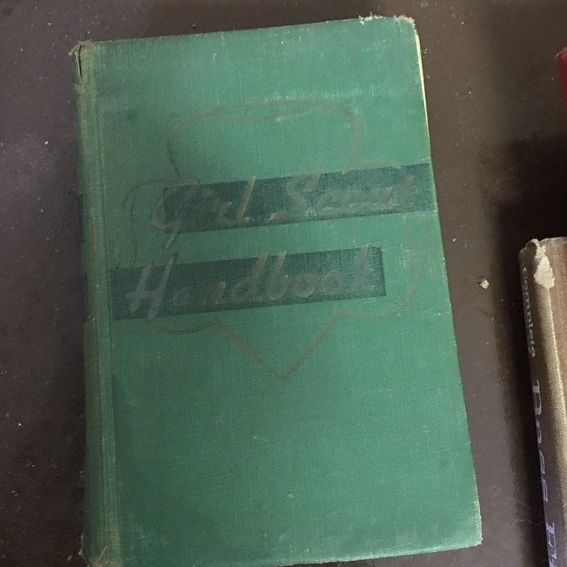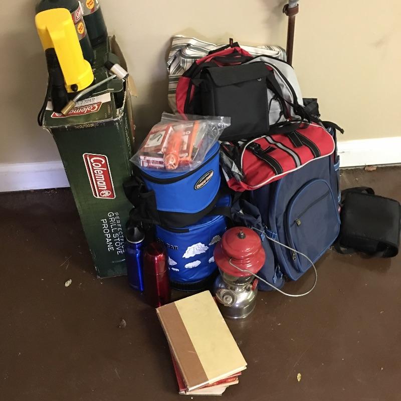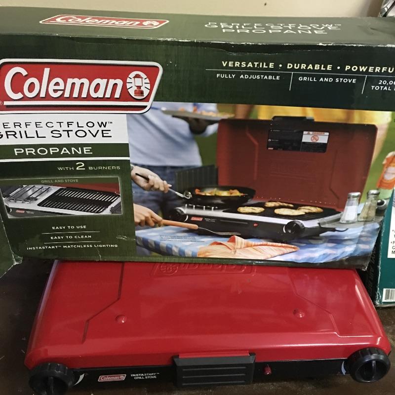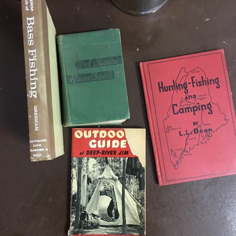 Camping gear includes Coleman grill stove and lantern, picnic set, wind up radio, Olympus Binoculars, small coolers, vintage Girl Scout handbook and more.