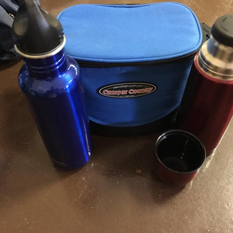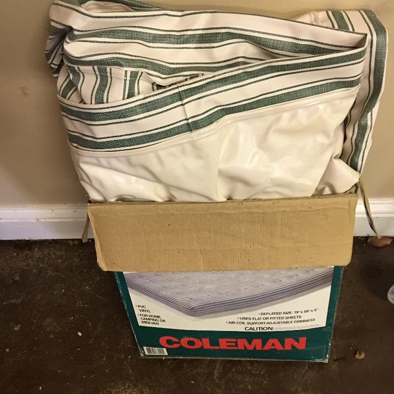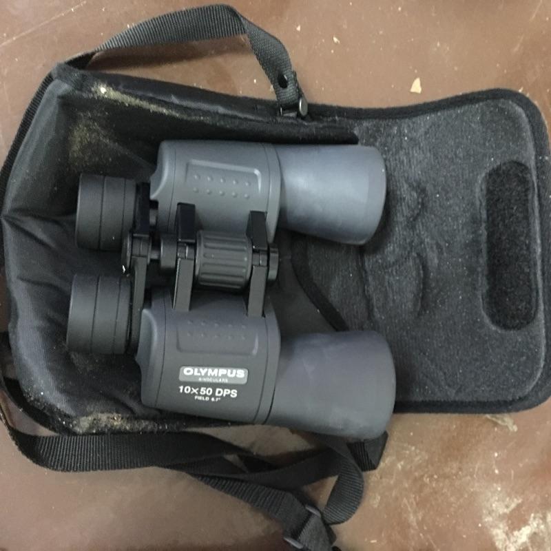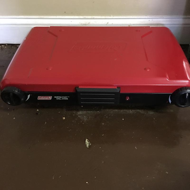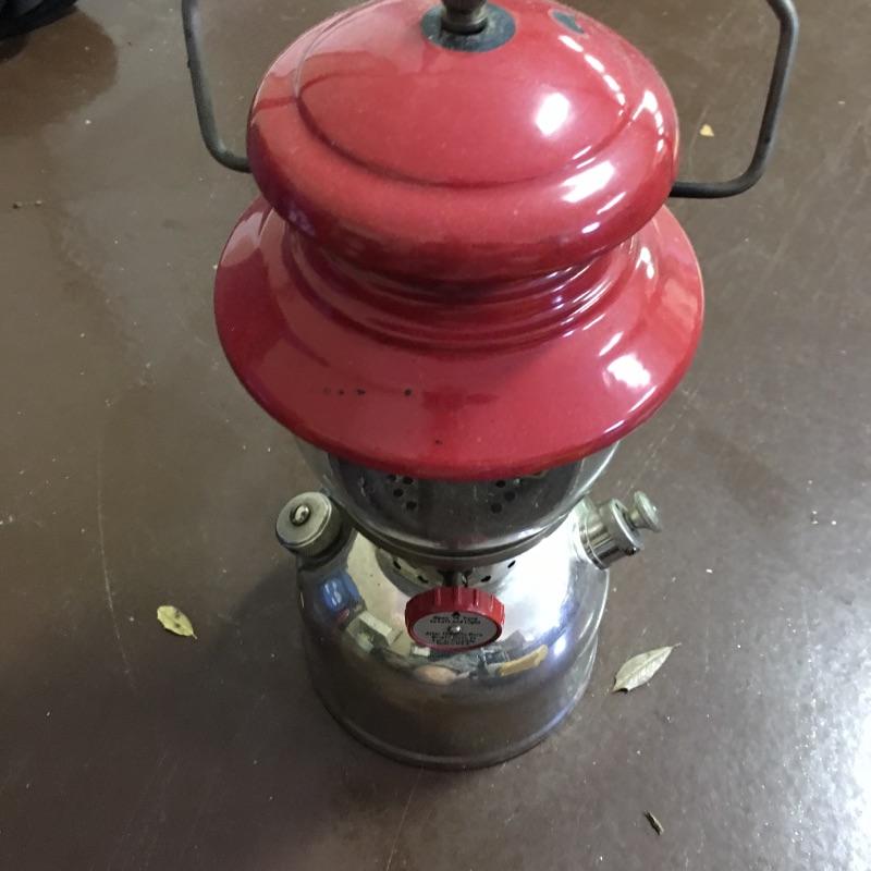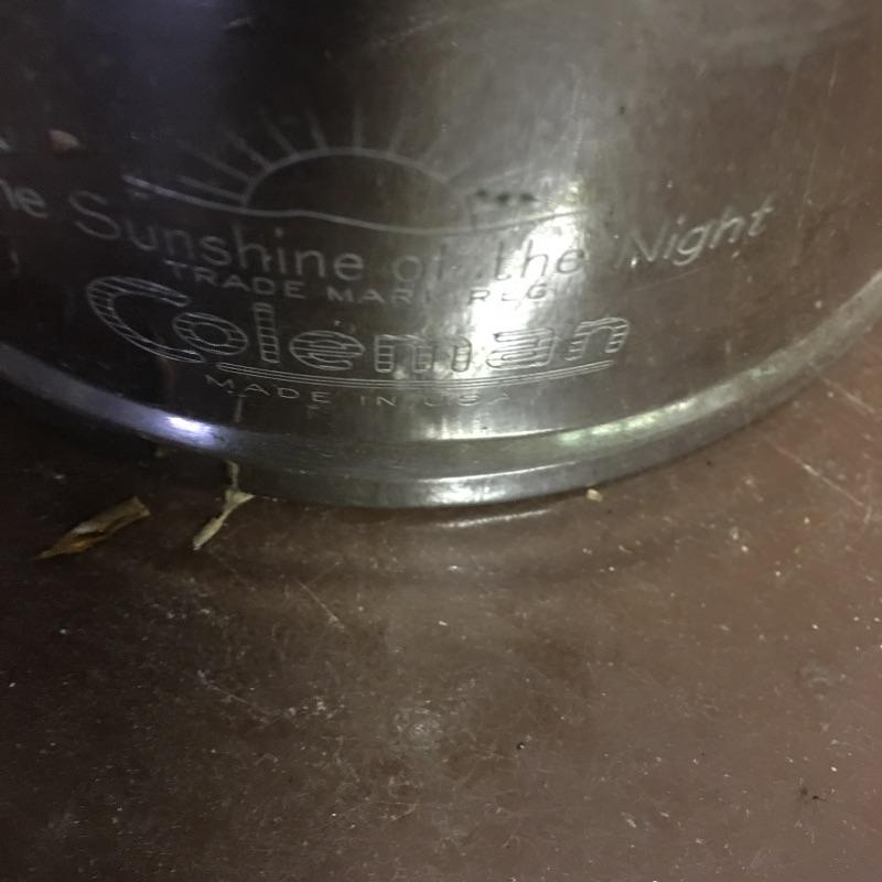 Camping gear includes Coleman grill stove and lantern, picnic set, wind up radio, Olympus Binoculars, small coolers, vintage Girl Scout handbook and more.