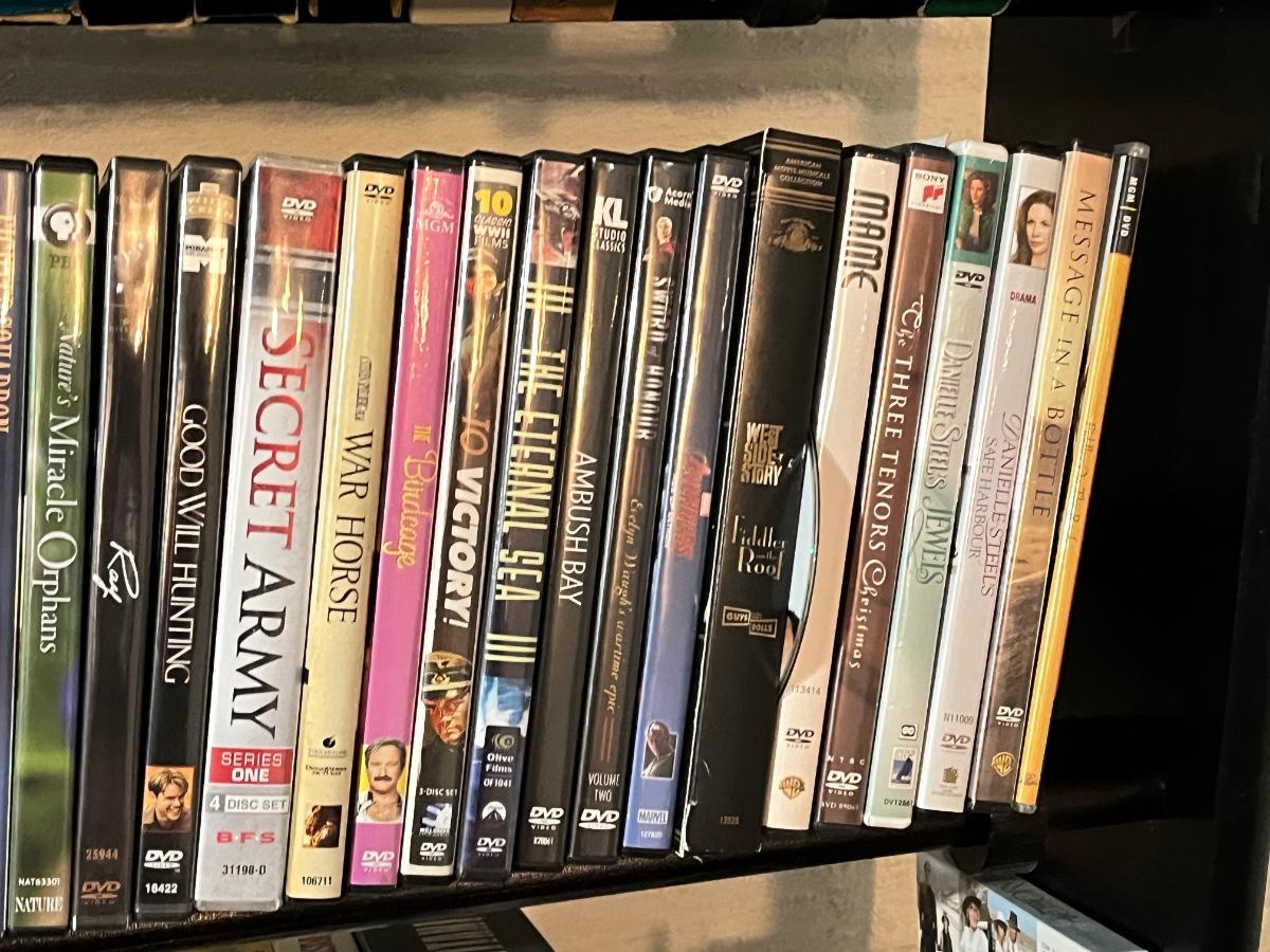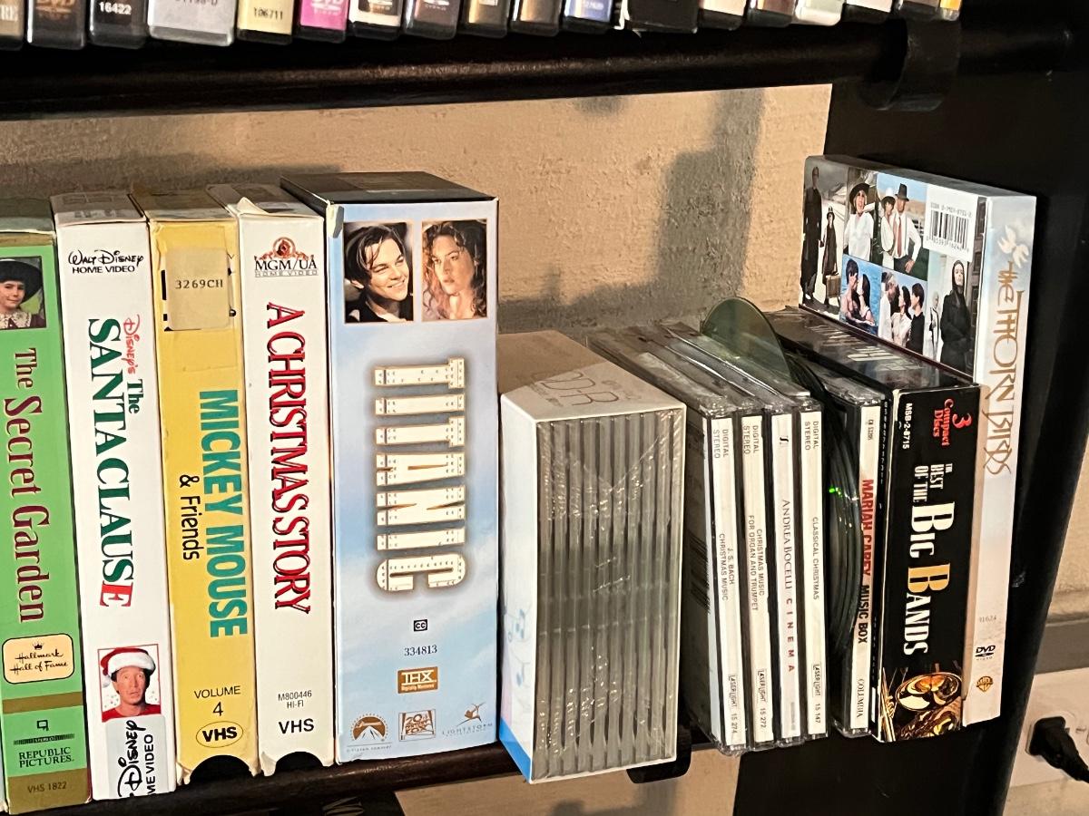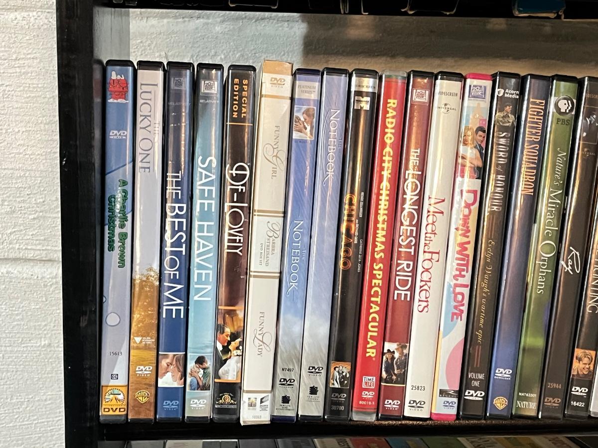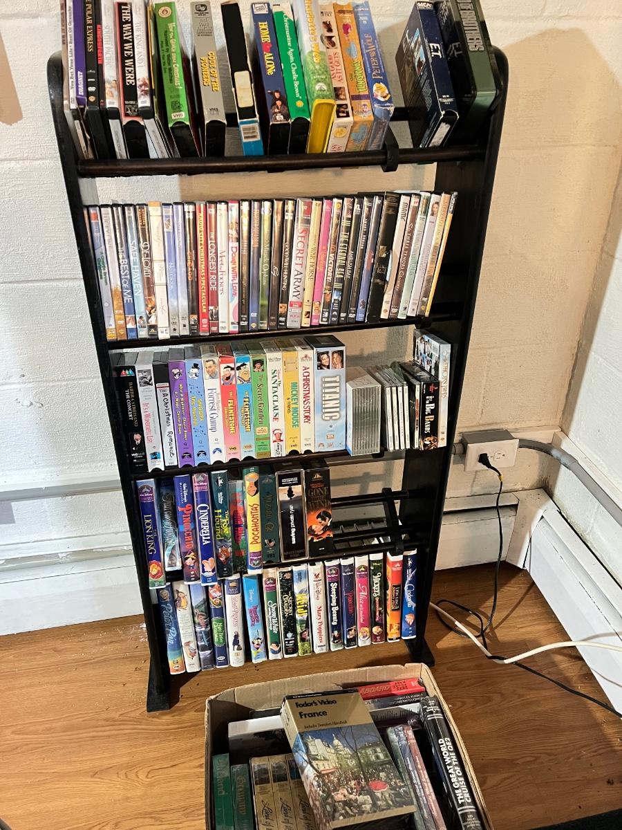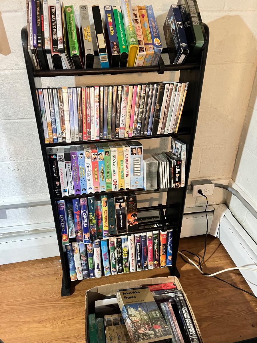LOT 410B: DVDs and VHS Tapes - Many Still Sealed - and Media Shelf