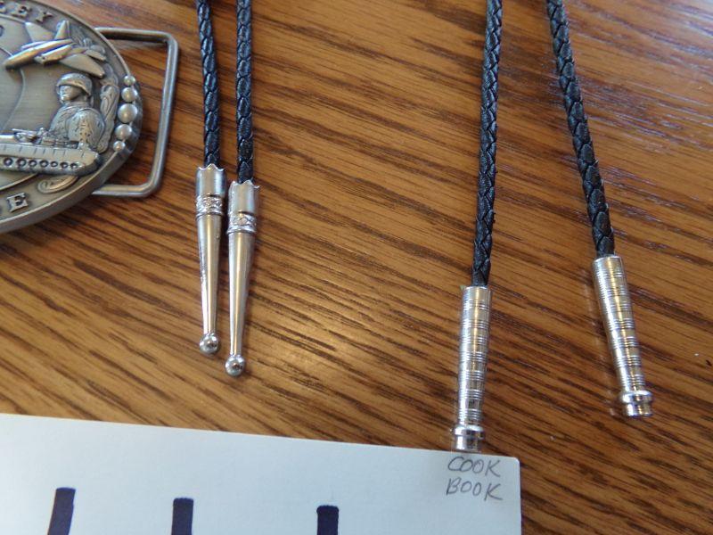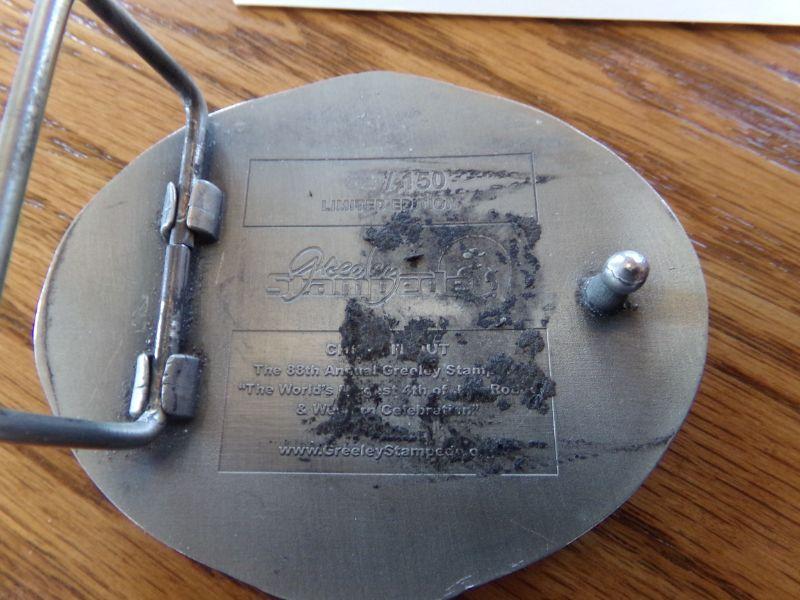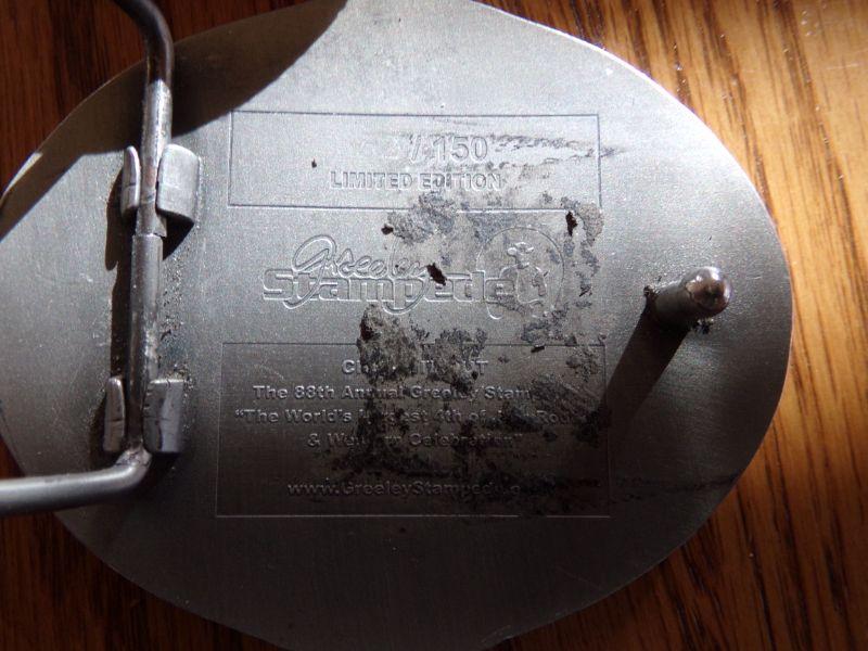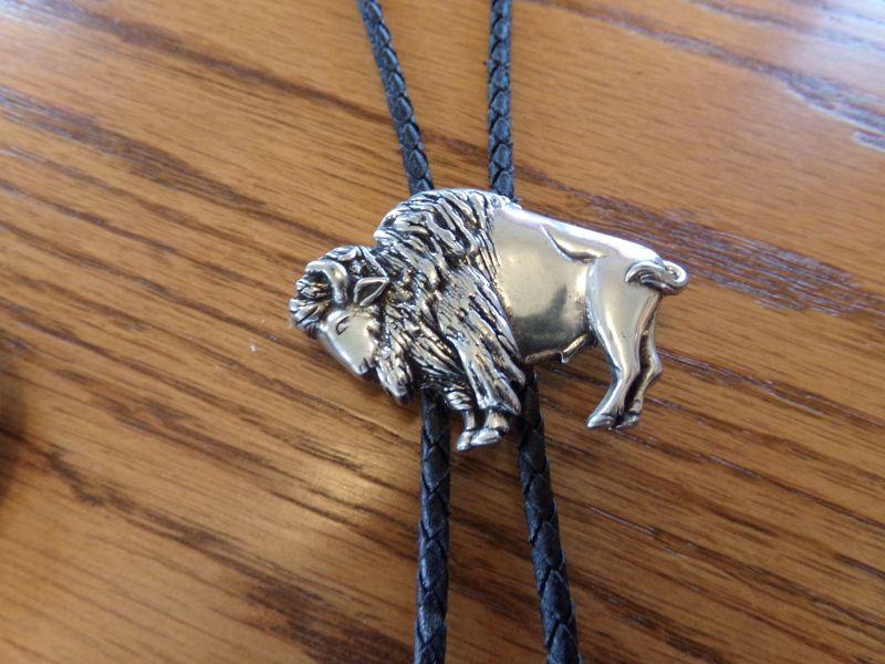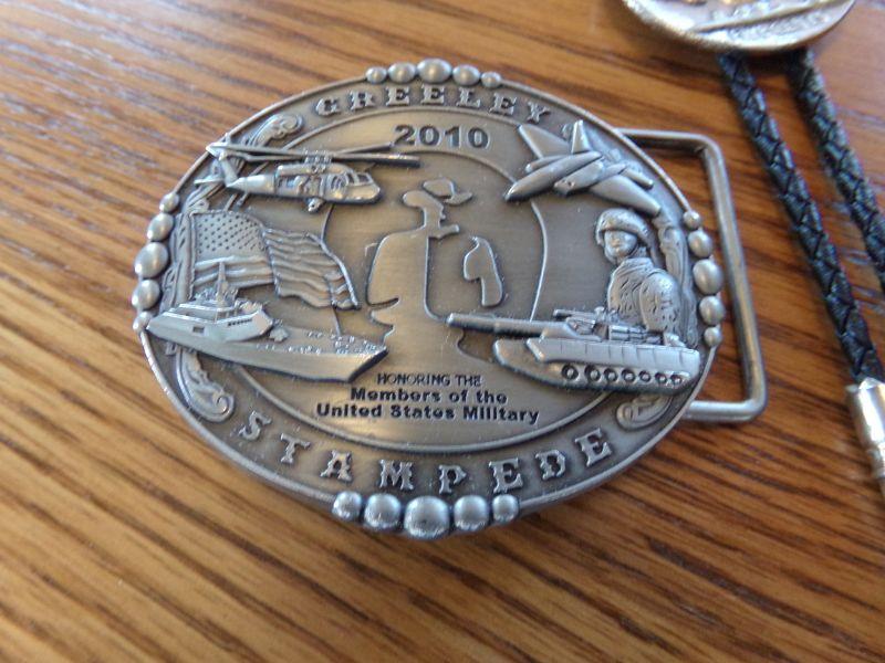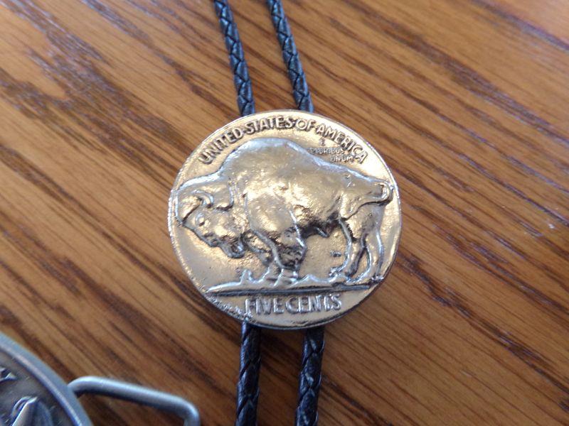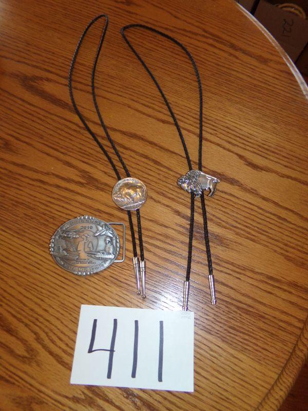 2 BOLOS WITH SILVER COLORED BUFFALOS ON THEM. THEY ARE IN GOOD CONDITION. LIMITED EDITION BELT BUCKLE FROM THE GREELEY STAMPEDE. IT IS NUMBERED 52/150.