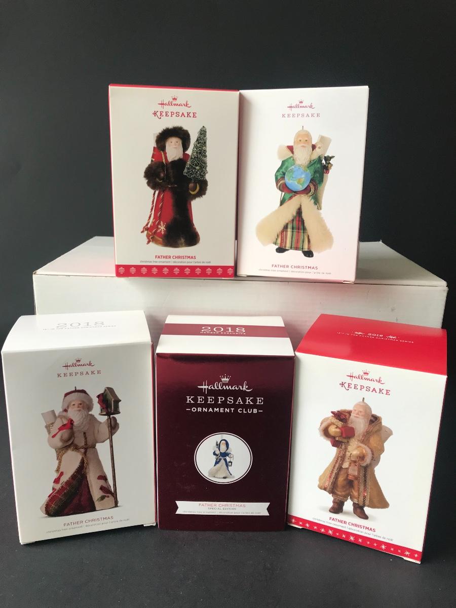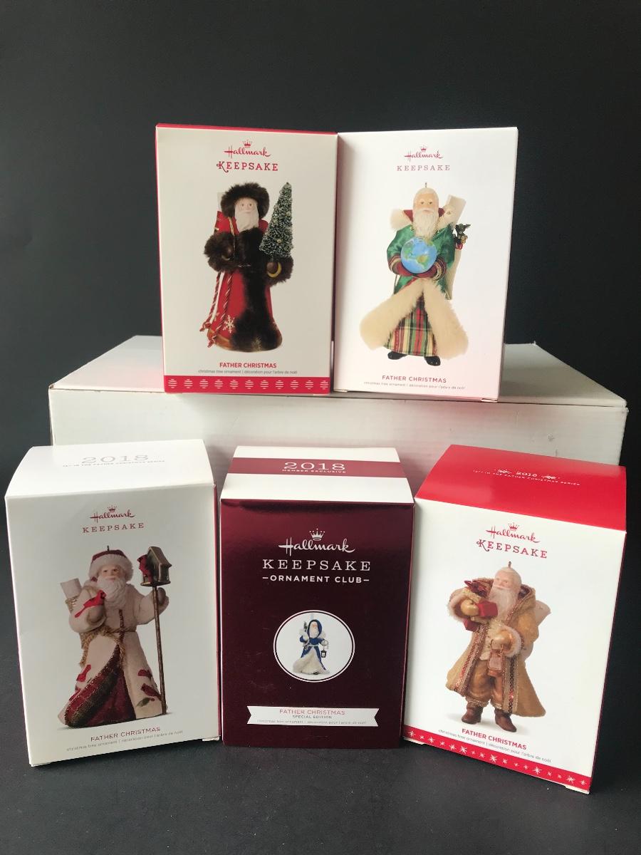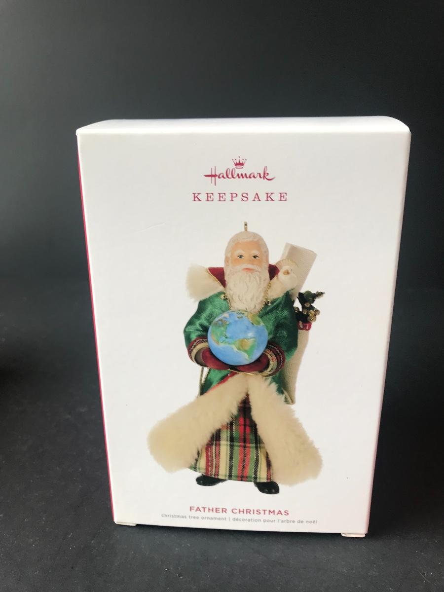 Father Christmas Hallmark Keepsake Ornaments. All Holiday items in this auction are as-seen. The client collected a lot of holiday pieces and some are new in box, some were displayed once and come with original box, and some have been displayed and come with no box. They are all pre-owned in some fashion and have been stored in an attic or on shelf in library. Please see all pictures. The pictures show condition, measurements if taken, and what is included in the lot. Due to the large amount that we photograph and the time frame, we are not always able to take measurements. All items unless noted, are pre-owned and have been used. Thank you