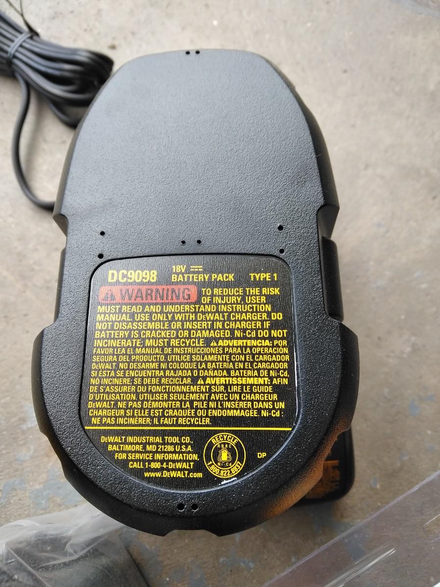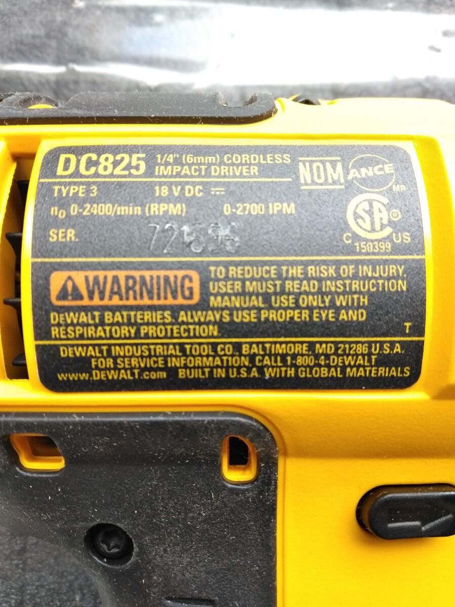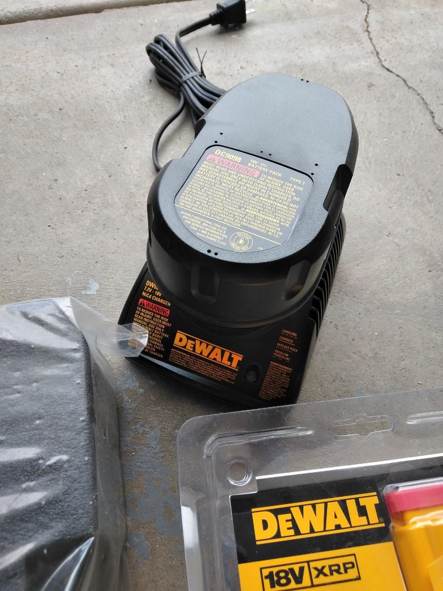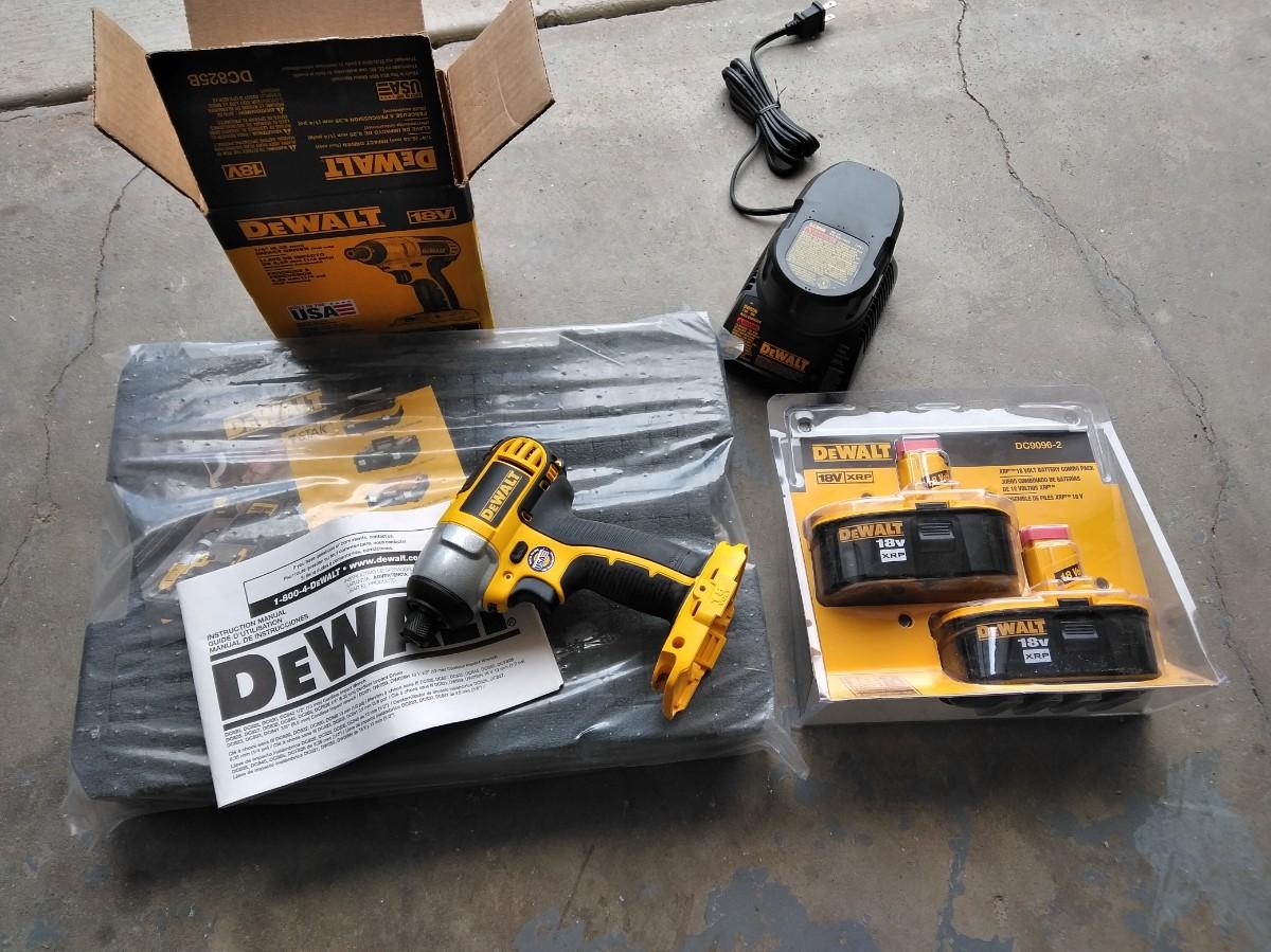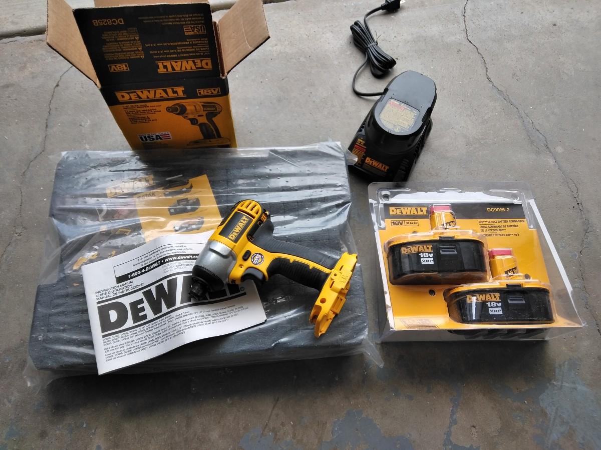 DEWALT 1/4" IMPACT DRIVER DC825 WITH DEWALT DC9098 BATTERY CHARGER AND BATTERY, DEWALT FOAM ORGANIZER AND TWO NEW BATTERIES.