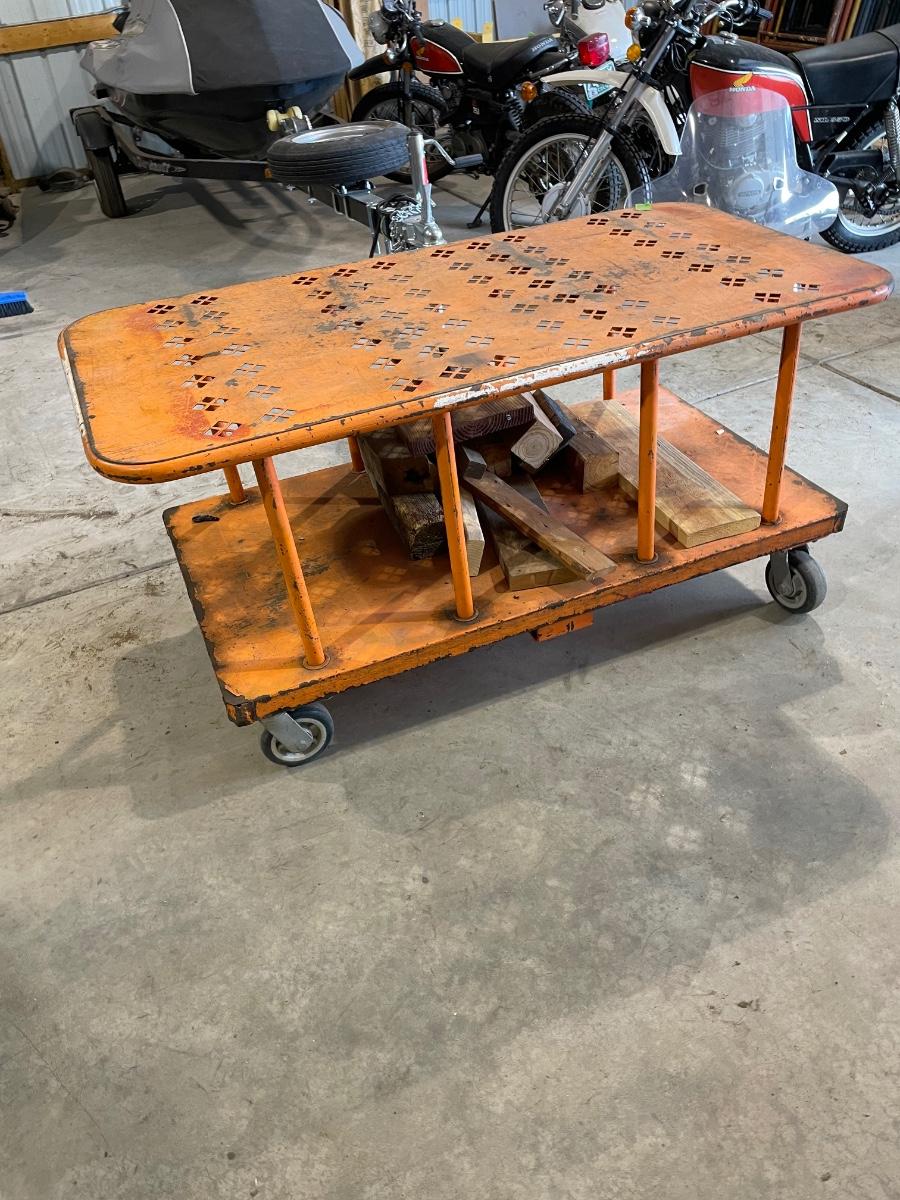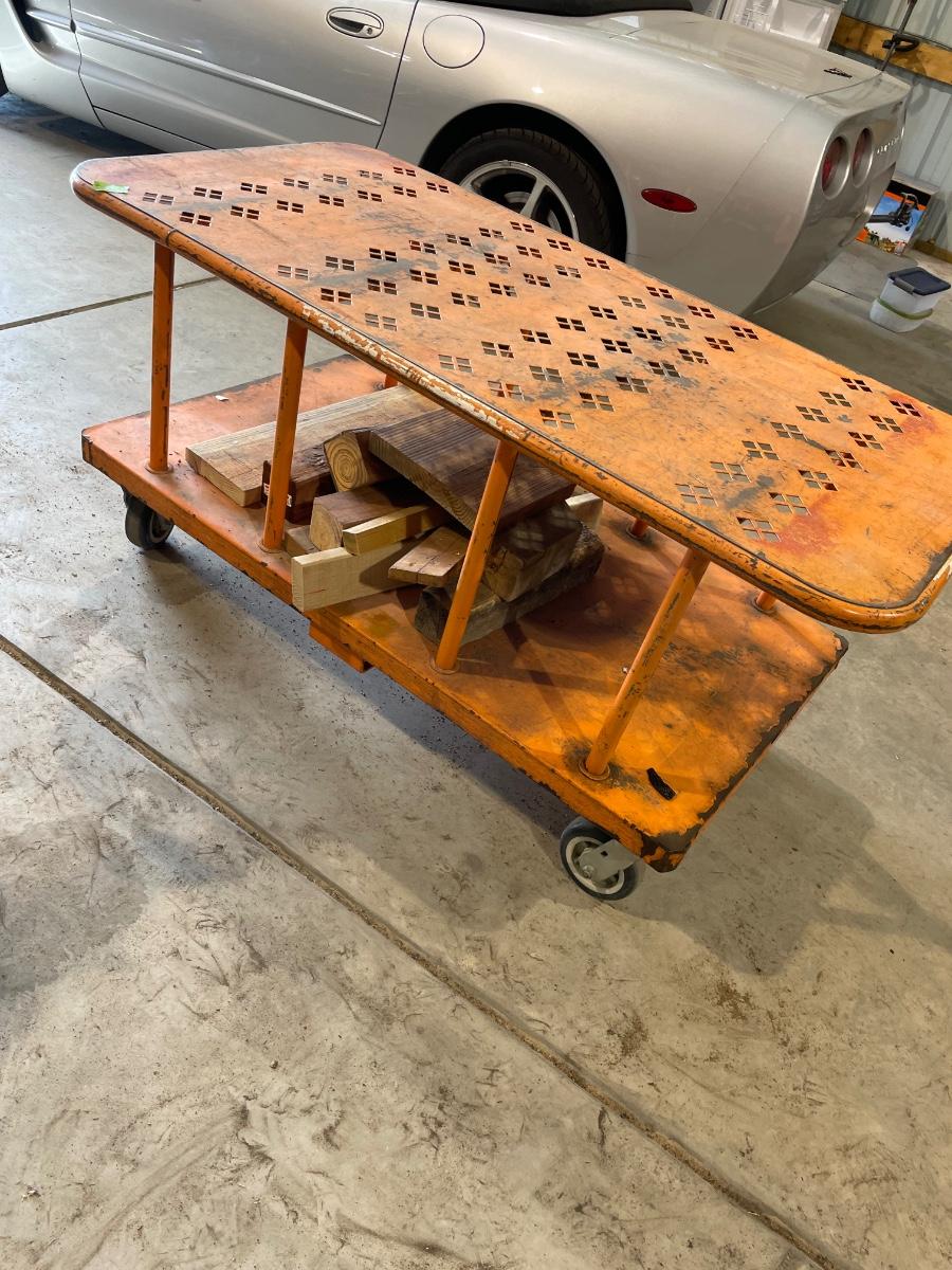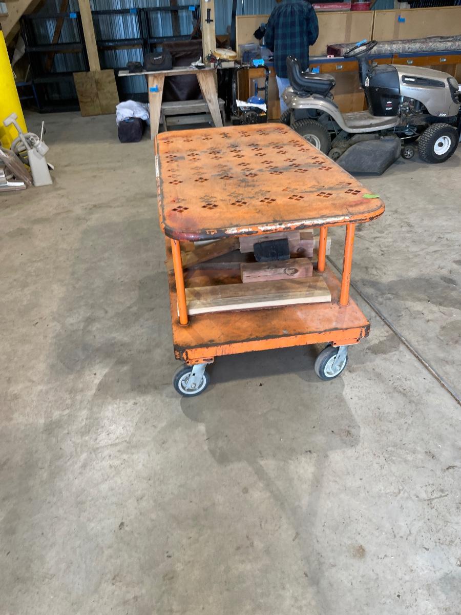Lot 413 orange wood cart (Looks to be from Home Depot) with wood scraps