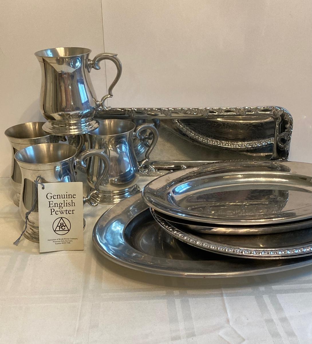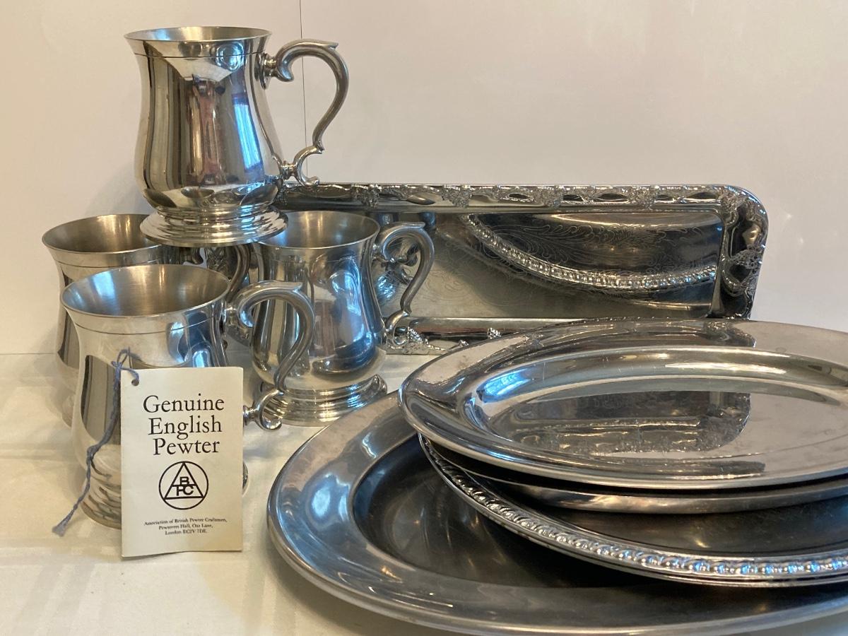 LOT 413D: Pewter Mugs, Stainless Tray Collection and More