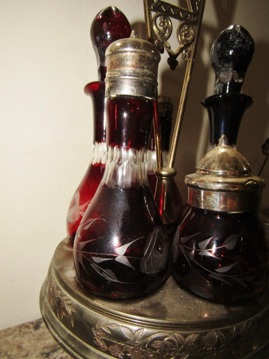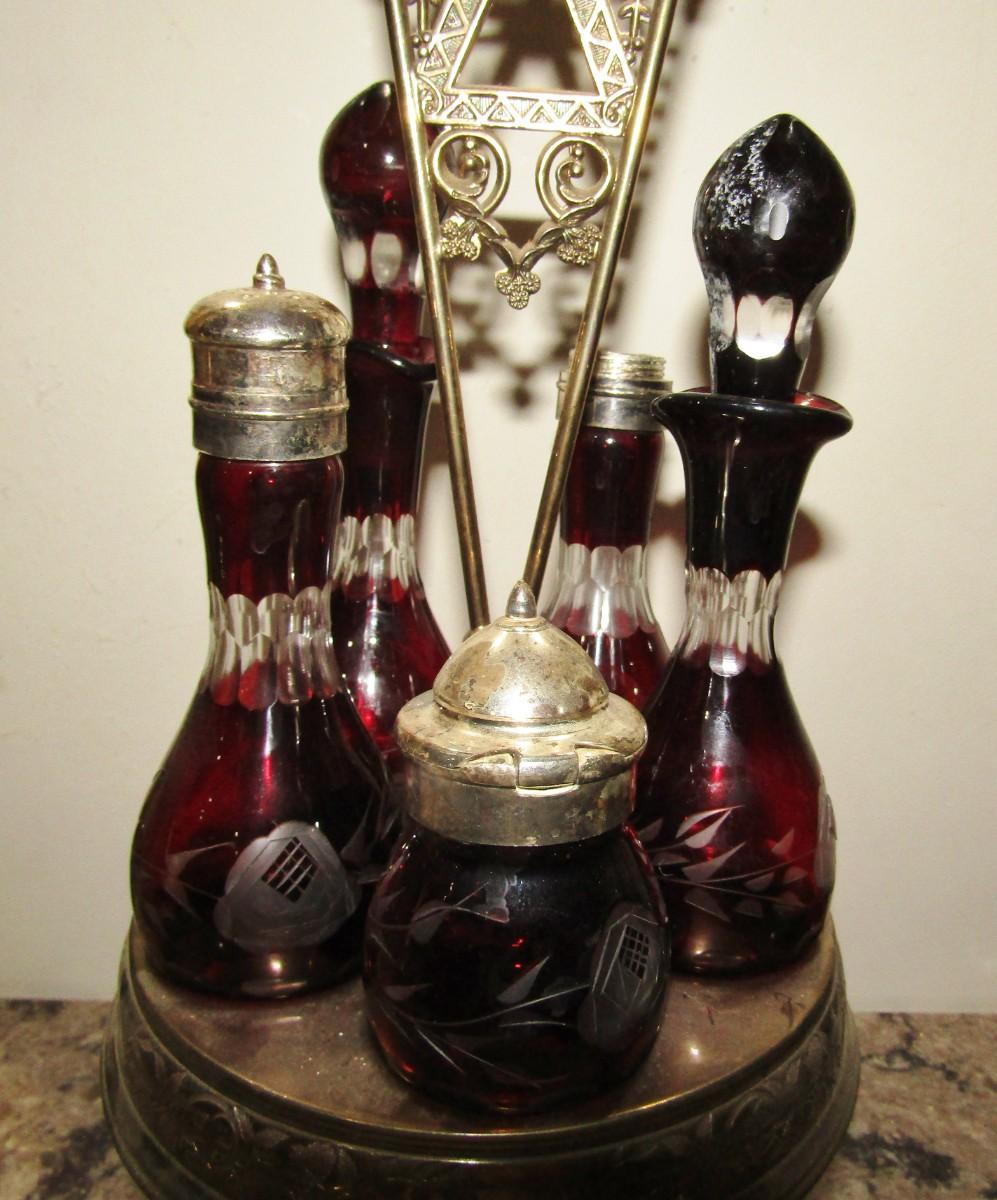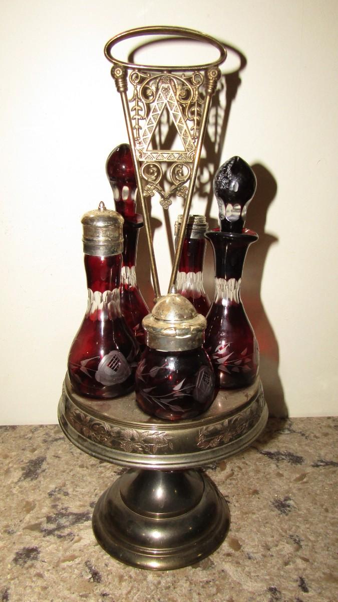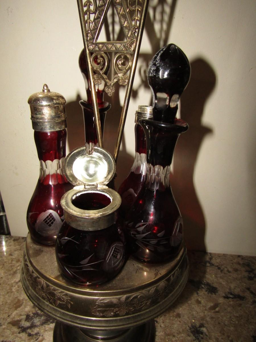 VICTORIAN ROTATING CONDIMENT CADDY WITH CRANBERRY GLASS CRUETS