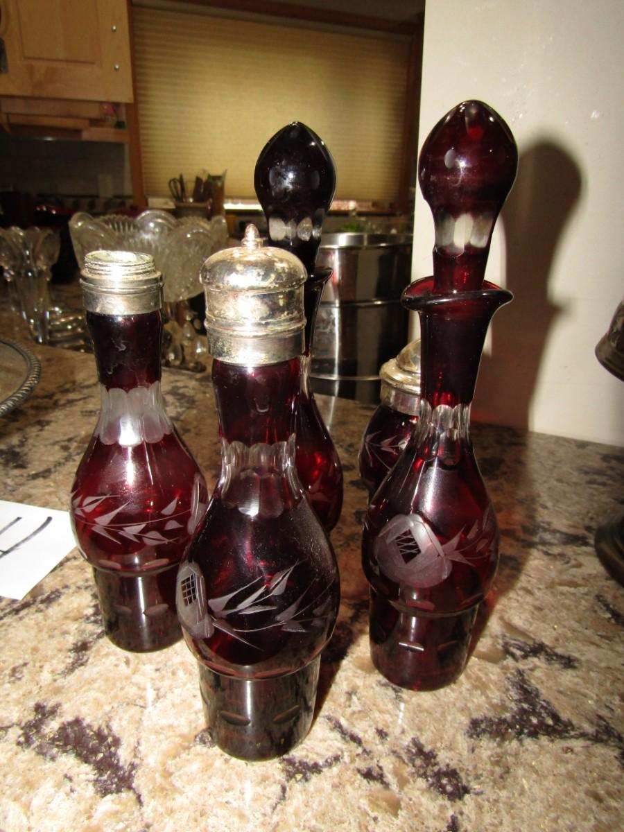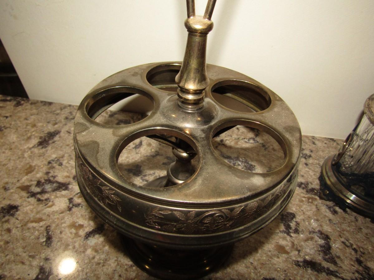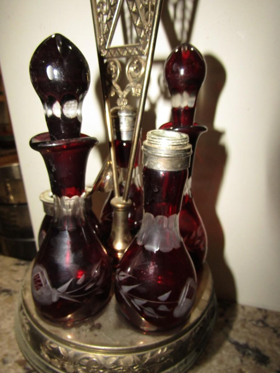 VICTORIAN ROTATING CONDIMENT CADDY WITH CRANBERRY GLASS CRUETS