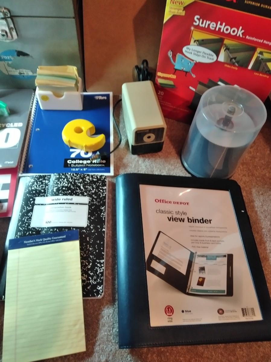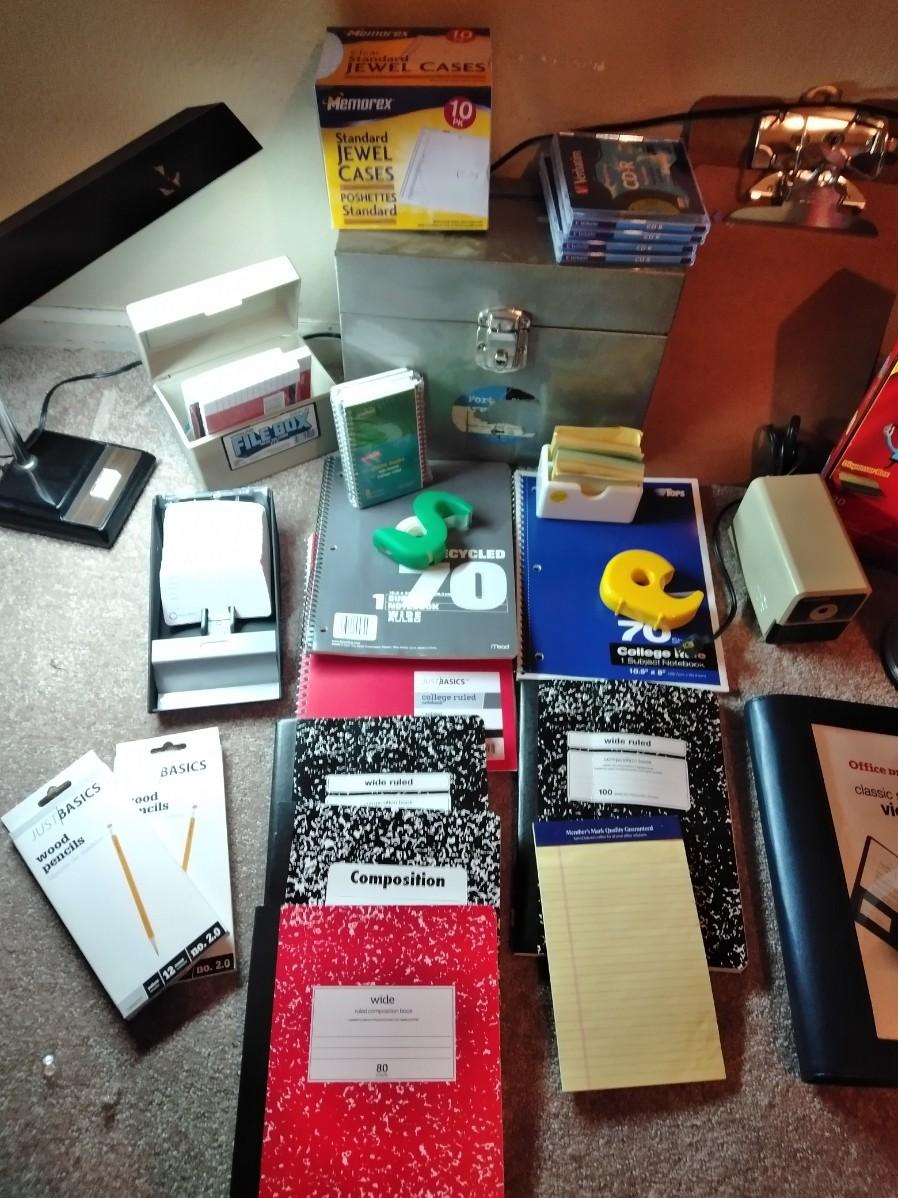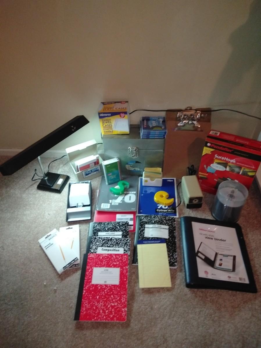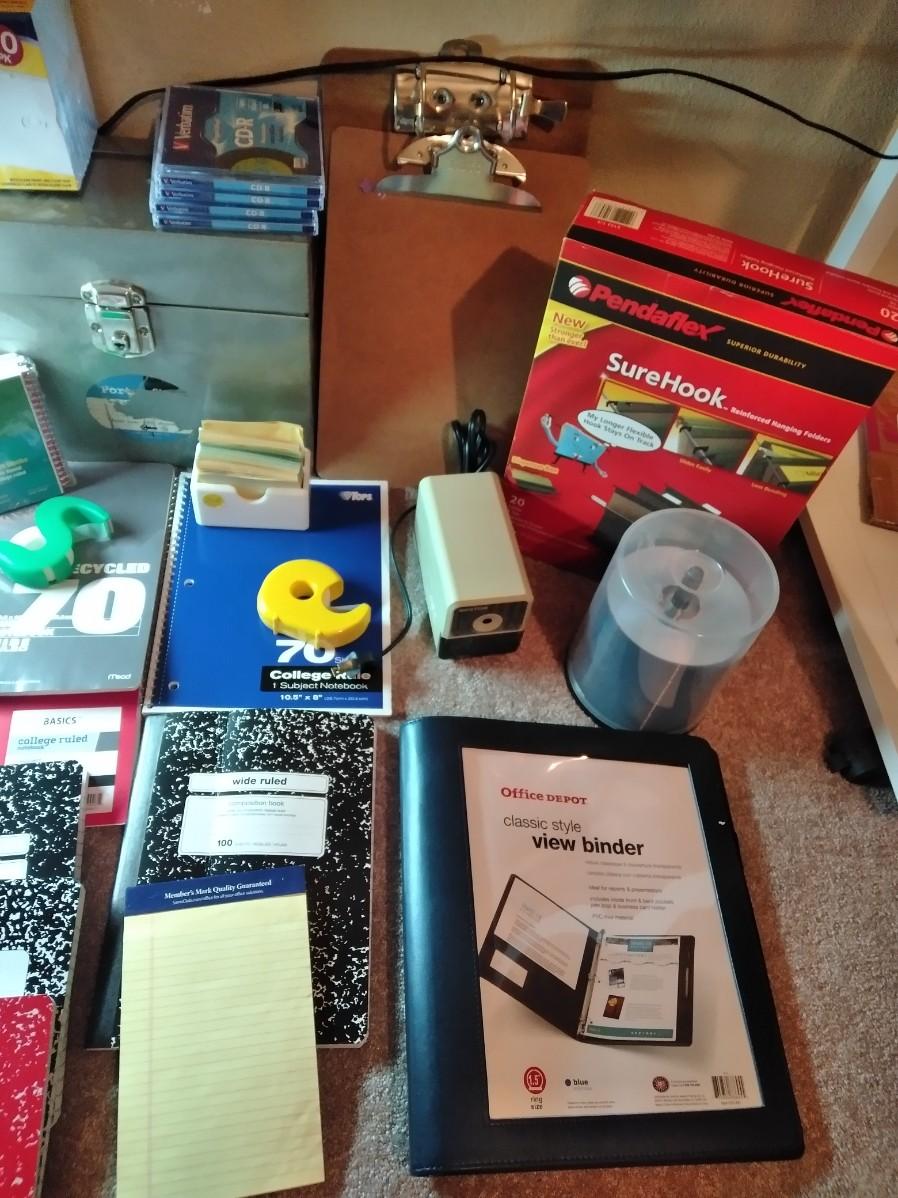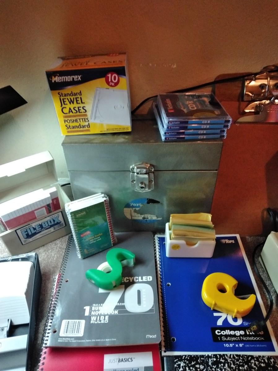 ELECTRIC PENCIL SHARPENER, NOTEBOOKS, METAL FILE BOX (no key) JEWEL CASES, AND BLANK DISCS, PLASTIC FILE BOX, PENCILS, TAPE, DESK LAMP, AND MORE