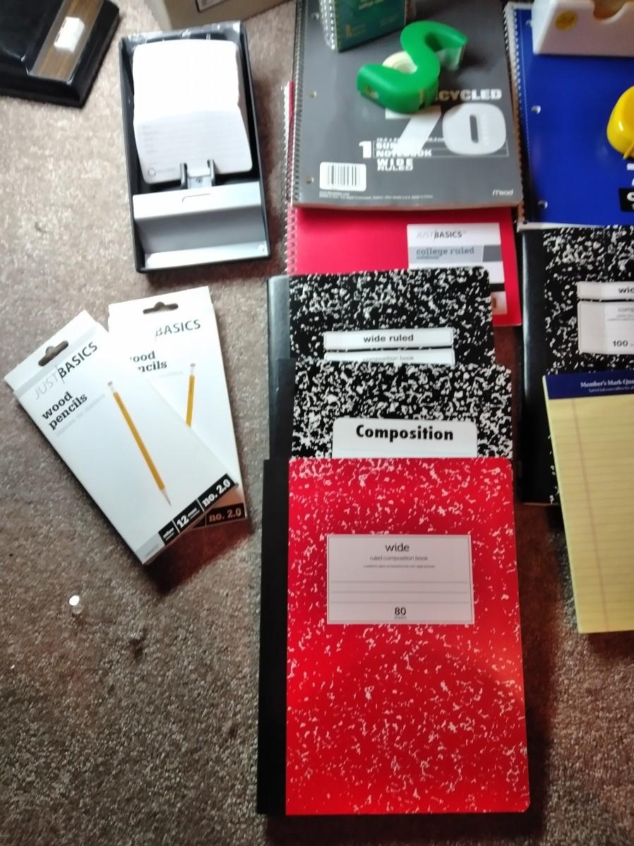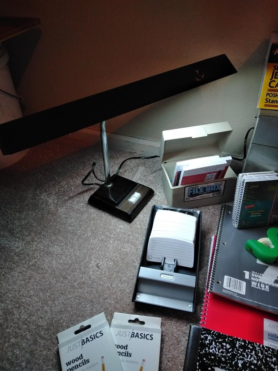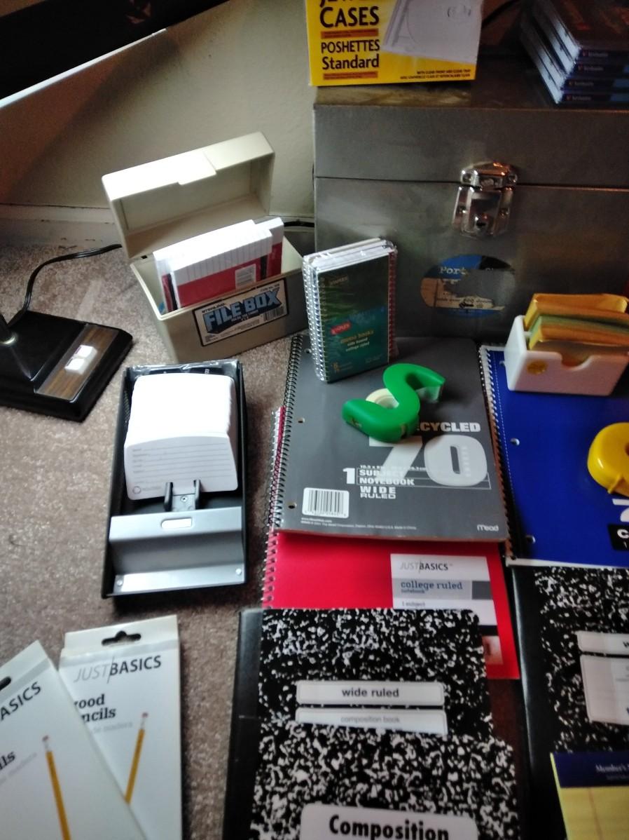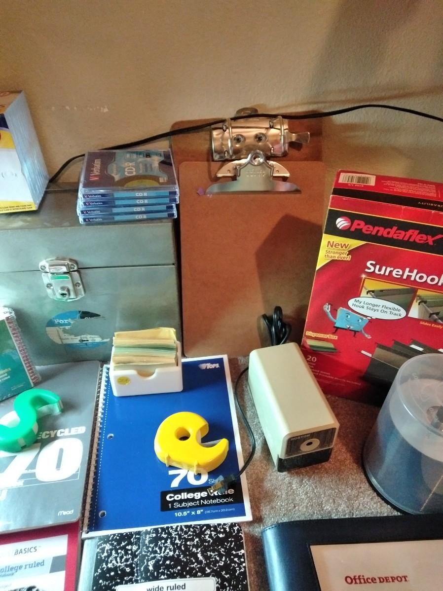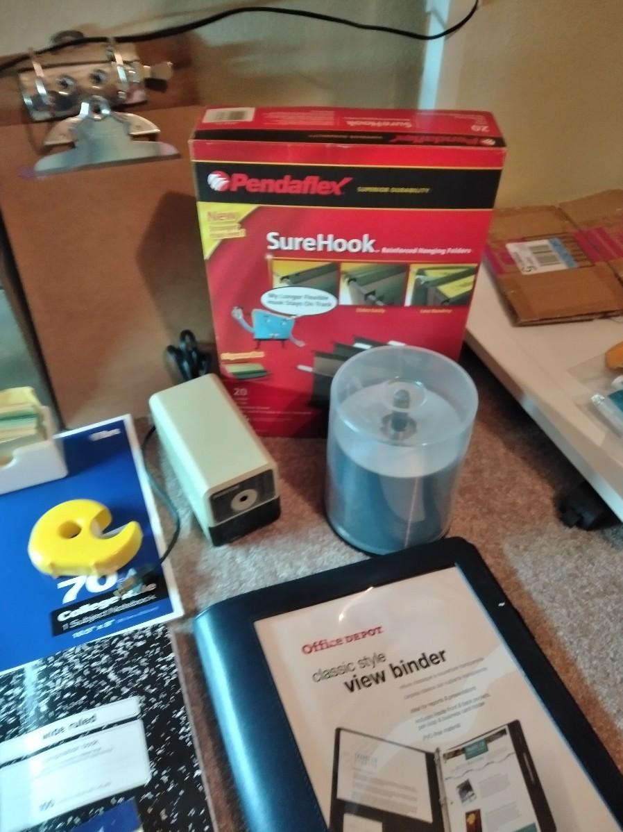 ELECTRIC PENCIL SHARPENER, NOTEBOOKS, METAL FILE BOX (no key) JEWEL CASES, AND BLANK DISCS, PLASTIC FILE BOX, PENCILS, TAPE, DESK LAMP, AND MORE