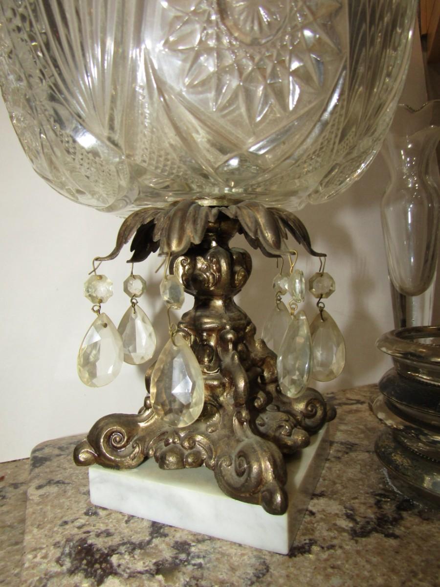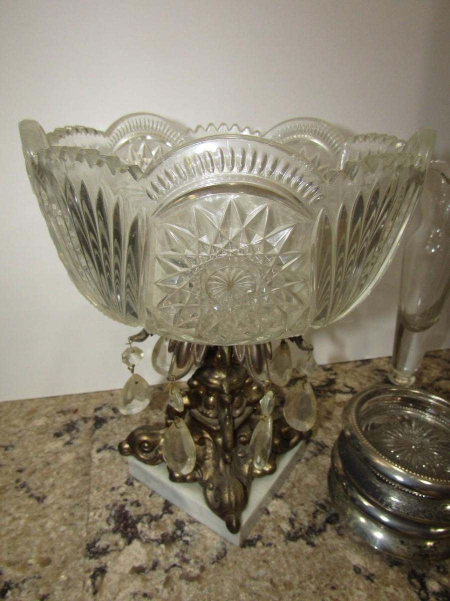 LEAD CRYSTAL DISPLAY BOWL WITH CRYSTAL ACCENTS RESTING ON A MARBLE BASE AND BRASS STEM