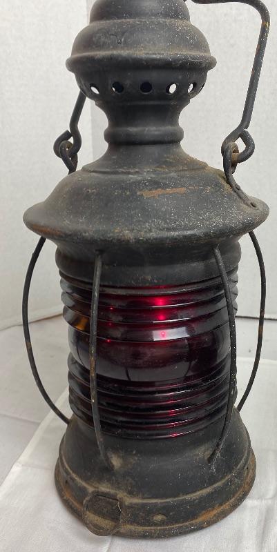 Antique black metal rail road red glass lantern with badger burner. Measures 15 inches high to the top of lantern 19 inches to the top of the handle
