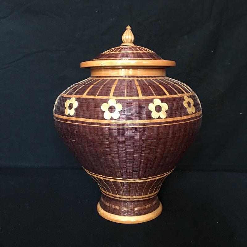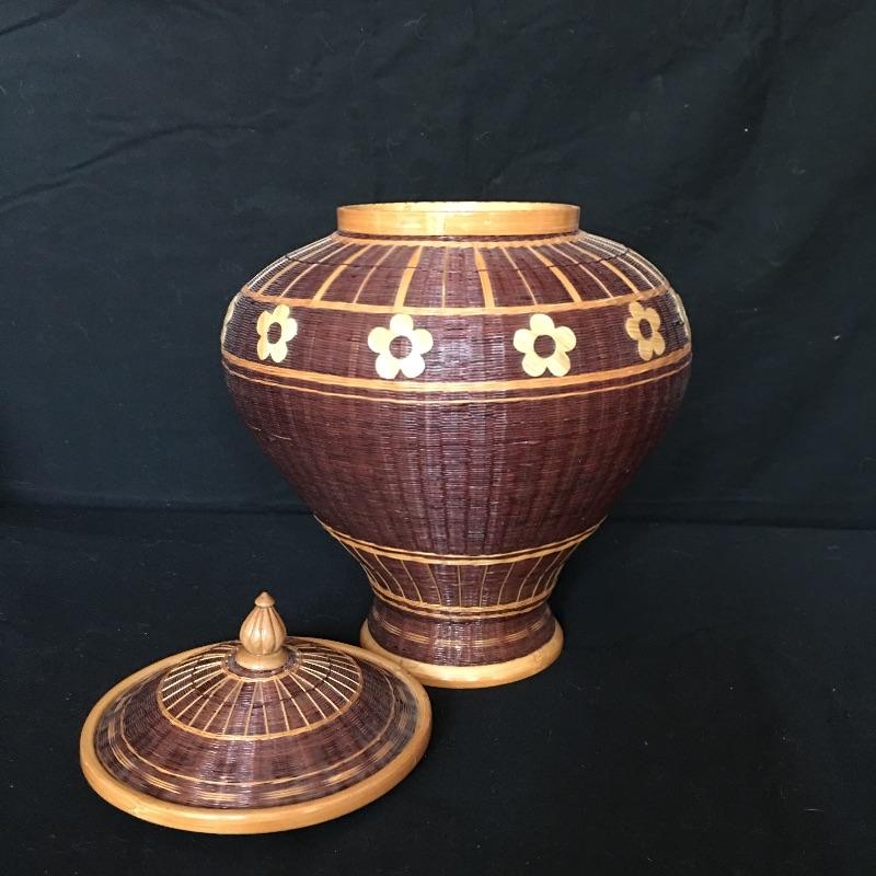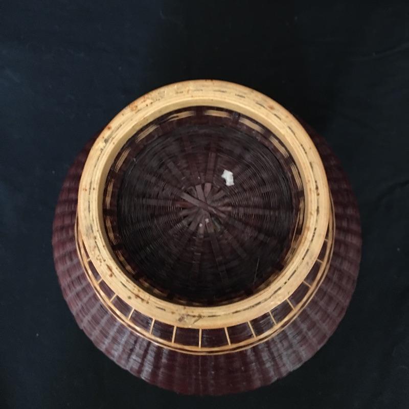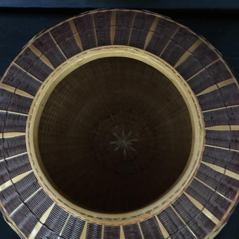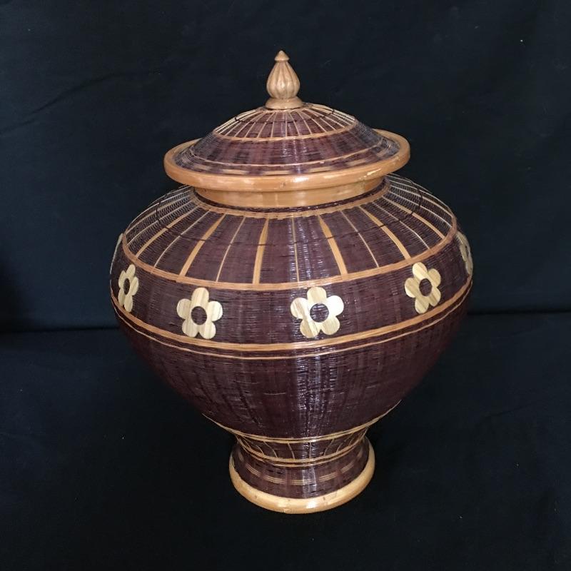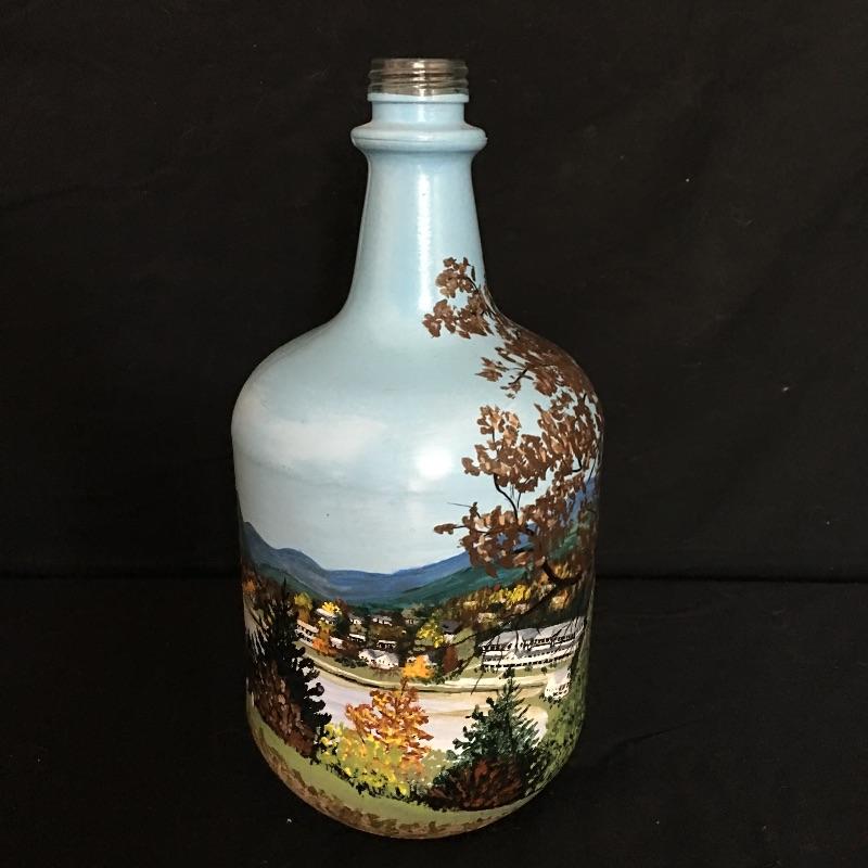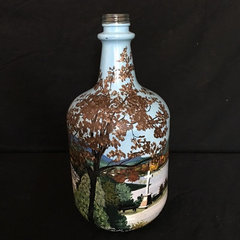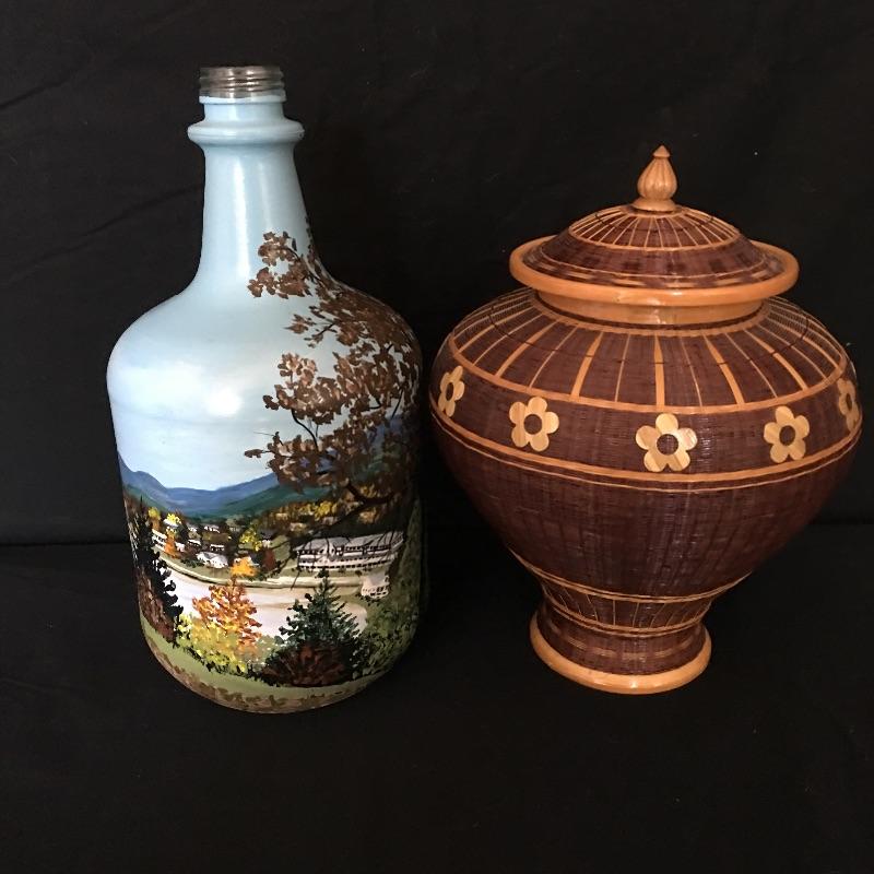 Stunning pine needle basket with flower design and a painted bottle with scenes of Lake Junaluska in Western North Carolina. Two very unique pieces that look like they both took a lot of talent to make. Painted bottle measures 12” tall and 6” D.