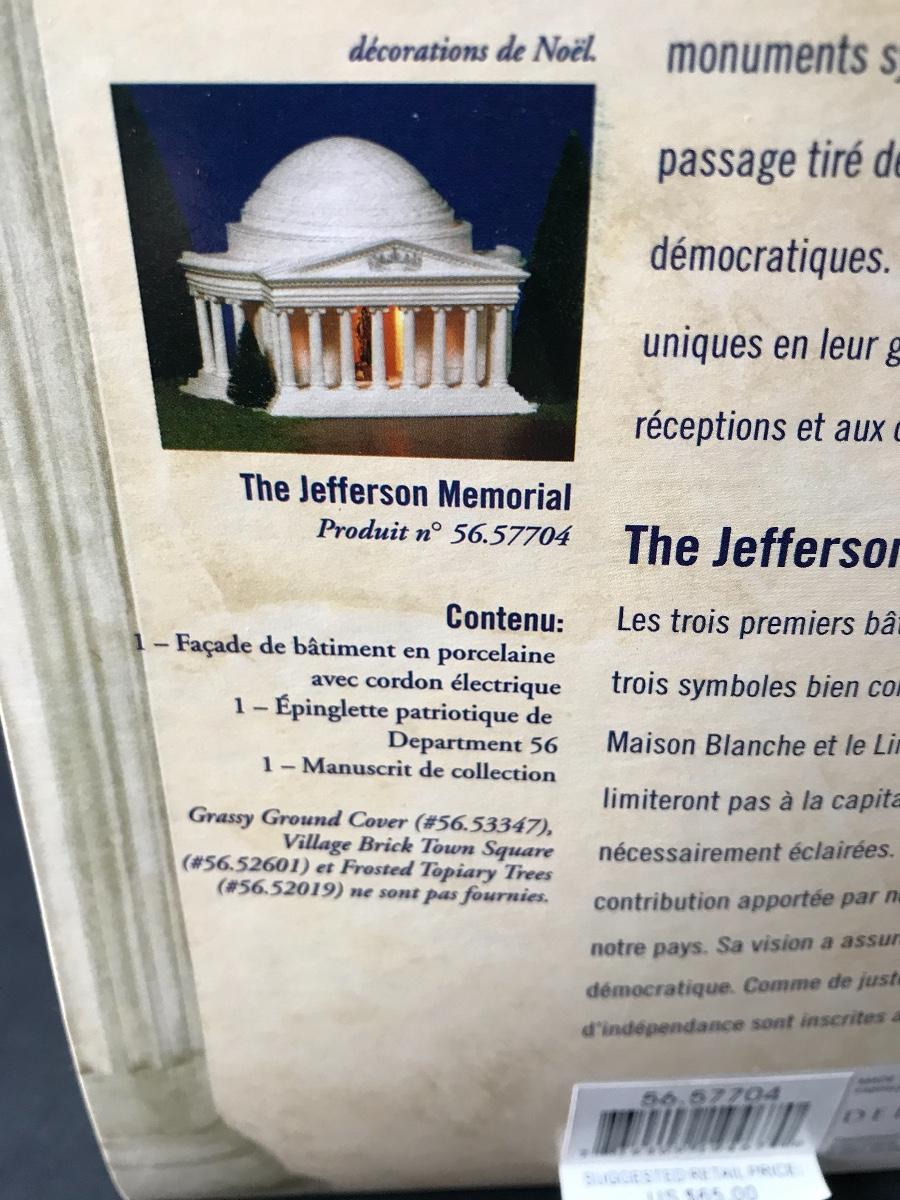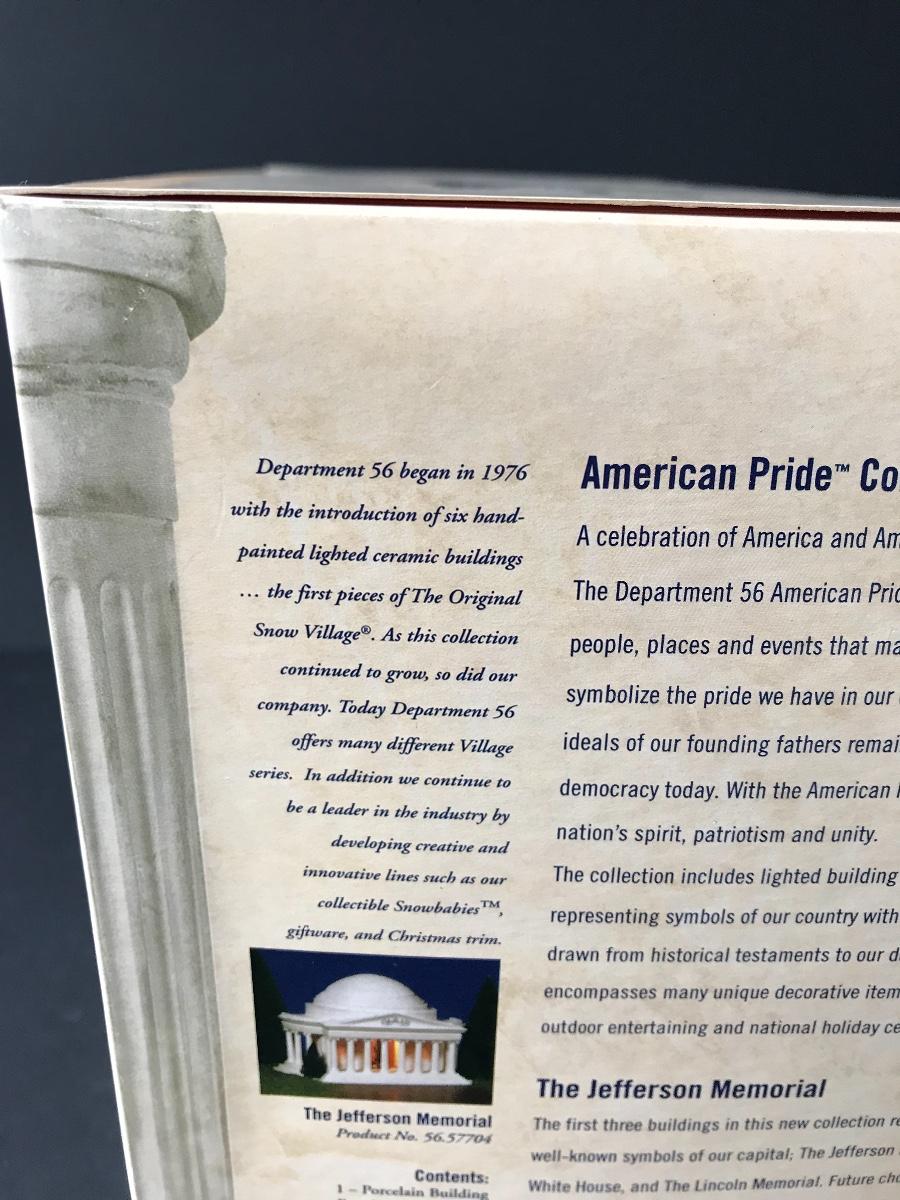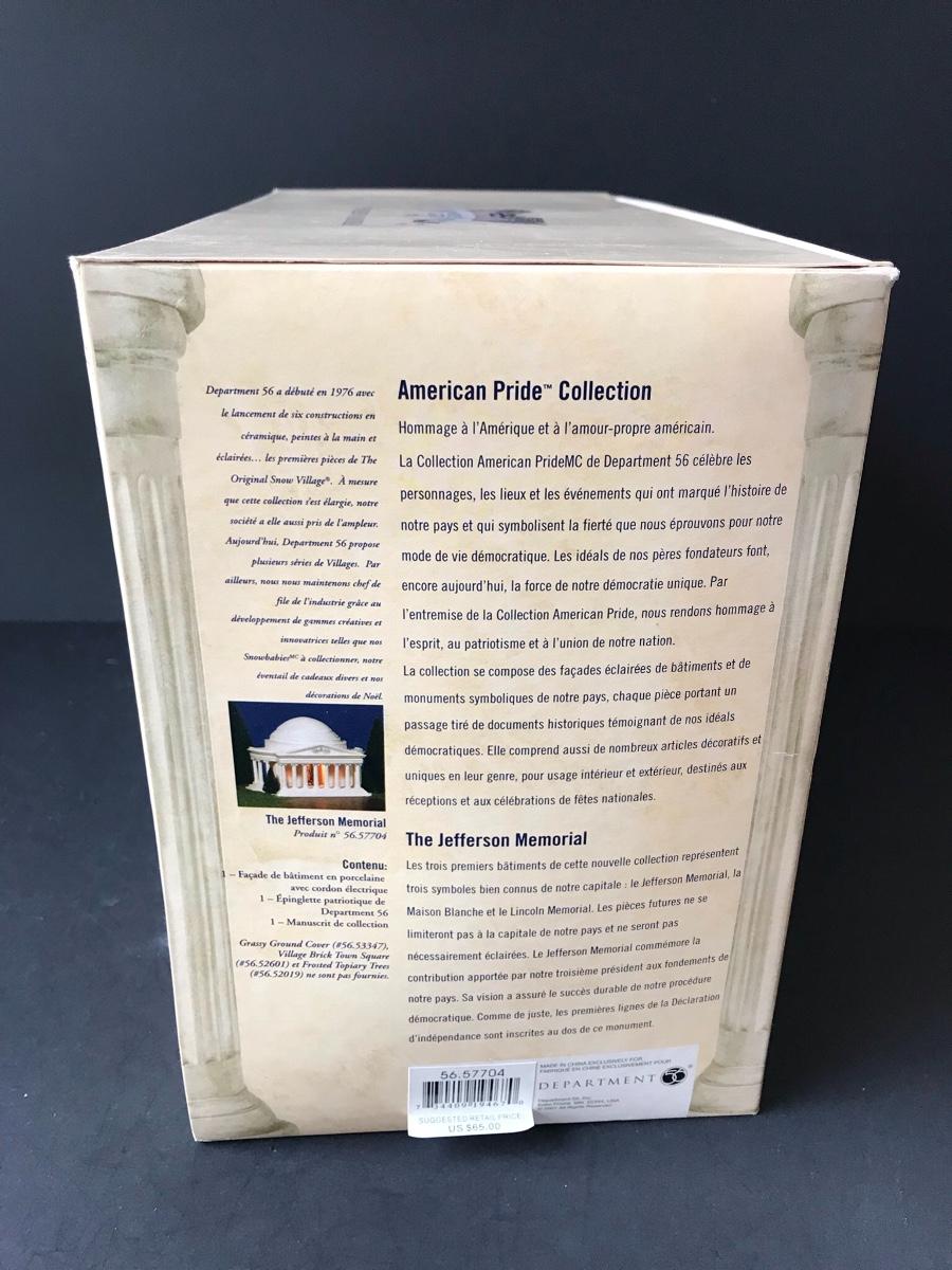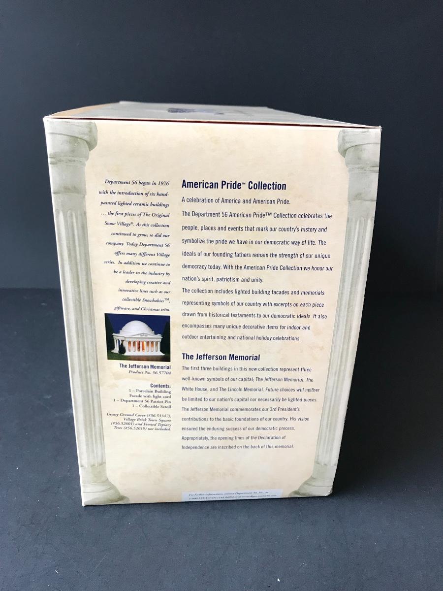 Jefferson Memorial - Department 56 - American Pride. All Holiday items in this auction are as-seen. The client collected a lot of holiday pieces and some are new in box, some were displayed once and come with original box, and some have been displayed and come with no box. They are all pre-owned in some fashion and have been stored in an attic or on shelf in library. Please see all pictures. The pictures show condition, measurements if taken, and what is included in the lot. Due to the large amount that we photograph and the time frame, we are not always able to take measurements. All items unless noted, are pre-owned and have been used. Thank you