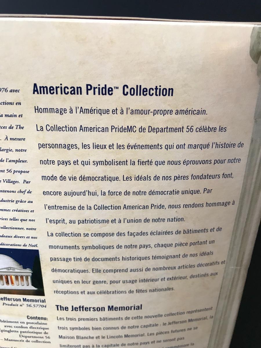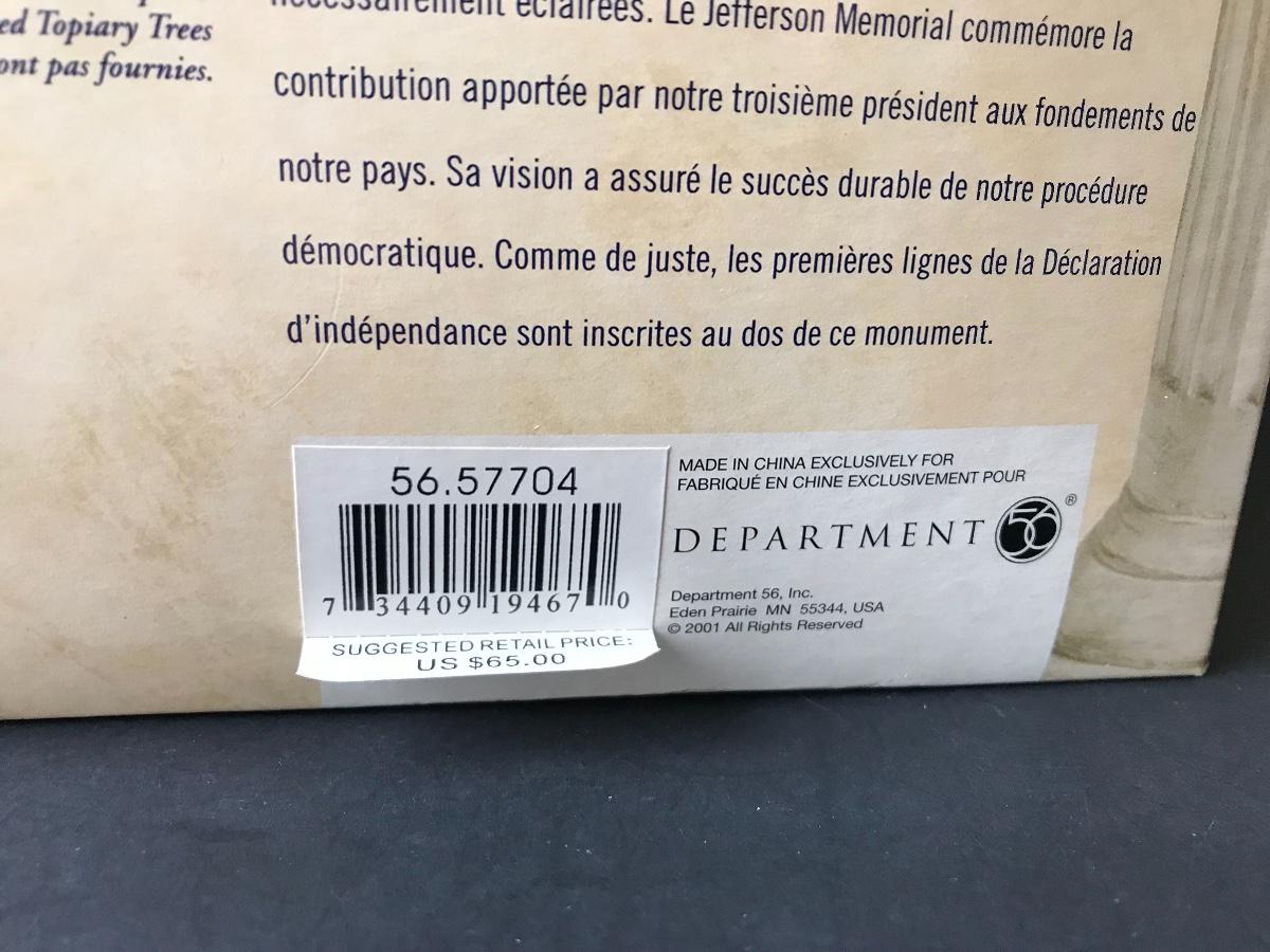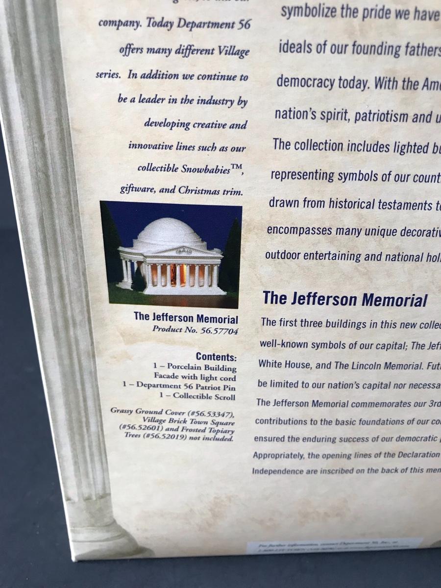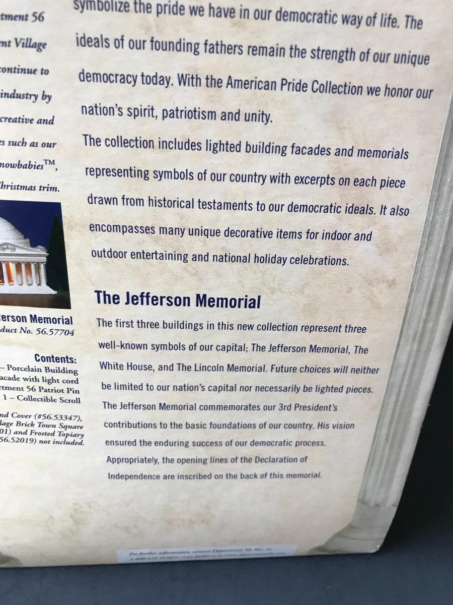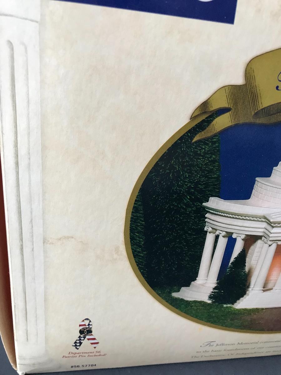Jefferson Memorial - Department 56 - American Pride. All Holiday items in this auction are as-seen. The client collected a lot of holiday pieces and some are new in box, some were displayed once and come with original box, and some have been displayed and come with no box. They are all pre-owned in some fashion and have been stored in an attic or on shelf in library. Please see all pictures. The pictures show condition, measurements if taken, and what is included in the lot. Due to the large amount that we photograph and the time frame, we are not always able to take measurements. All items unless noted, are pre-owned and have been used. Thank you