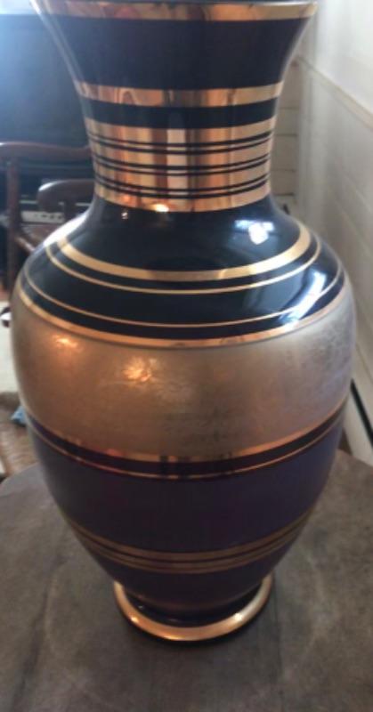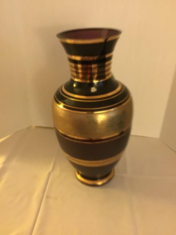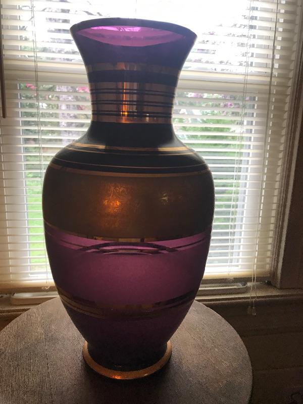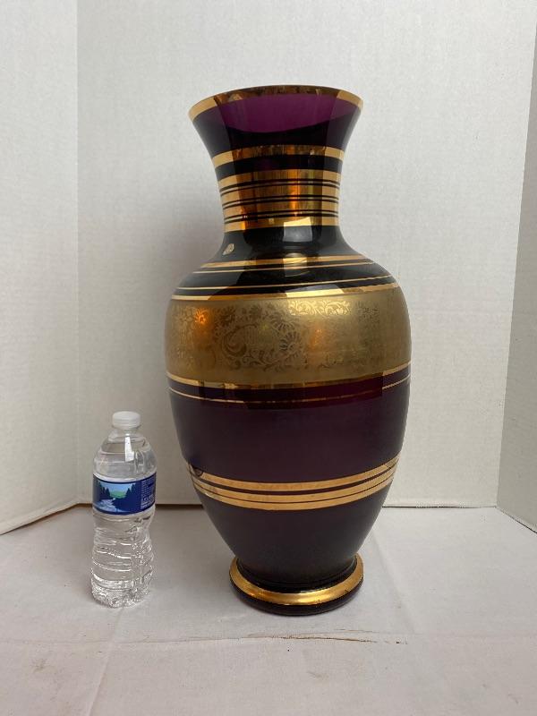 ANTIQUE AMETHYST AND GOLD VASE, MADE IN CZECHOSLOVAKIA measures 20” high