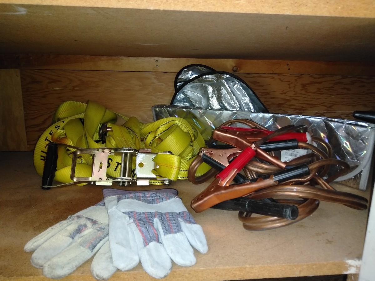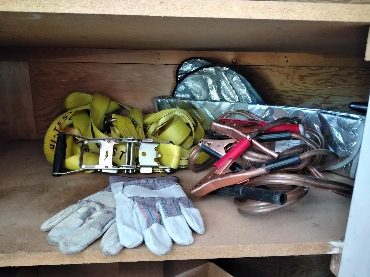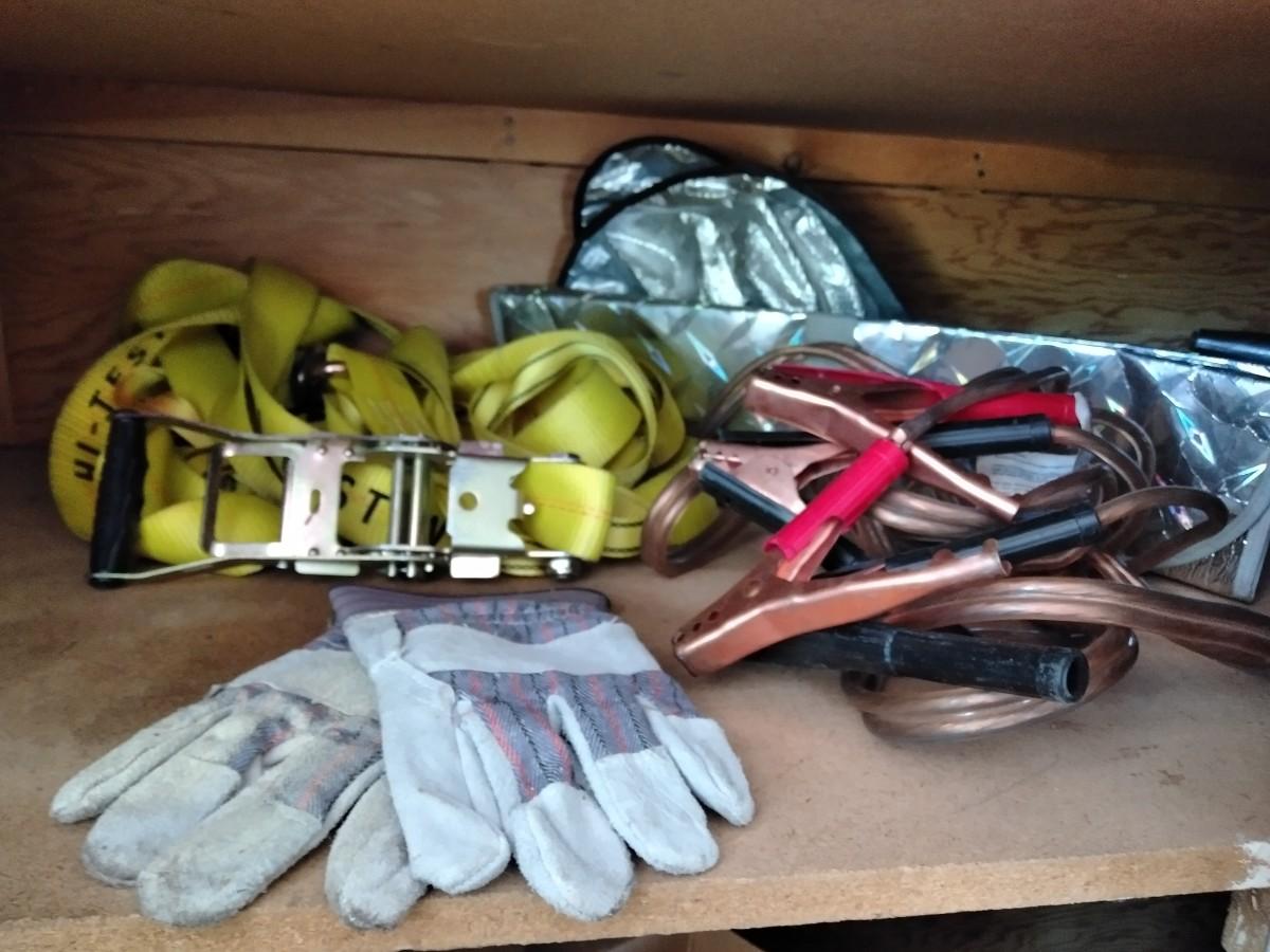 NICE SET OF JUMPER CABLES, PAIR OF GLOVES, HEAVY DUTY RACHET STRAP, AND MORE