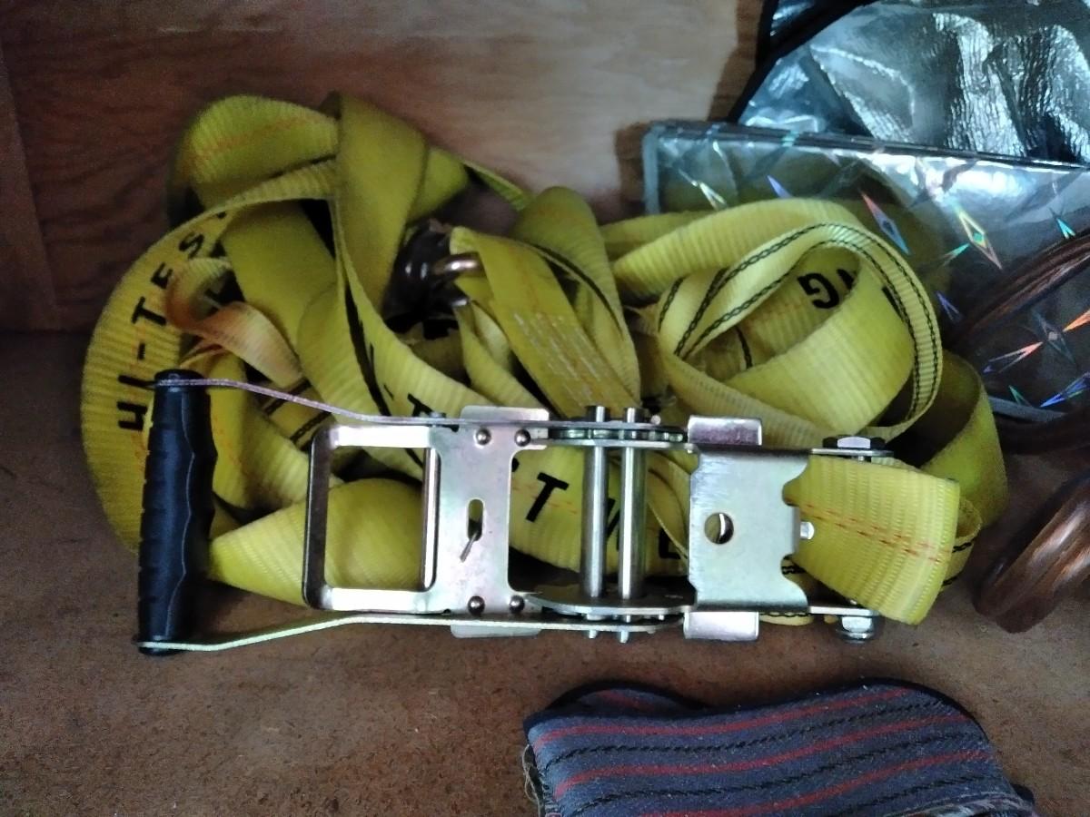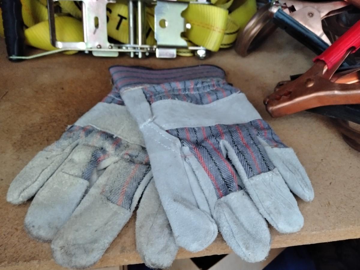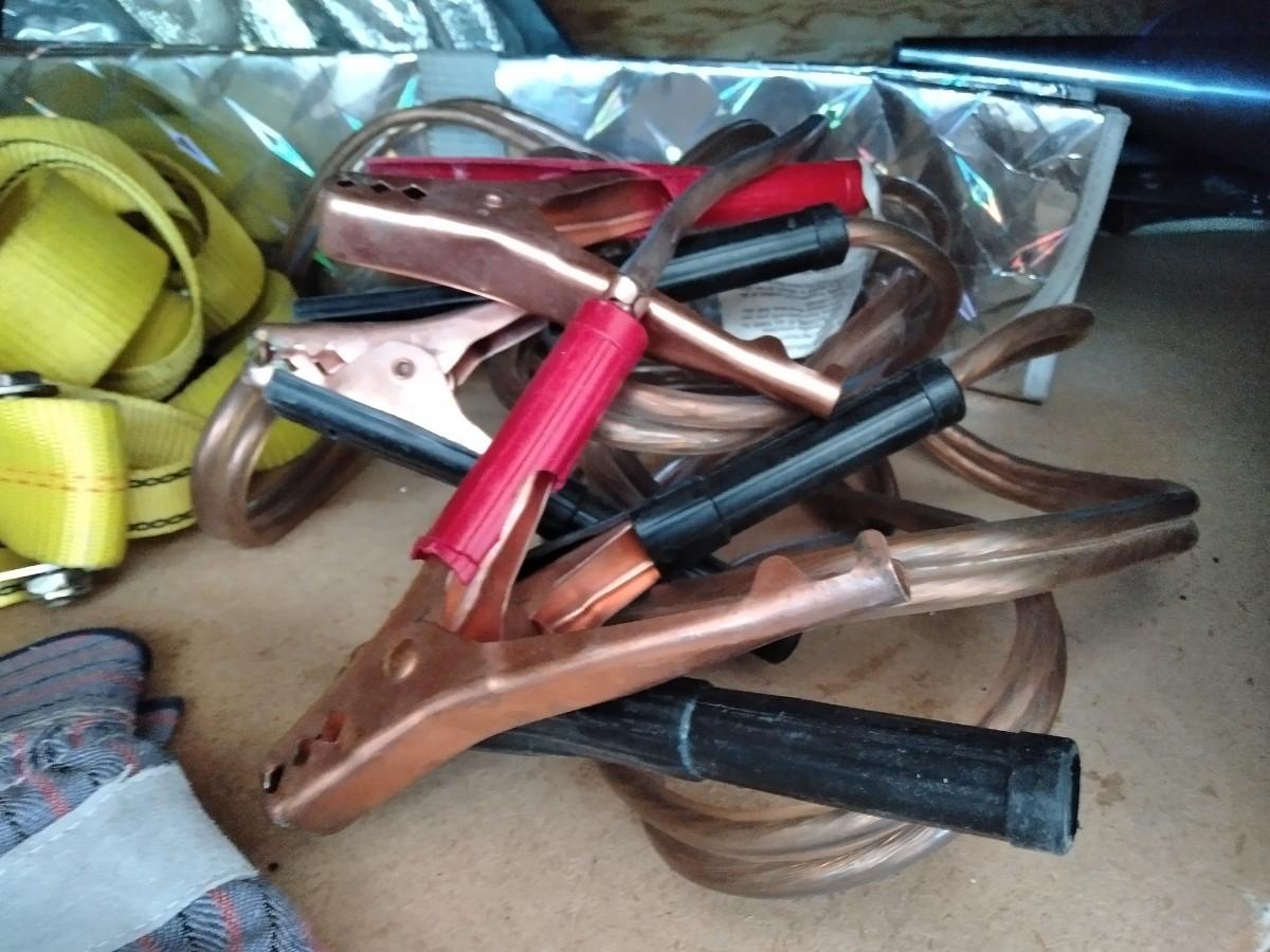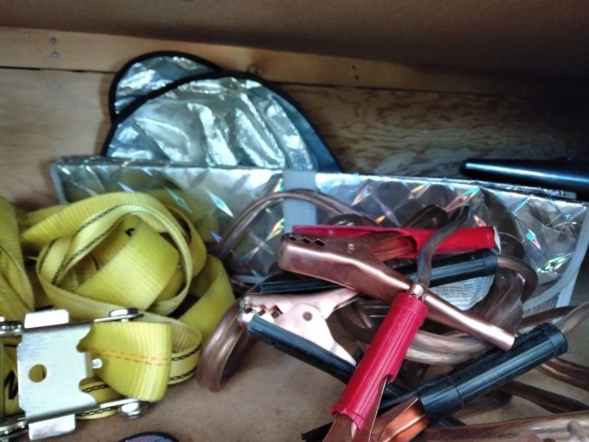 NICE SET OF JUMPER CABLES, PAIR OF GLOVES, HEAVY DUTY RACHET STRAP, AND MORE