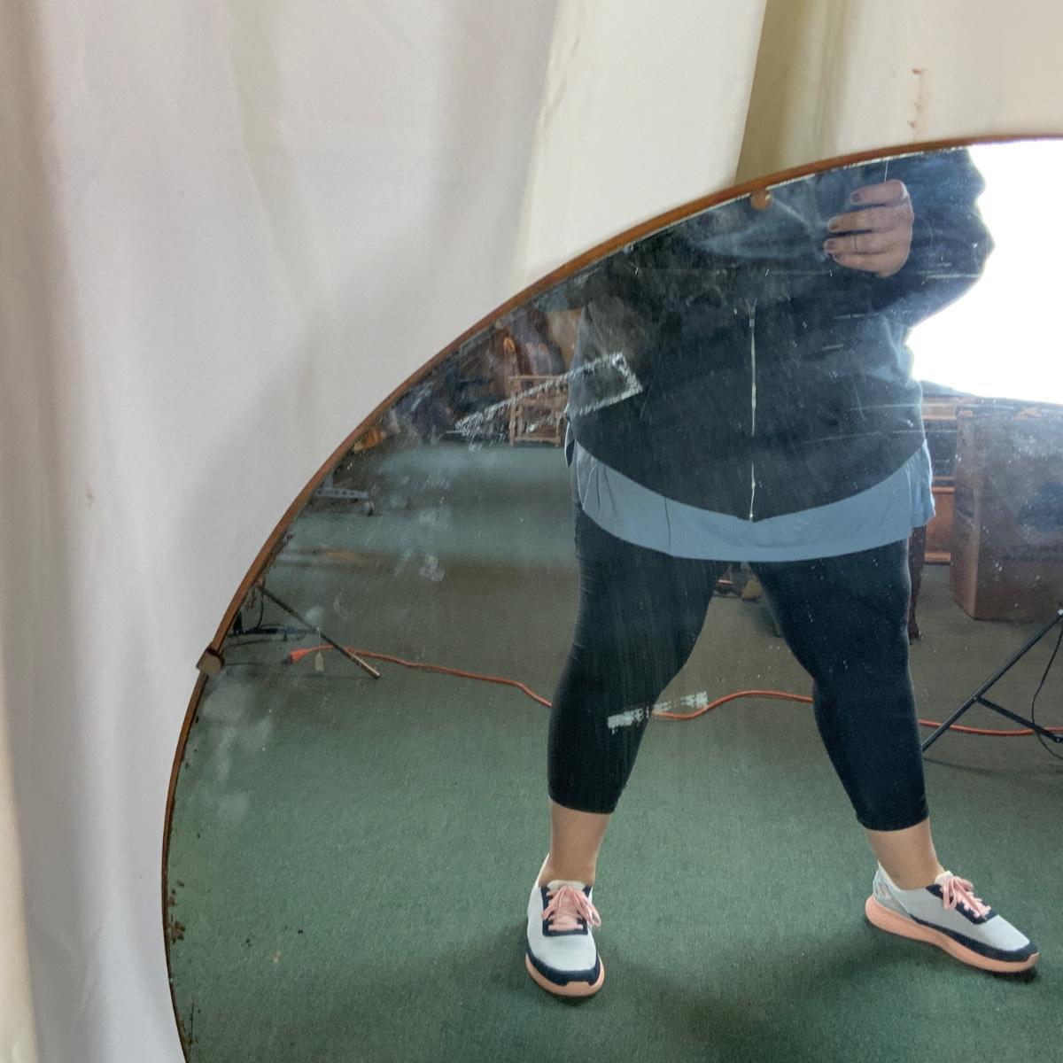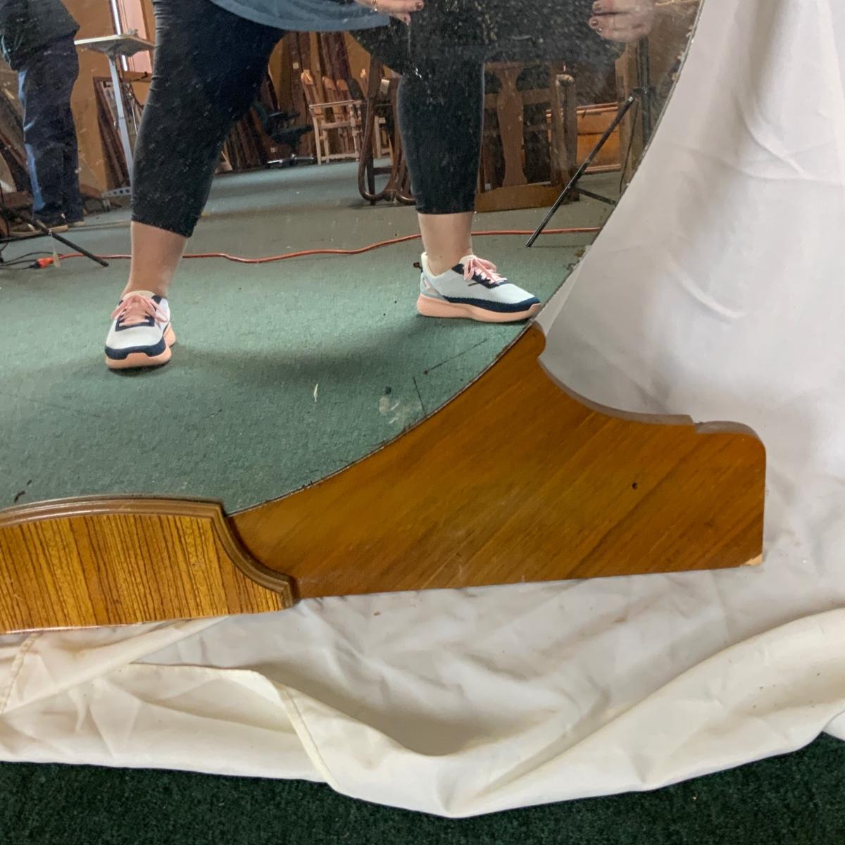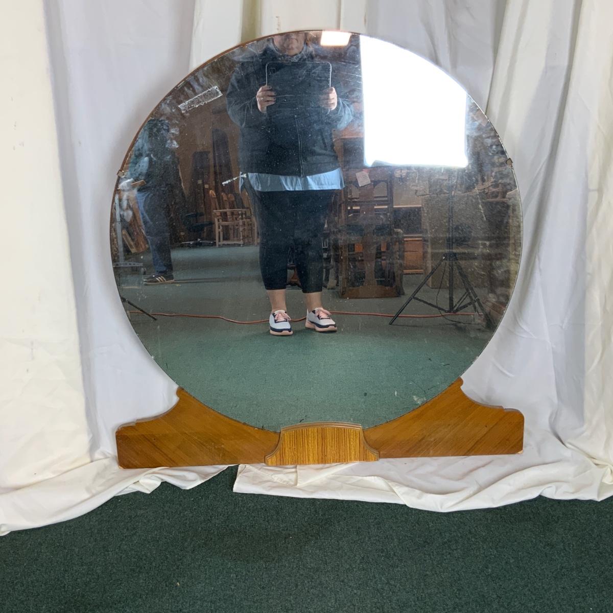 Large Round Art Deco Vanity Mirror. Attractive mirror for an attractive you! //::\\ Please see photos for details and condition. No attempt has been made to hide any imperfections. All items listed in this auction are warehouse items, and need to be cleaned. A majority of the items need restoration as well. All items are sold AS IS and WITHOUT GUARANTEE. If you are uncertain about an item, DO NOT BID. Due to the nature of this online auction in-person inspection is HIGHLY recommended. All Sales are FINAL. Pick Up Times are FIRM. Please confirm with your own schedule that you can pick up in the scheduled times listed in the Terms and Conditions. Any questions please message the auctioneer. DO NOT Contact The Harp Gallery.