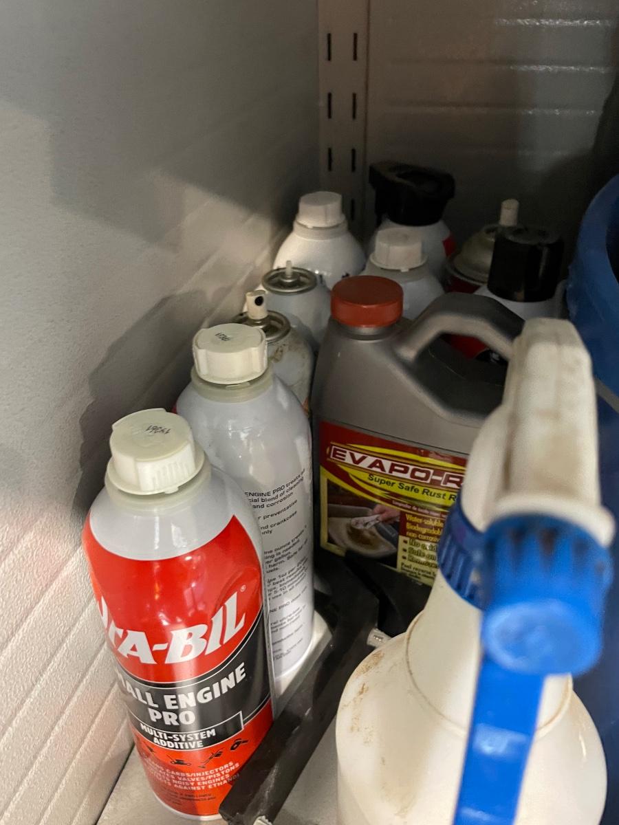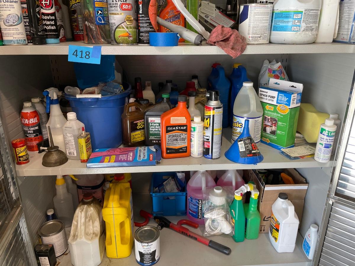 Lot 419 second shelf of metal cabinet with automotive chemicals