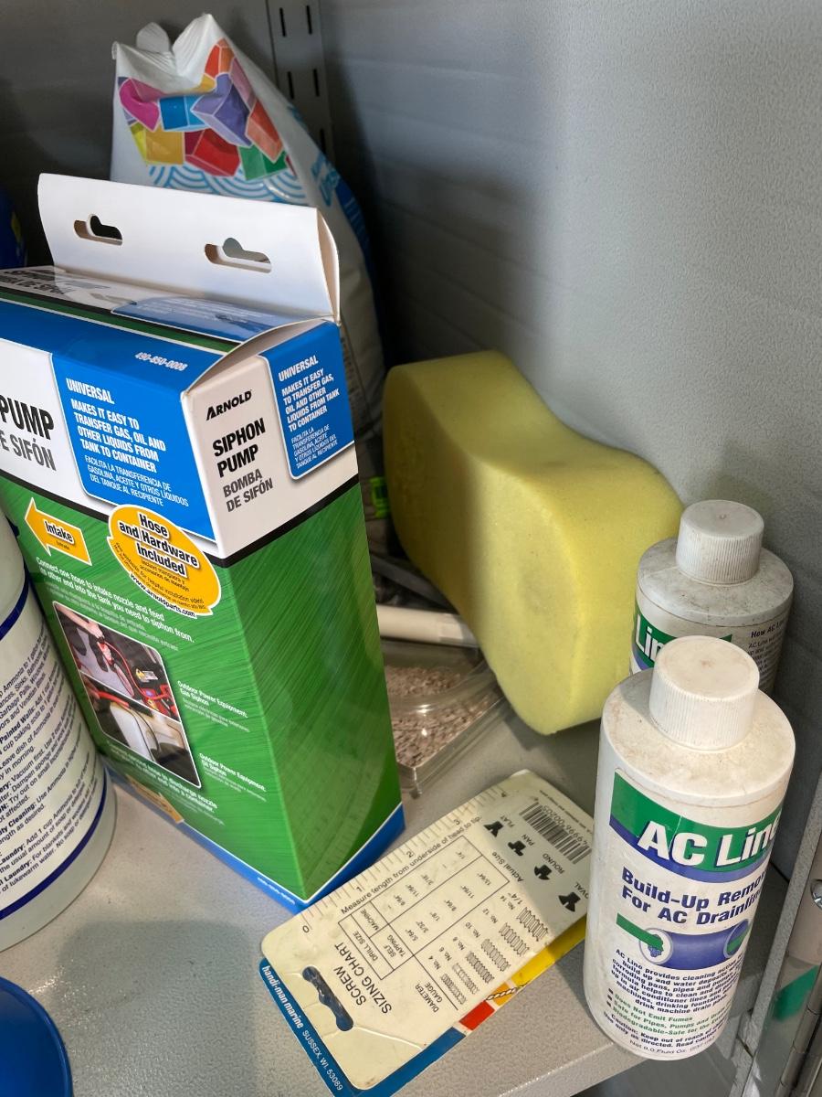 second shelf of metal cabinet with automotive