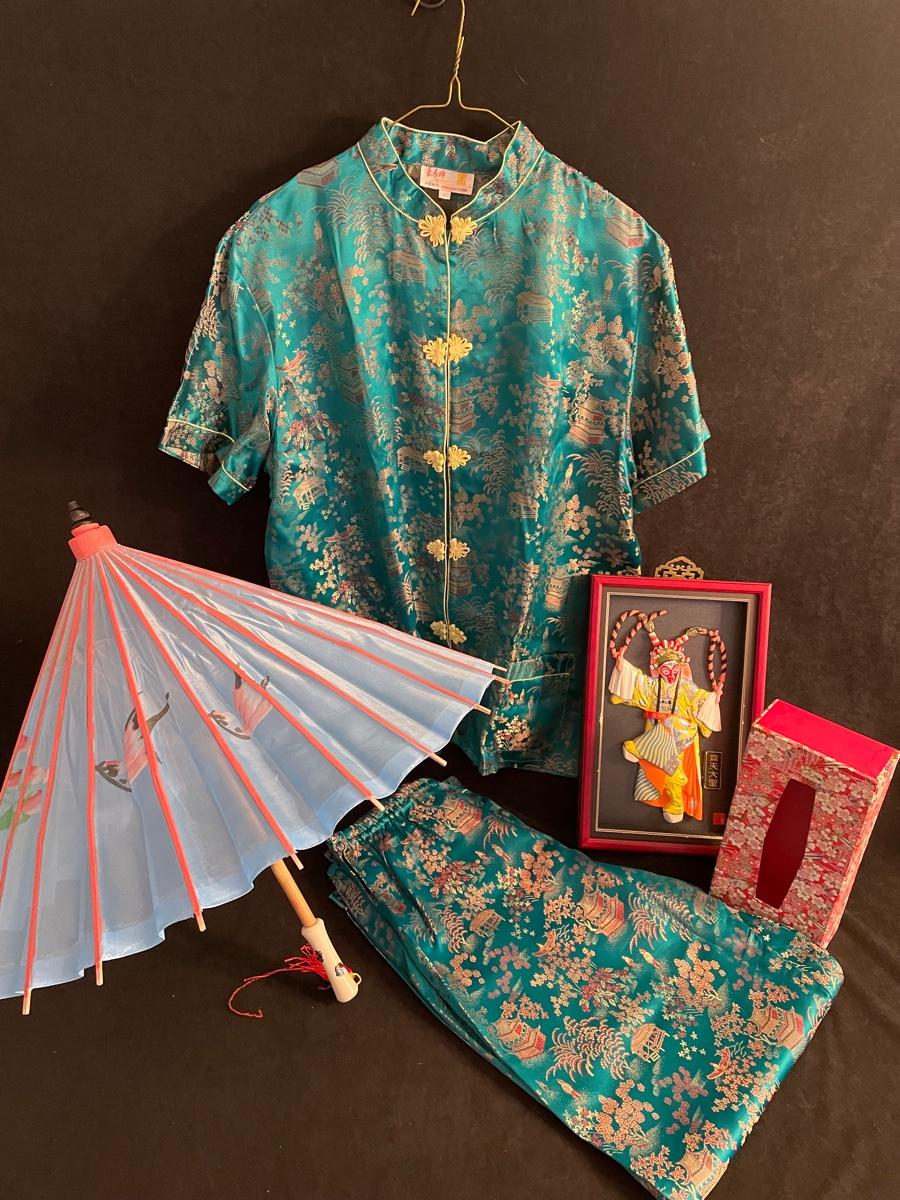 Lot 419  Vintage Hangzhou Pajama Set, Parasol, Beijing Facial Make-up Art and Floral Tissue Box Holder