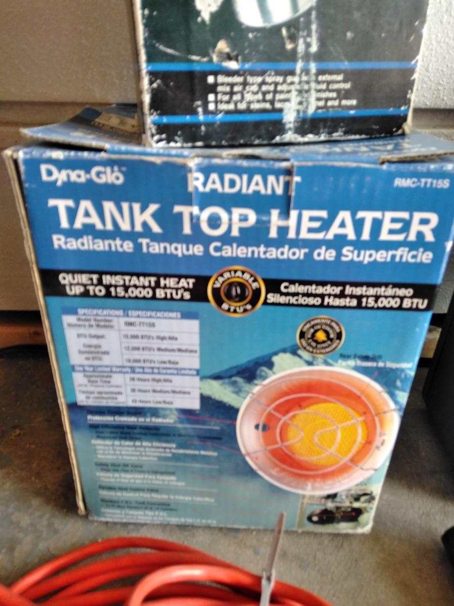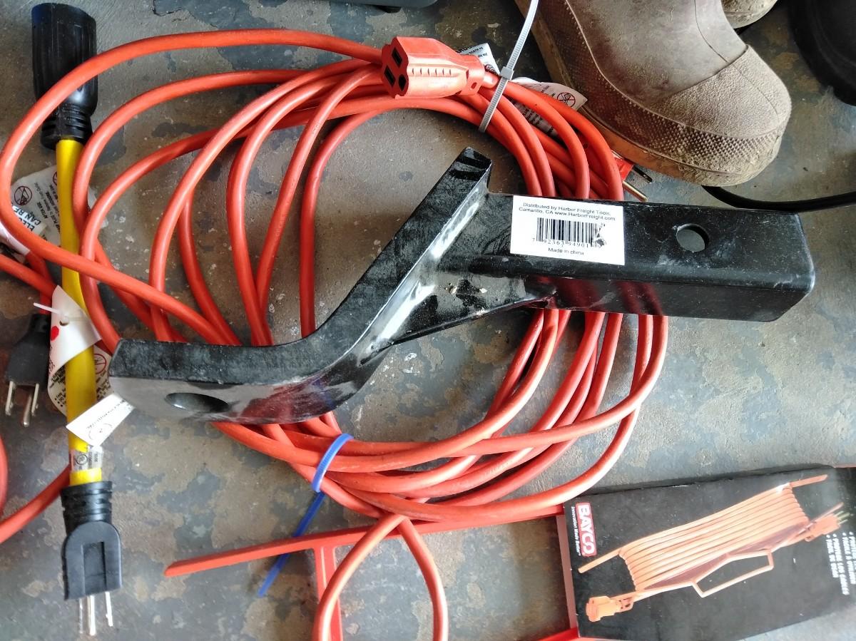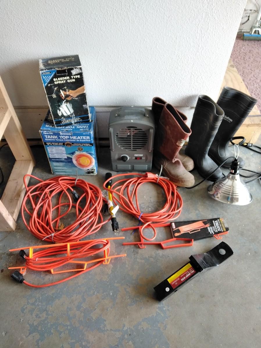 RECIEVER HITCH, TANK TOP HEATER, SPACE HEATER, EXTENSION CORDS, HEAT LAMP WITH BULB, AND TWO PAIR OF IRRIGATION BOOTS.