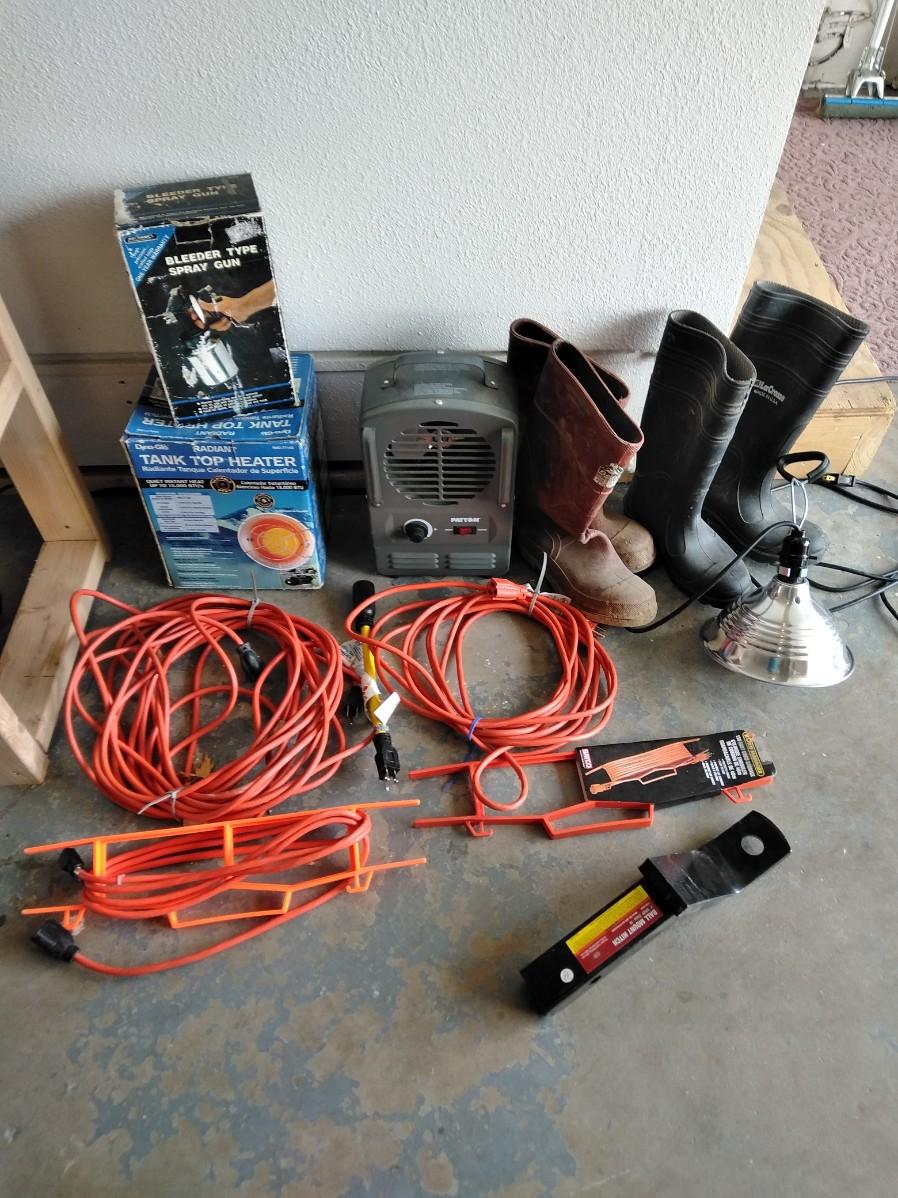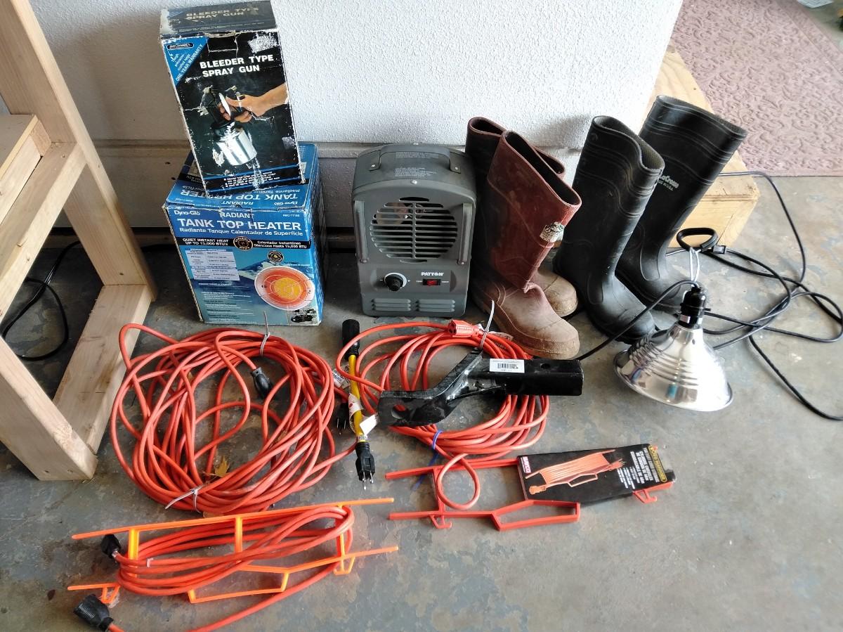 LOT 419 HEATERS, EXTENSION CORDS, HEAT LAMP, IRRIGATION BOOTS FARM LOT