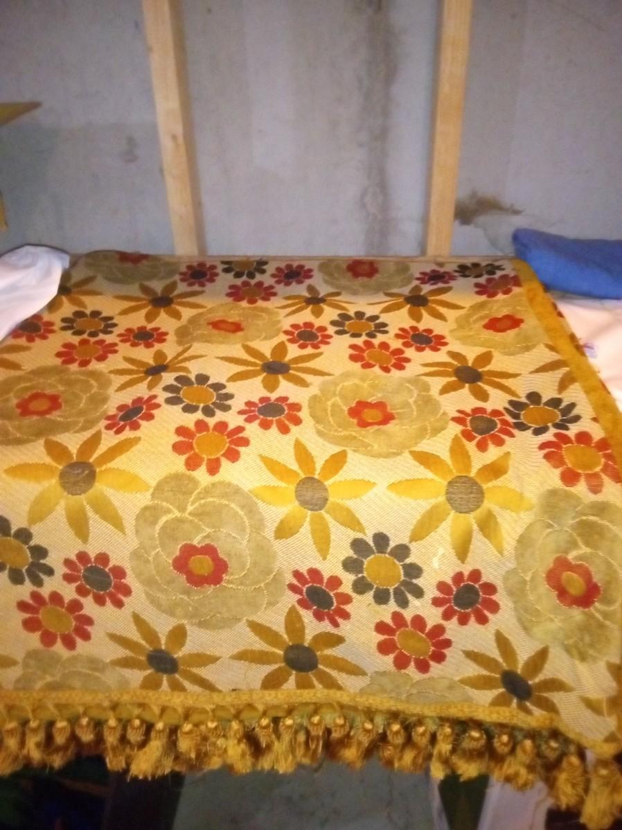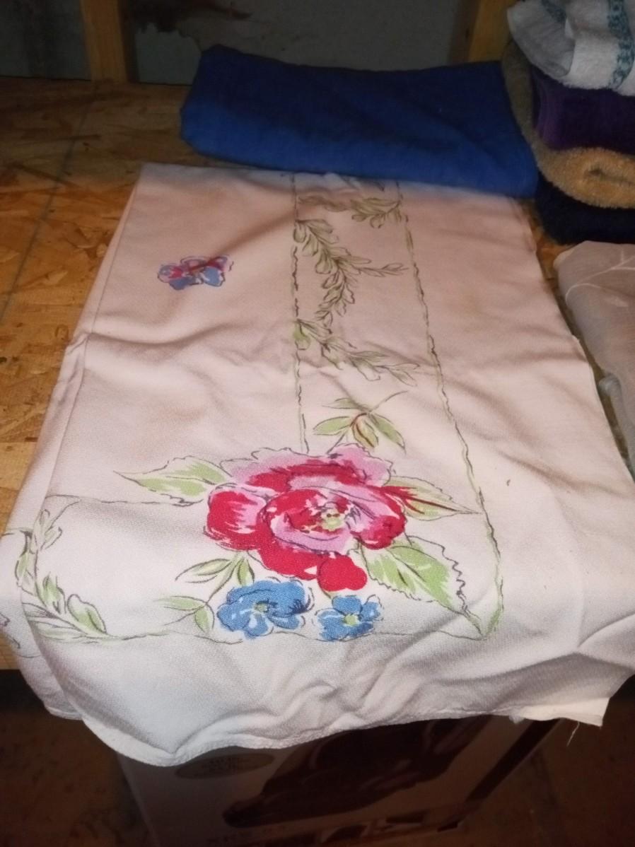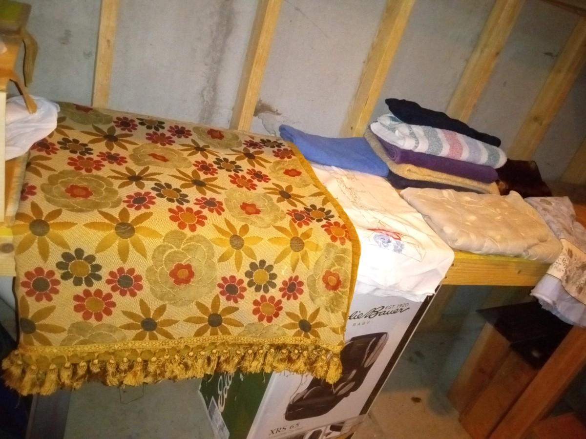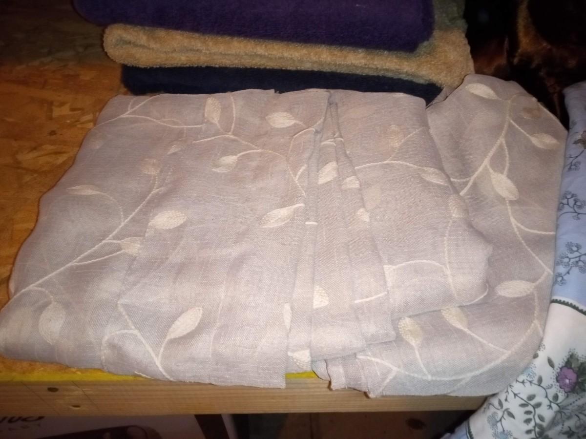VERY THICK THROW BLANKET WITH TASSELS, VINTAGE TABLECLOTH, SATIN TWIN FLAT SHEET AND 2 PILLOW CASES, BATH TOWELS, 2 LONG CURTAIN PANELS